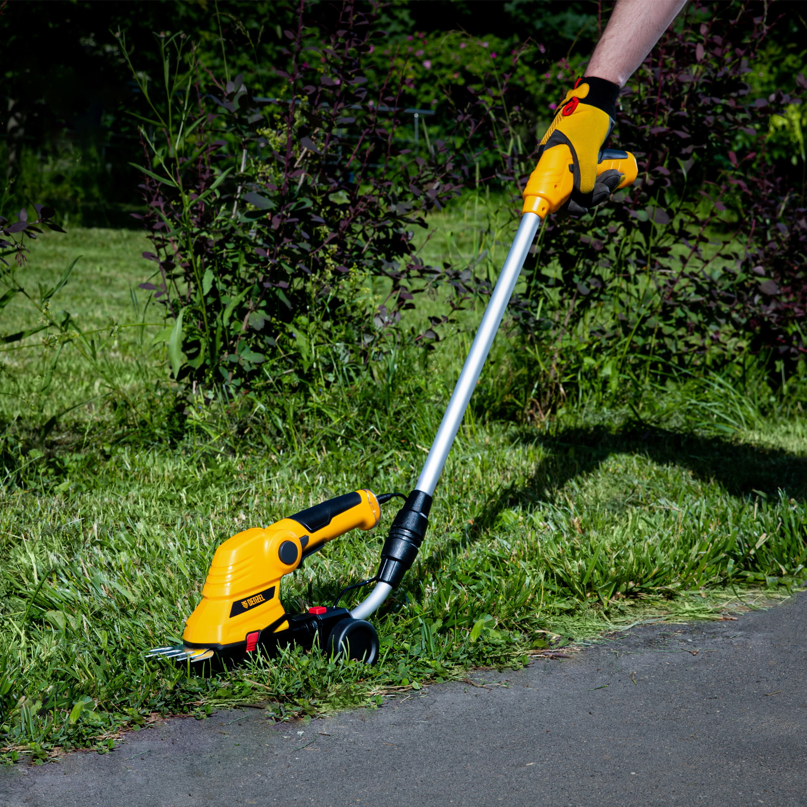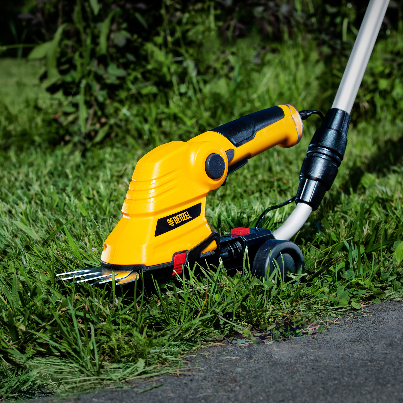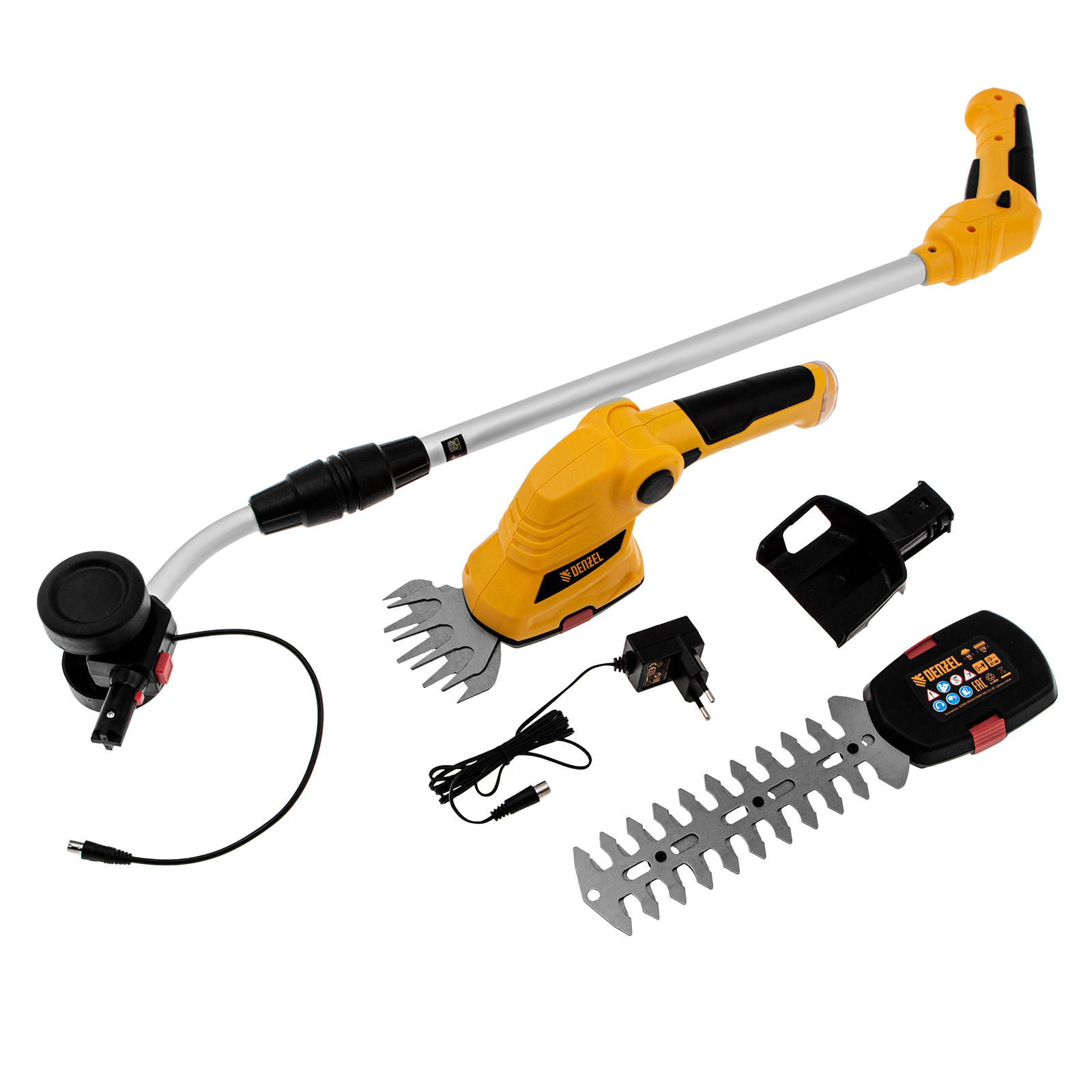 Аккумуляторные ножницы-кусторез Denzel G801E 968157 с телескопической штангой, с Li-Ion батареей емкостью 1,5 Ач и напряжением 7,2 В, используются для ухода за садовым участком. Поставляются с двумя насадками: для подрезания газонной травы и для обрезки кустов и тонких веток деревьев. Небольшой вес 1,1 кг и съемная штанга с колесным блоком обеспечивают комфортное использование ножниц-кустореза.