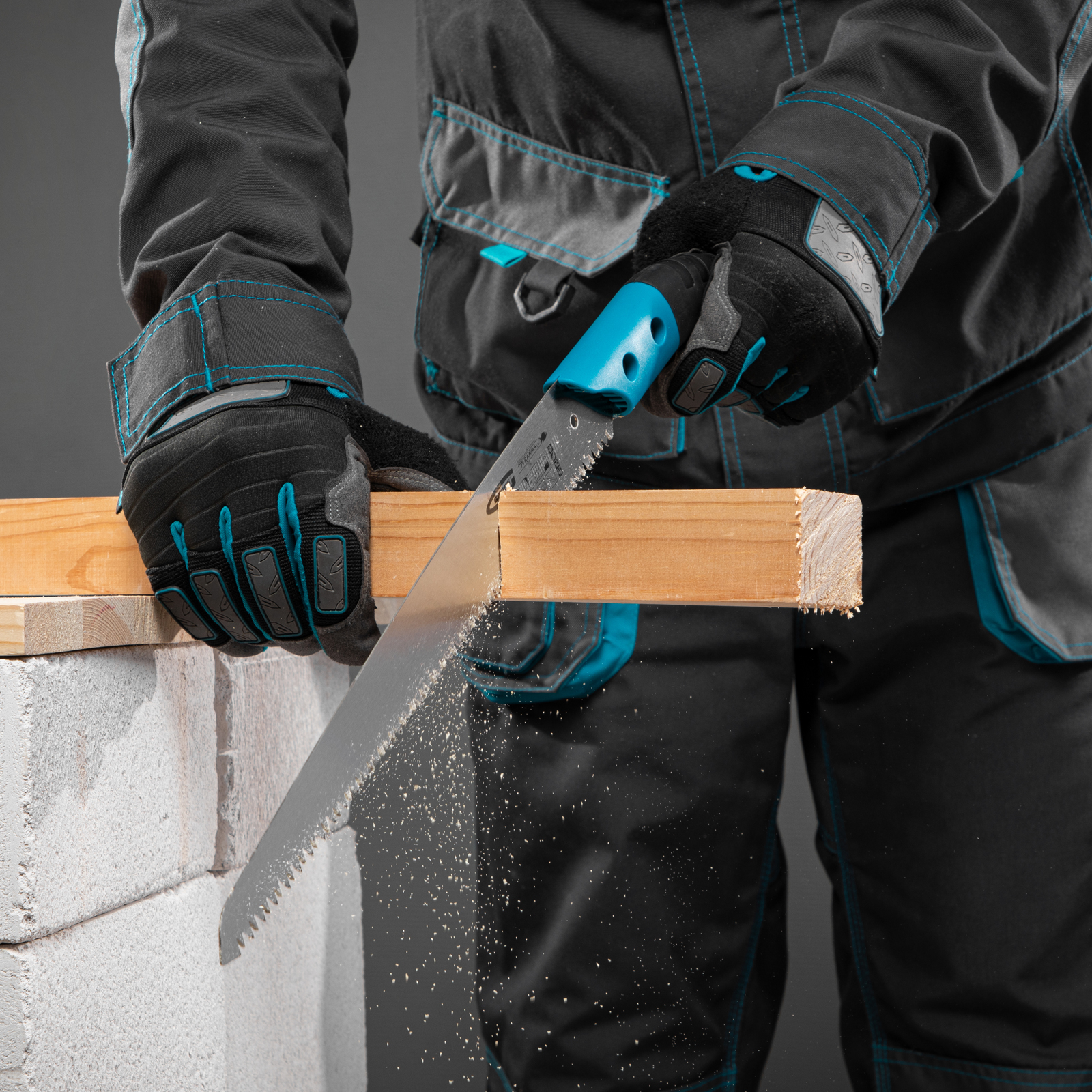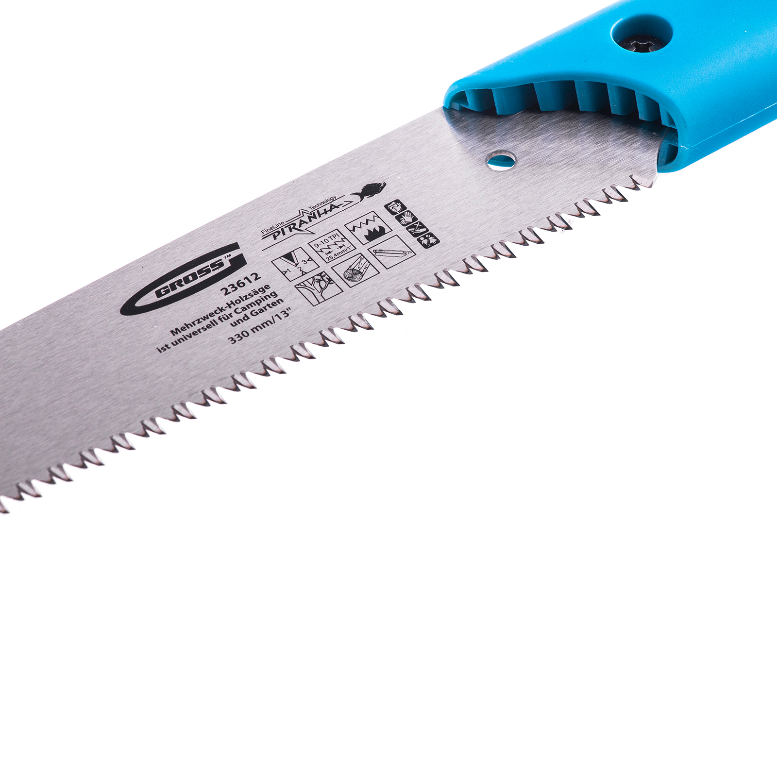 Универсальная пила по дереву Gross PIRANHA 23612 с полотном длиной 330 мм, калеными зубьями с шагом 9-10 TPI и 3D-заточкой, с 2-компонентной рукояткой, используется во время работ в саду и кемпинге. С ее помощью можно обрезать сучья или заготовить материал для растопки. Также пила подходит для распиловки фанеры, ДВП, ПВХ. Выполняет продольный и поперечный распил. Зубья с шагом 9-10 TPI и трехгранной заточкой обеспечивают высокую производительность инструмента. Благодаря высококачественной заточке зубьев характеристики режущей кромки соответствуют всем международным стандартам.