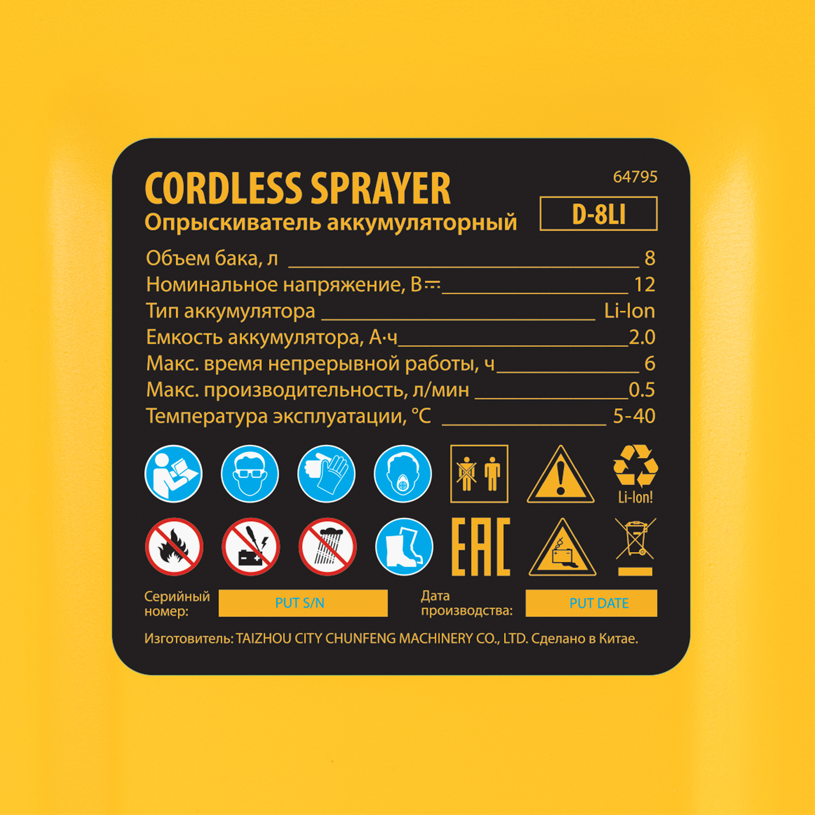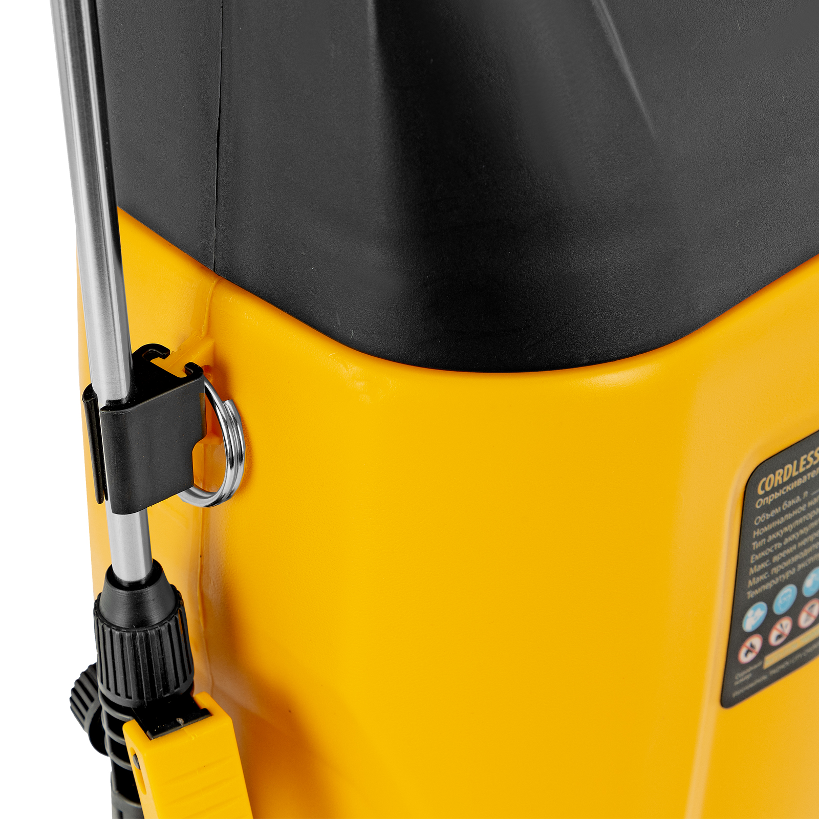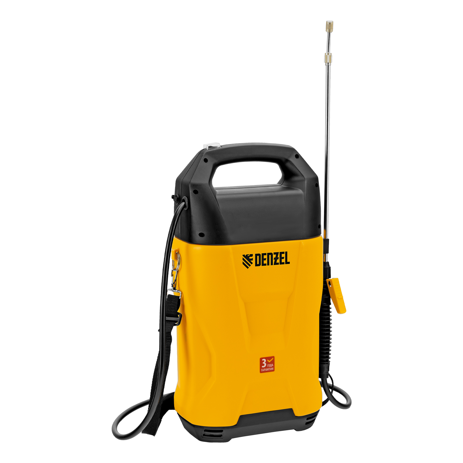 Аккумуляторный опрыскиватель Denzel D-8LI 64795 с баком объемом 8 л и Li-Ion батареей на 12 В, емкостью 2 А·ч, используется для ухода за растениями, а также для распыления инсектицидных жидкостей, дезинфекции помещений, мытья окон, стен и дорожек. Длина штанги регулируется в диапазоне 380-630 мм, а максимальная дальность распыления составляет 4 м, что позволяет обрабатывать участки большой площади и труднодоступные места. Опрыскиватель экономит силы и время пользователя, будет полезен в быту и на производстве.