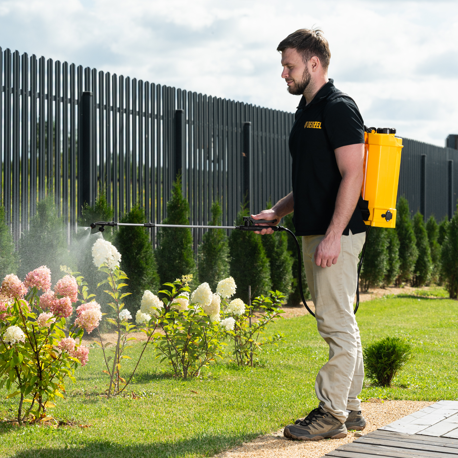 - Удобное перемещение — плечевые ремни с мягкими накладками равномерно распределяют вес опрыскивателя, снижая нагрузку на спину.
