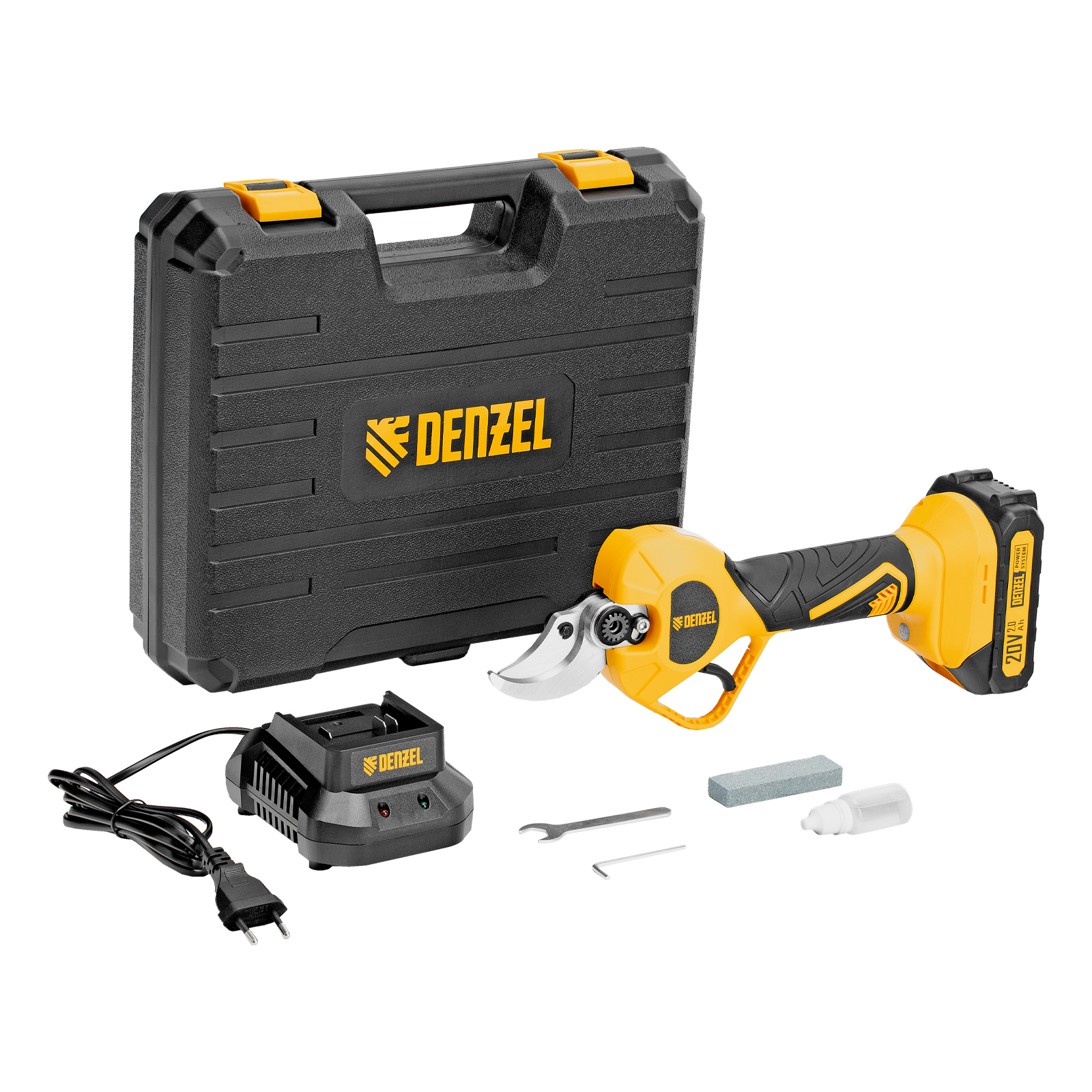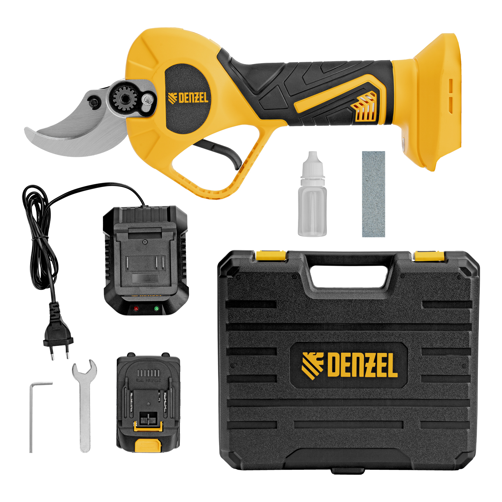 - Широкая комплектация — секатор поставляется с аккумулятором, зарядным устройством, гаечным и шестигранным ключами, масленкой