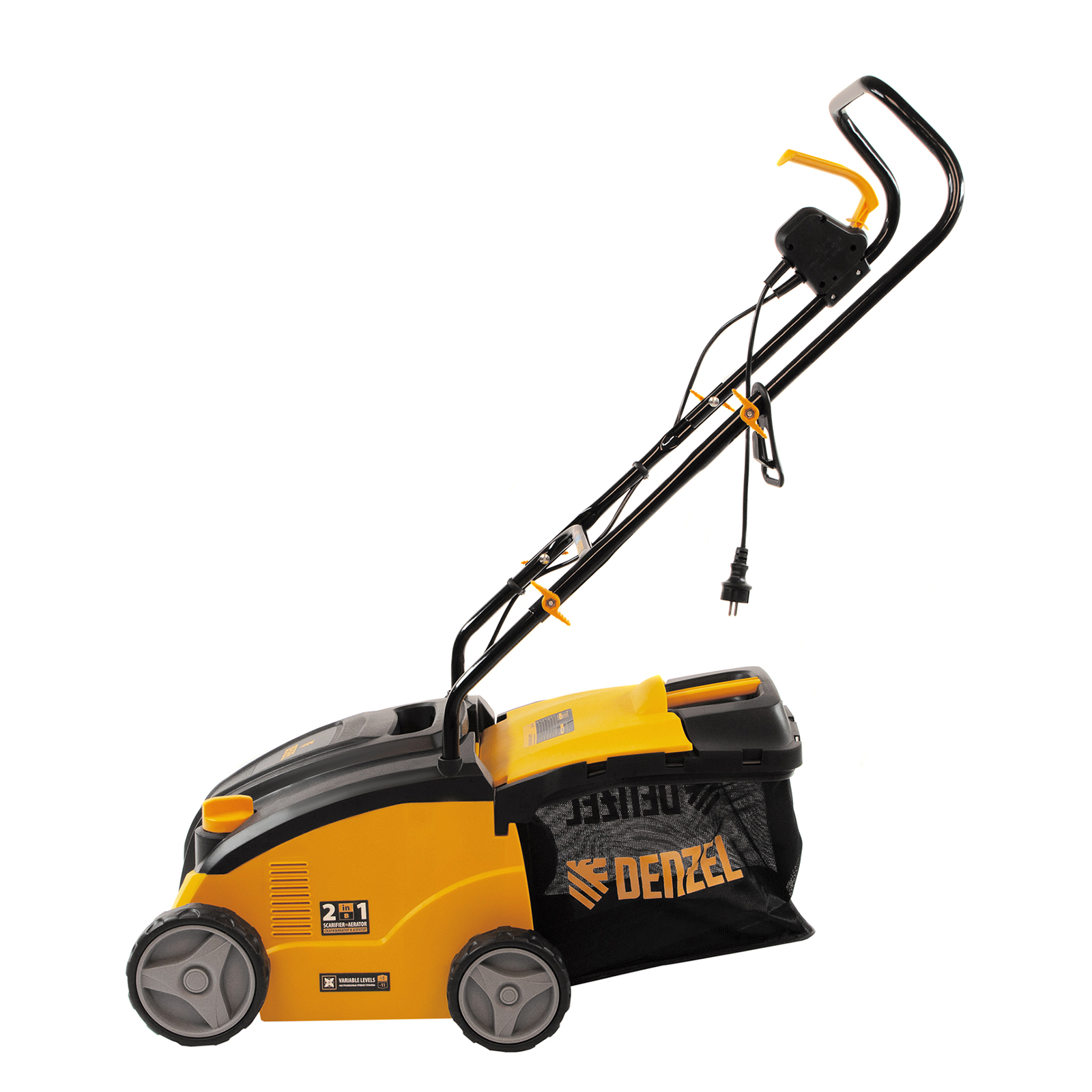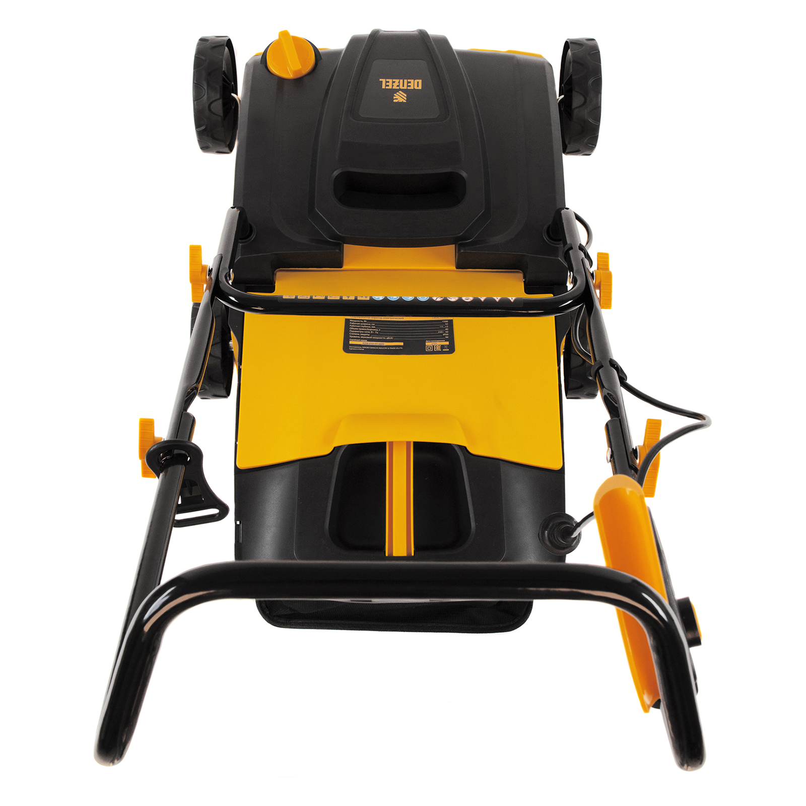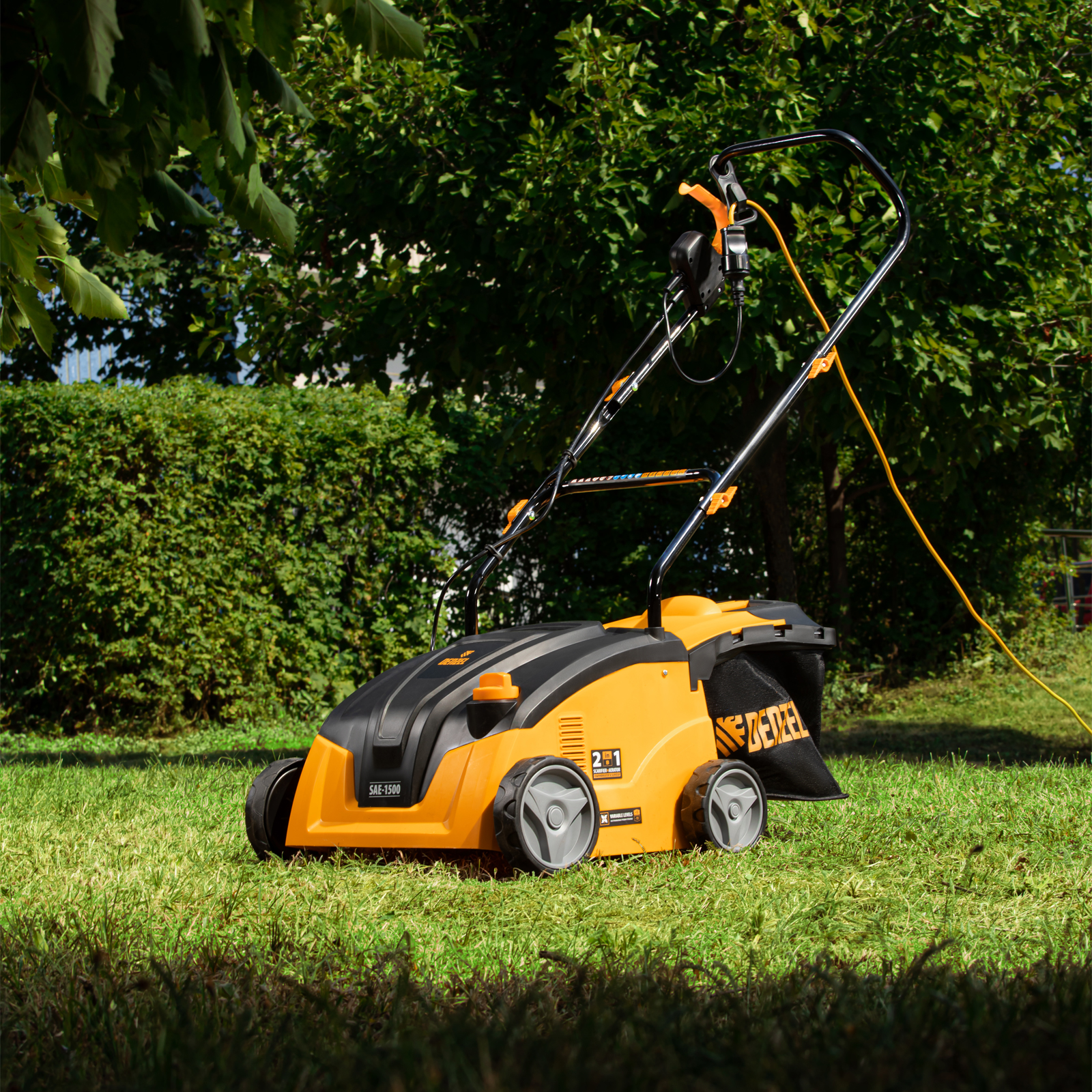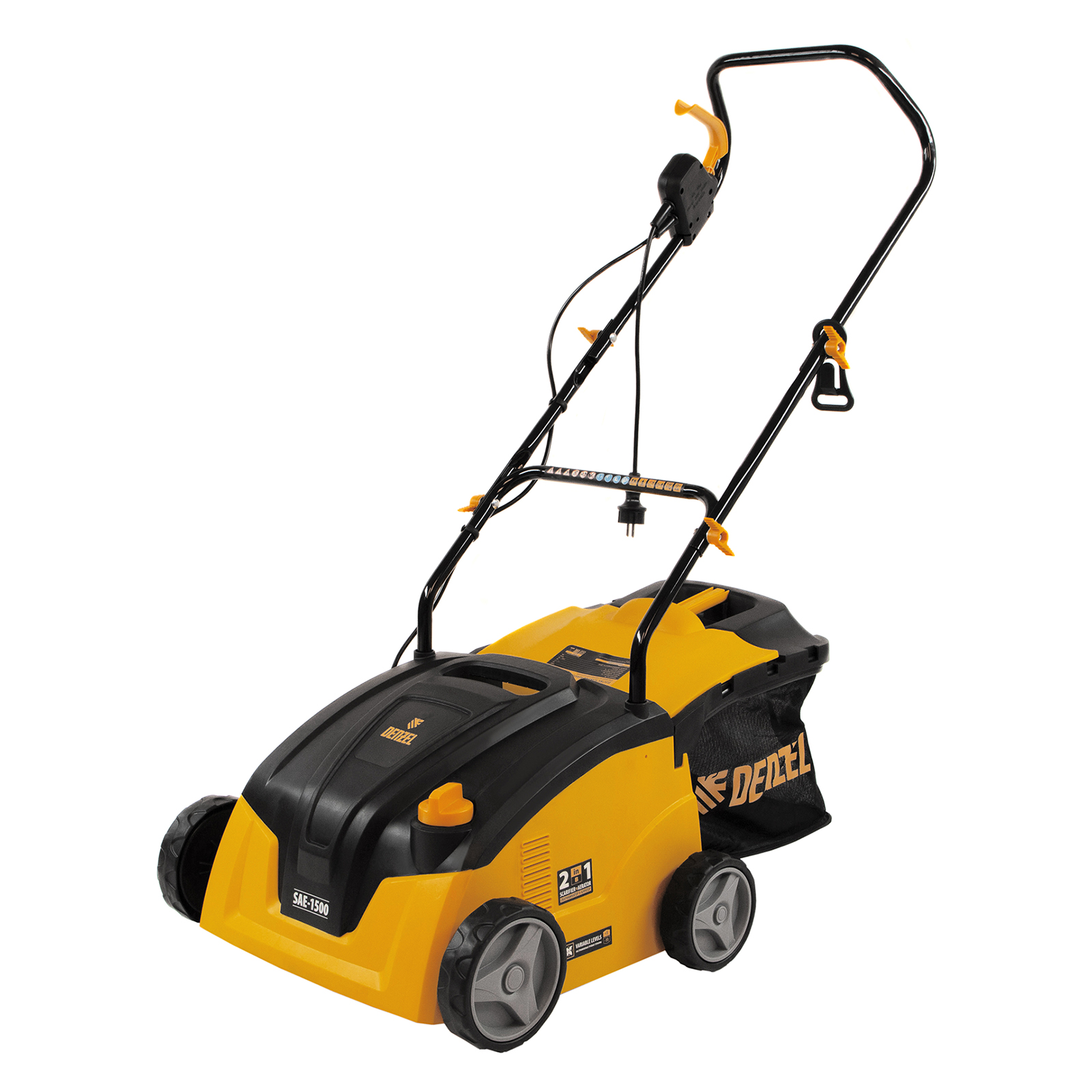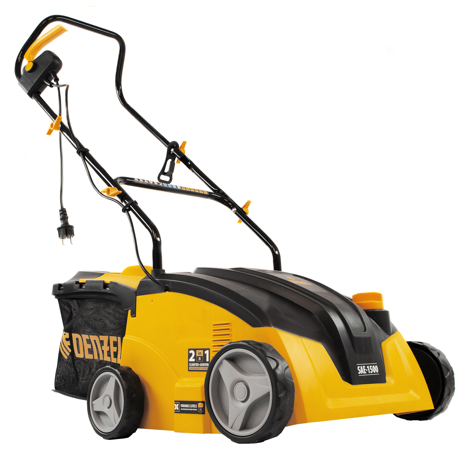 Электрический скарификатор-аэратор Denzel SAE-1500 57701 мощностью 1500 Вт обеспечивает ширину обработки 32 см, глубину -11/+5 мм и предназначен для ухода за газоном: удаления сухой травы, мха и мусора, а также прорезания дерна и обеспечения притока воздуха к корневой системе растений. Скорость вращения вала составляет 4000 об/мин, этого достаточно для эффективной обработки придомовой территории.