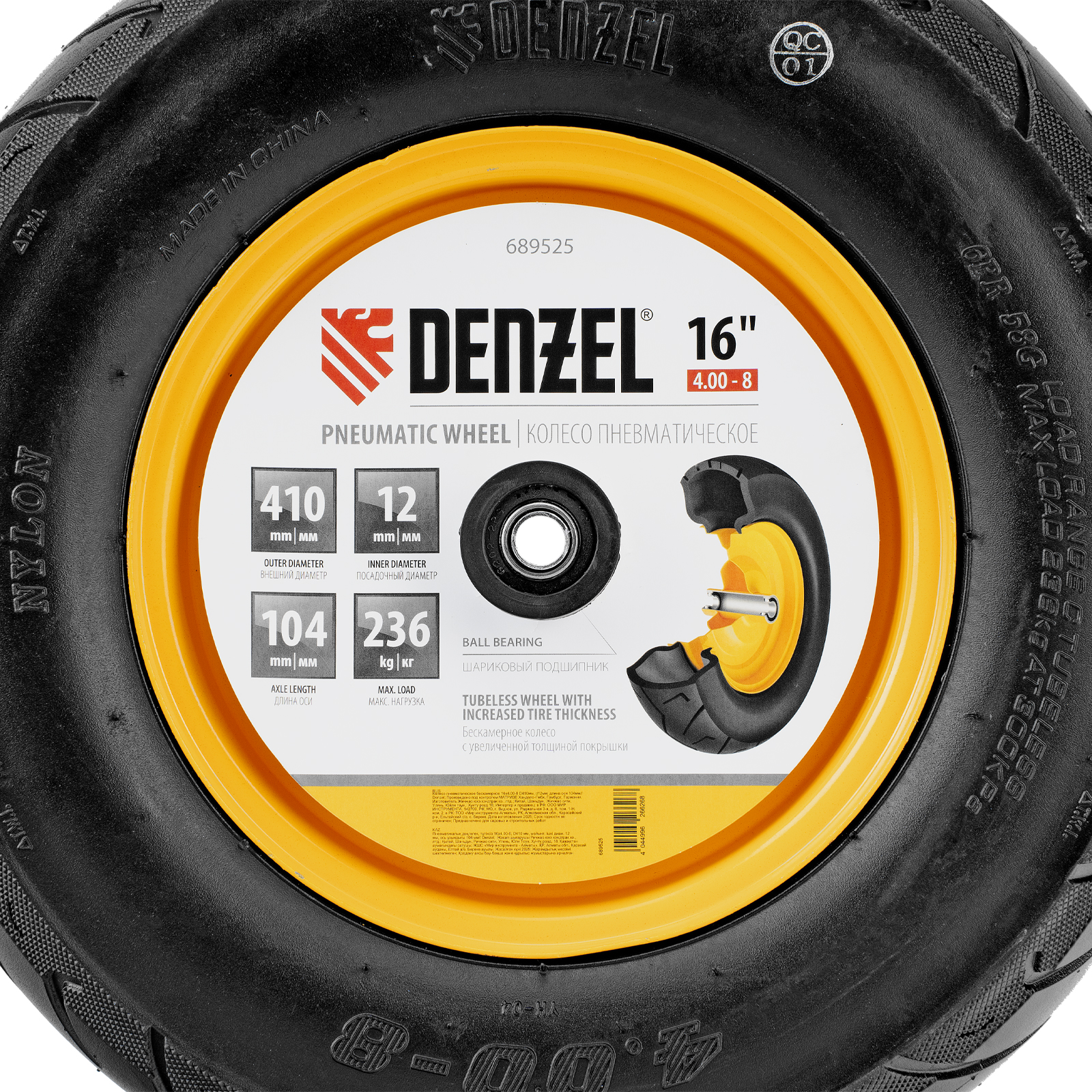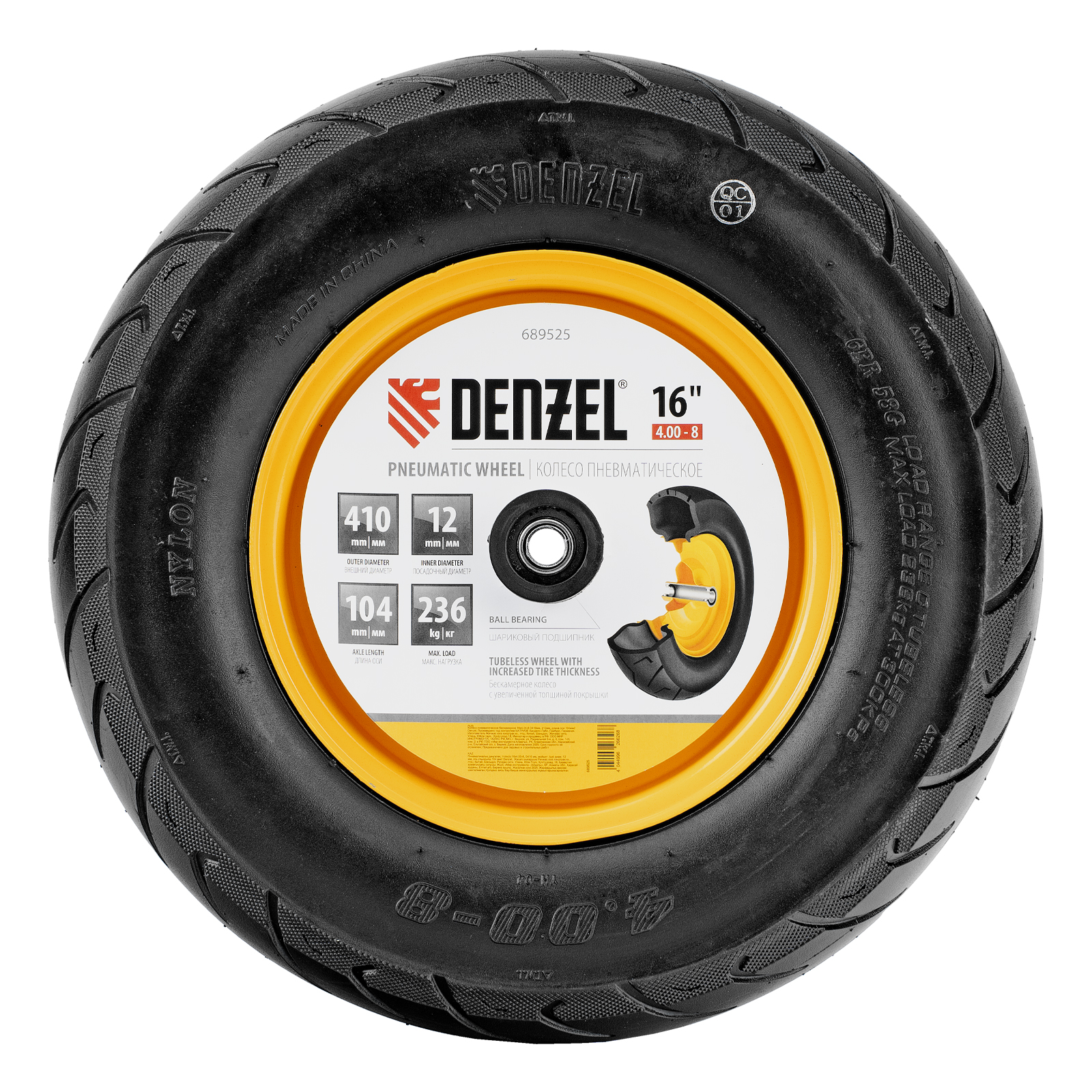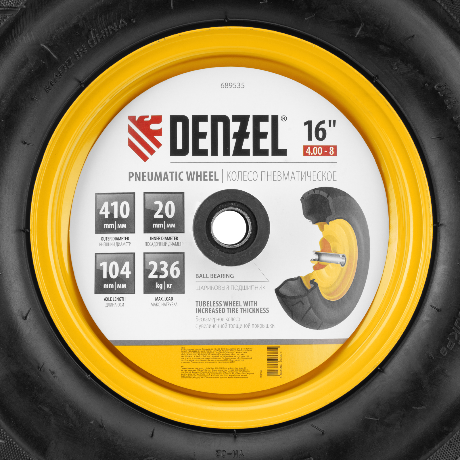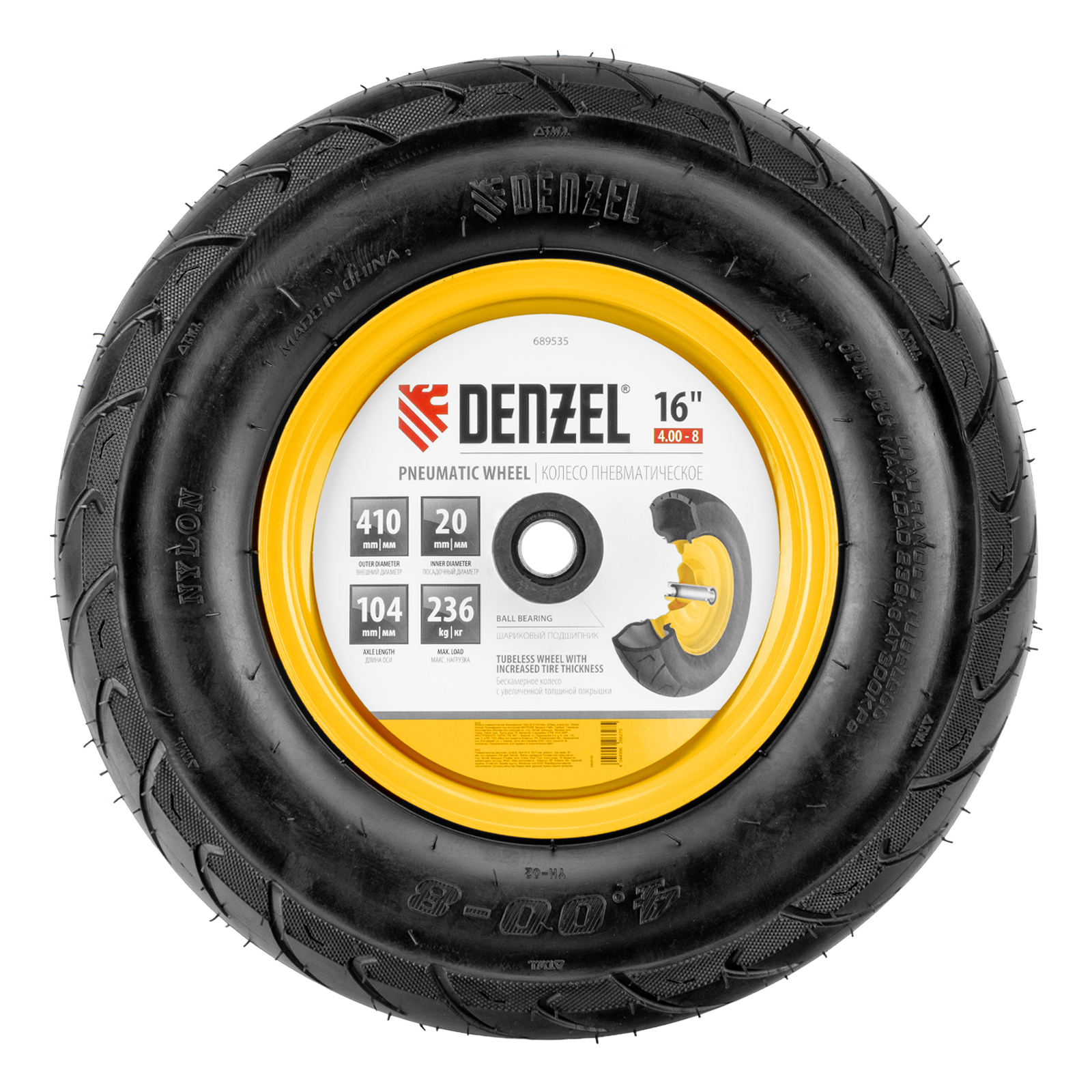 Пневматическое бескамерное колесо Denzel 689535 размером 16 х 4.00-8 и диаметром 410 мм, с длиной оси 104 мм и посадочным диаметром 20 мм, совместимо с тачкой Denzel 689365. Обеспечивает плавный ход и выдерживает высокие нагрузки при перемещении тяжелых грузов, подходит для интенсивного использования.