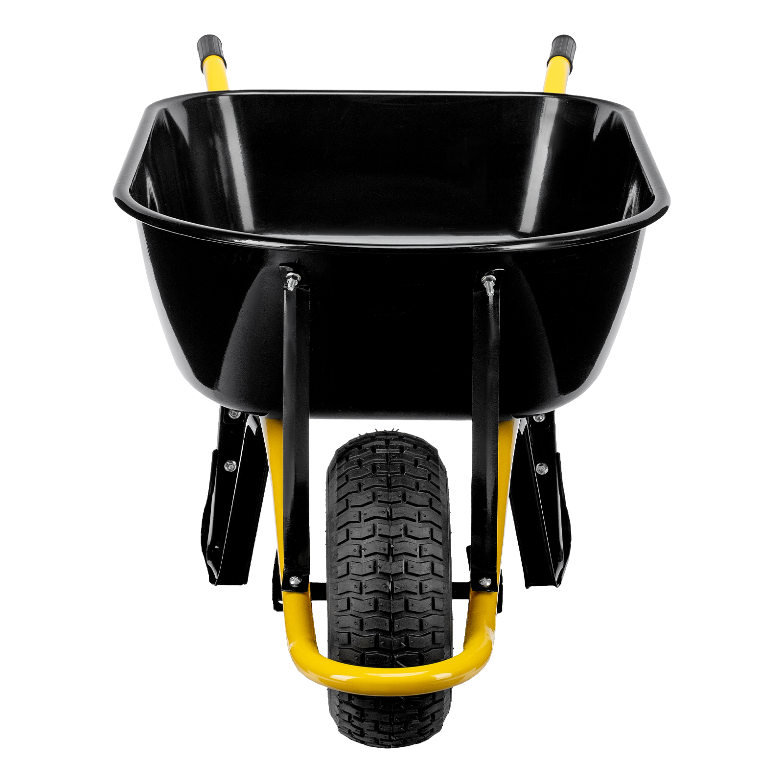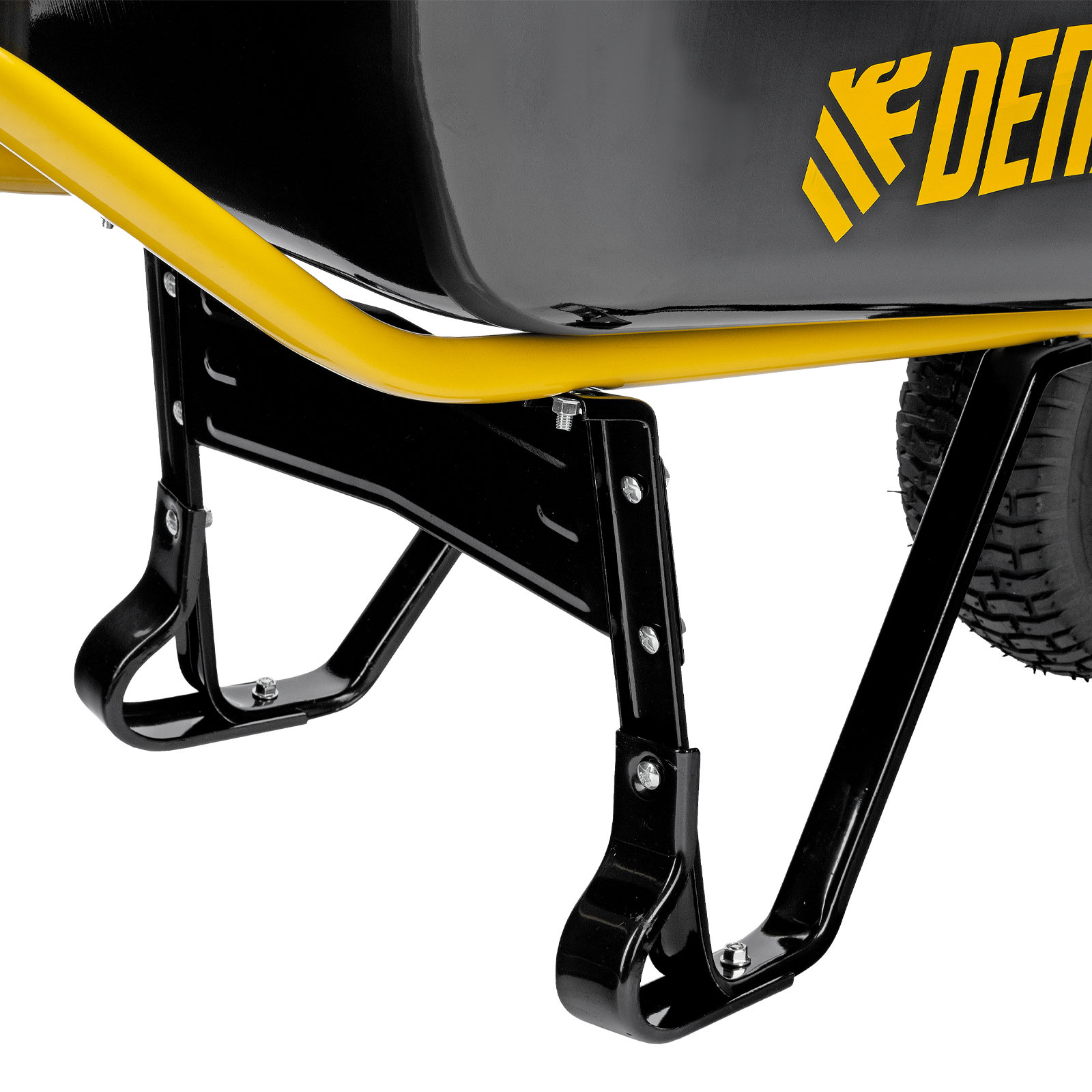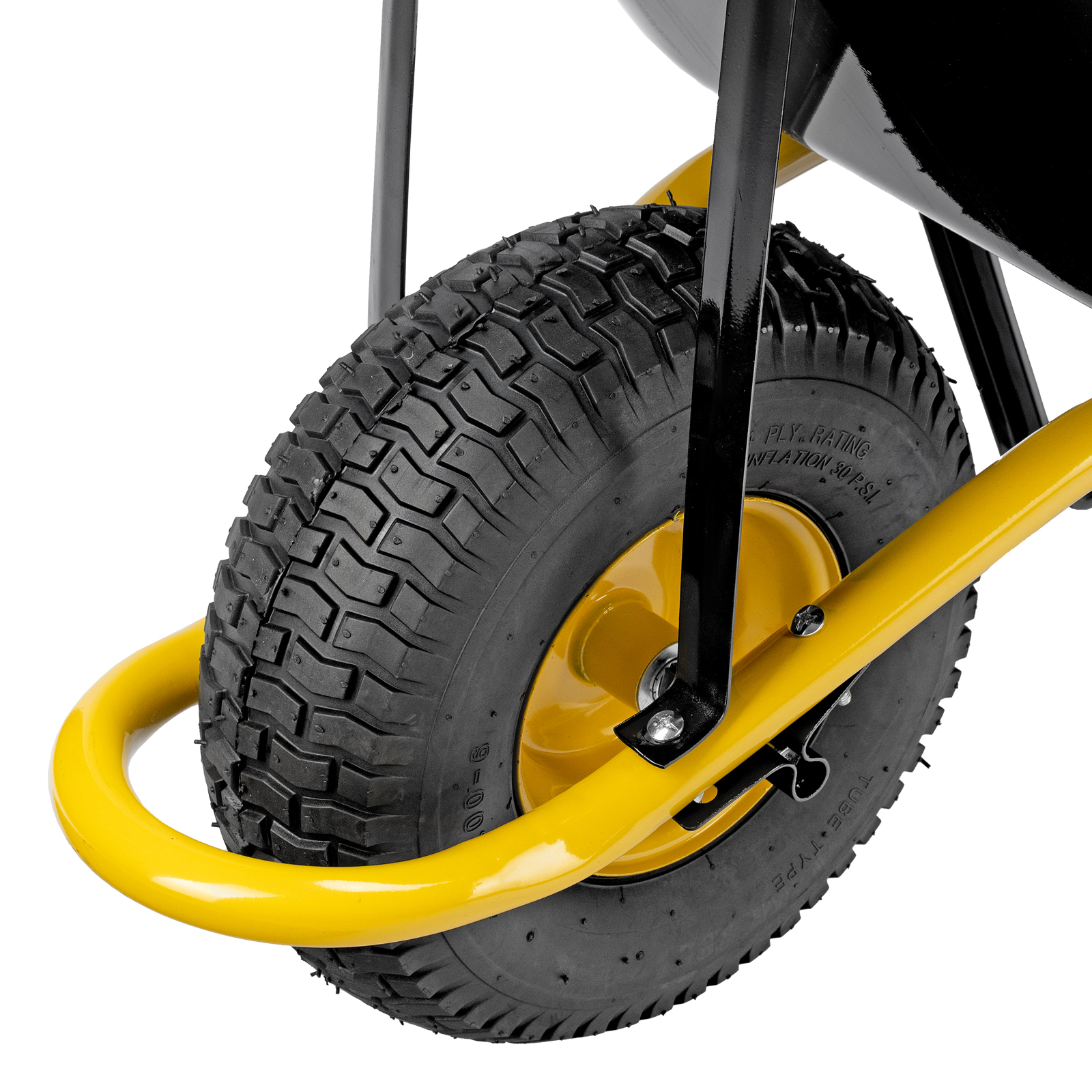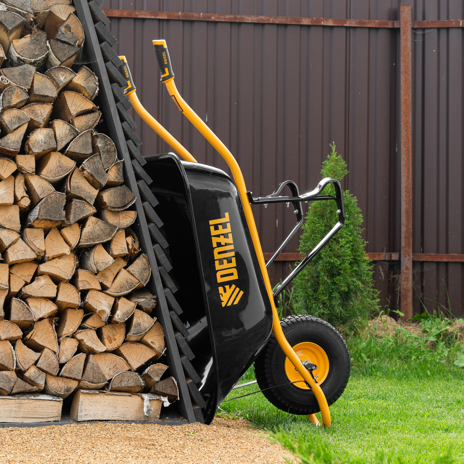 - Устойчивость — тачка не проваливается в грунт благодаря широкому пневматическому колесу и подпятникам на ножках.