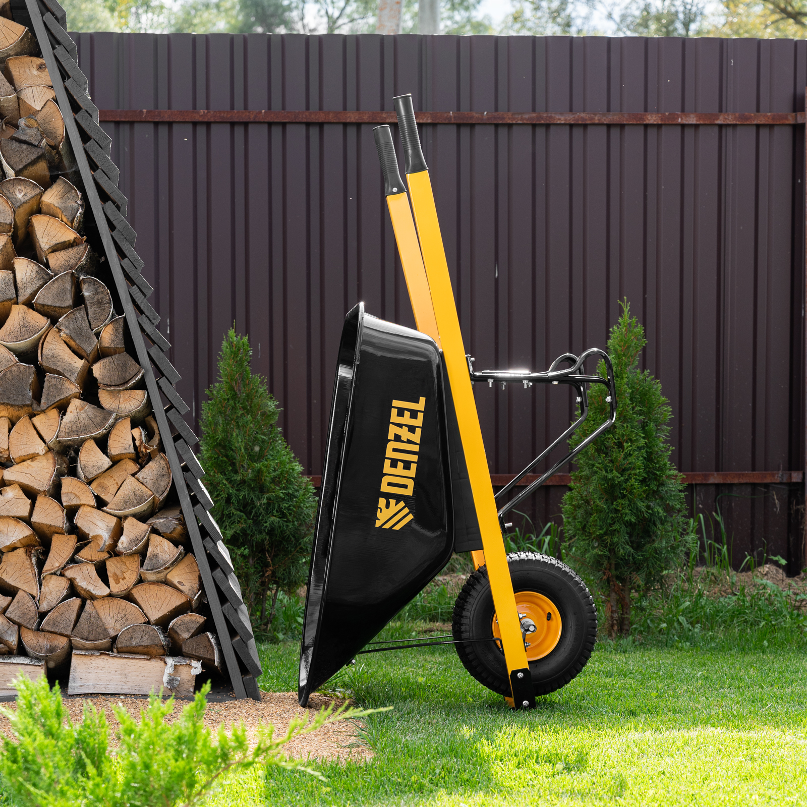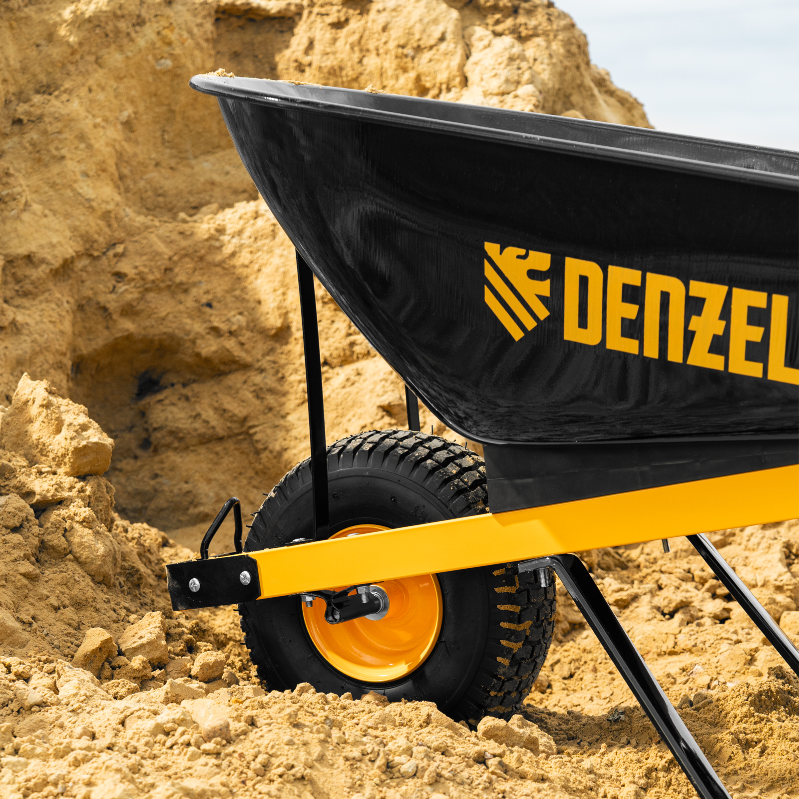 - Устойчивость — тачка не проваливается в грунт благодаря широкому пневмоколесу и подпятникам на ножках.