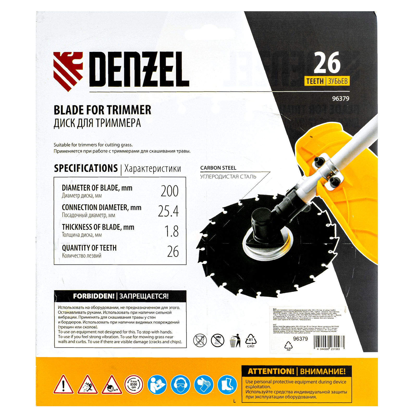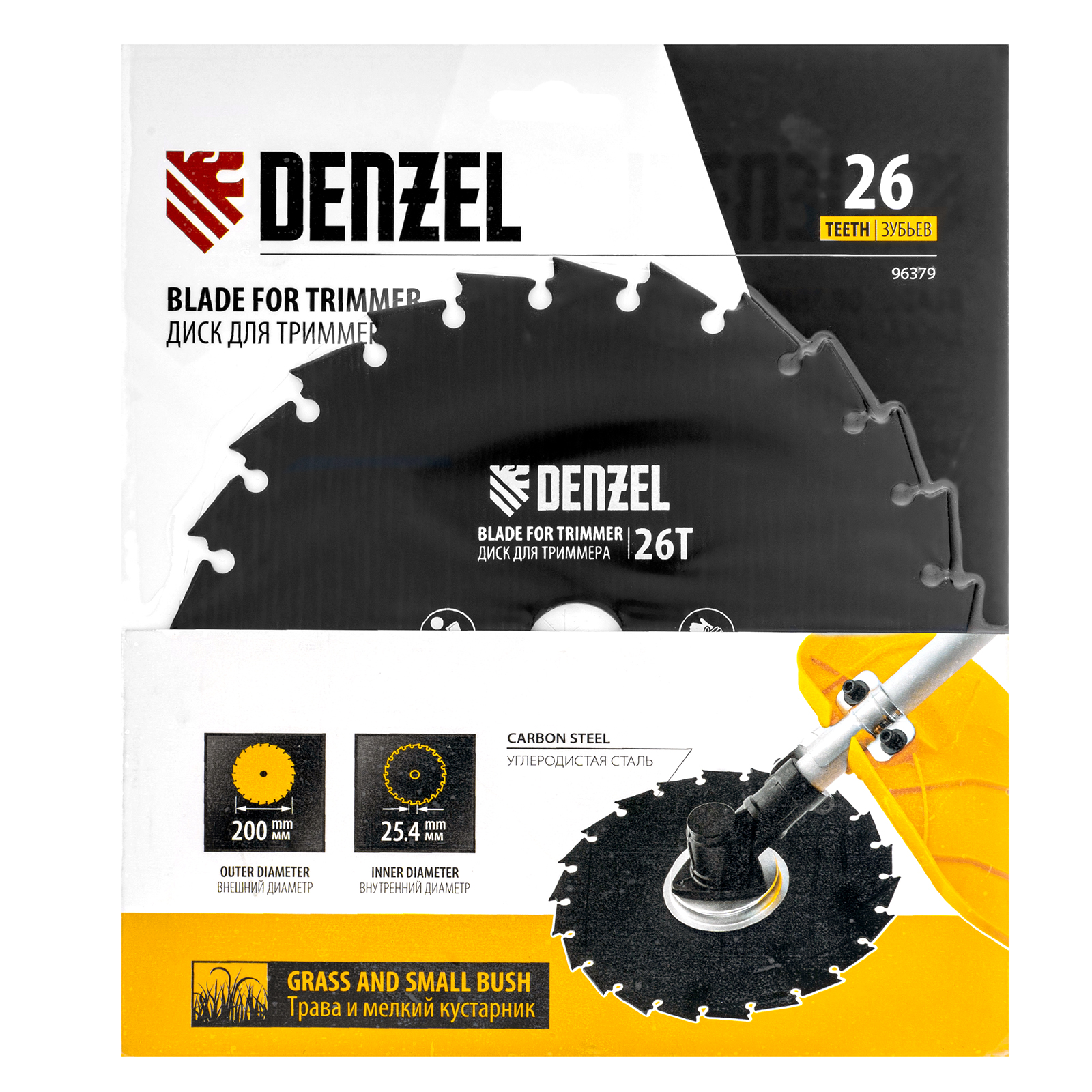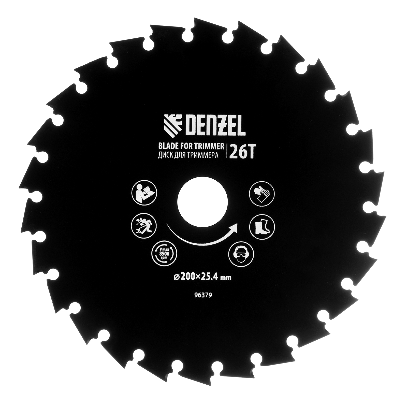 Диск для триммера Denzel 96379 с внешним диаметром 200 мм и посадочным — 25,4 мм, с 26 зубьями долотообразной формы, предназначен для скашивания травы и мелкого кустарника. Устанавливается на вал триммера с бензиновым двигателем. Диск пригодится для ухода за дачным участком.