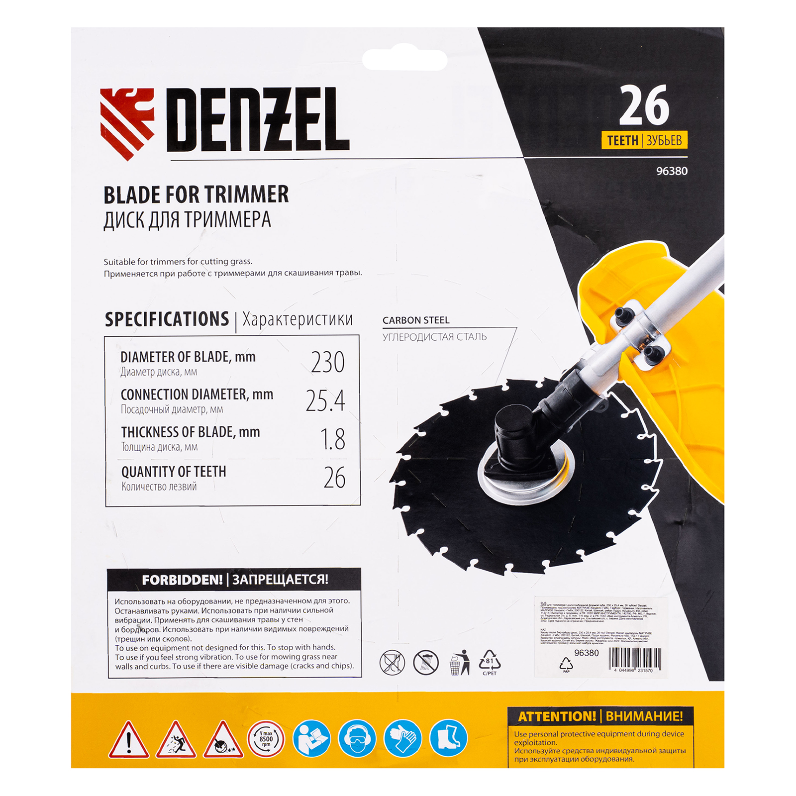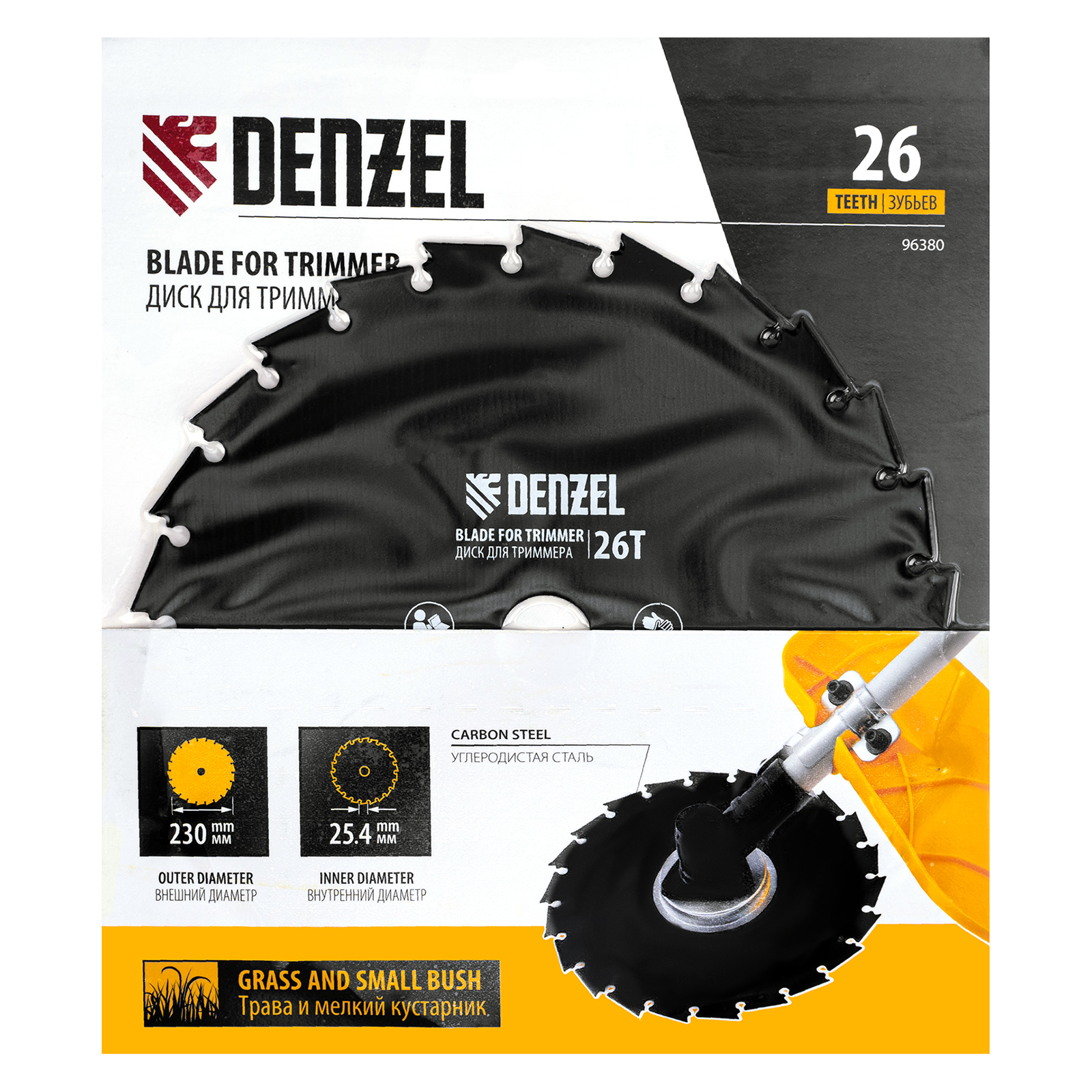 Диск для триммера Denzel 96380 с внешним диаметром 230 мм и посадочным — 25,4 мм, с 26 зубьями долотообразной формы, предназначен для скашивания травы и мелкого кустарника. Устанавливается на вал триммера с бензиновым двигателем. Диск пригодится для ухода за дачным участком.