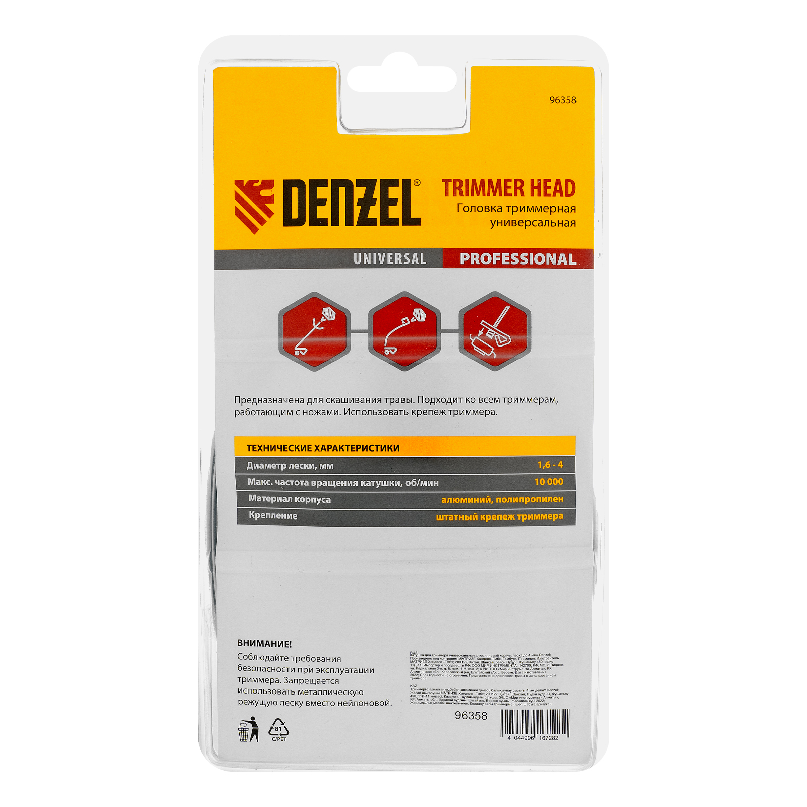 Универсальная триммерная головка Denzel 96358 с алюминиевым корпусом совместима с леской толщиной до 4 мм. Подходит практически ко всем моделям бензиновых кос Denzel, Сибртех, Patriot, Husqvarna, Huter и другим с крепежом М10 х 1,25 и левой резьбой. Используется для скашивания травы на загородном участке.