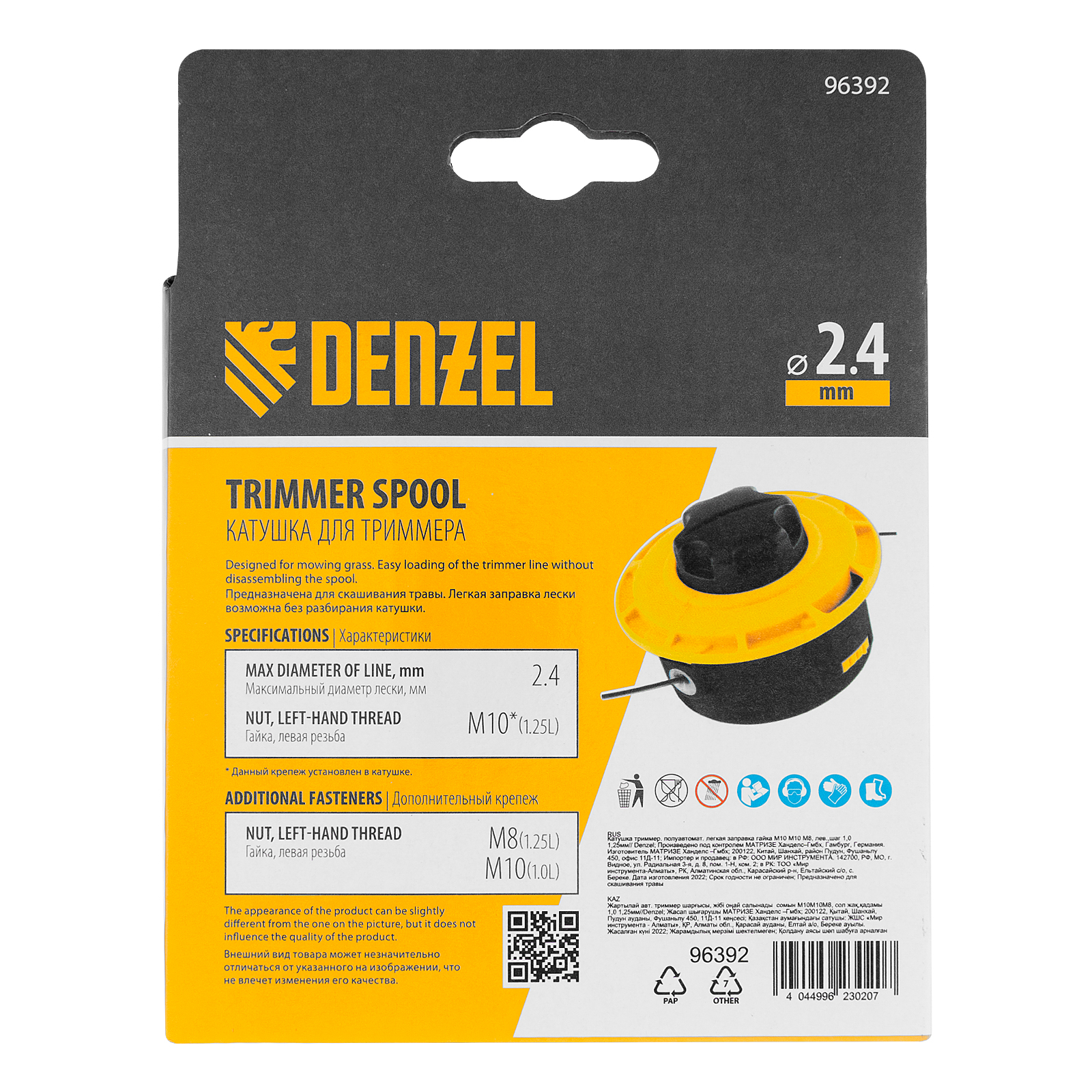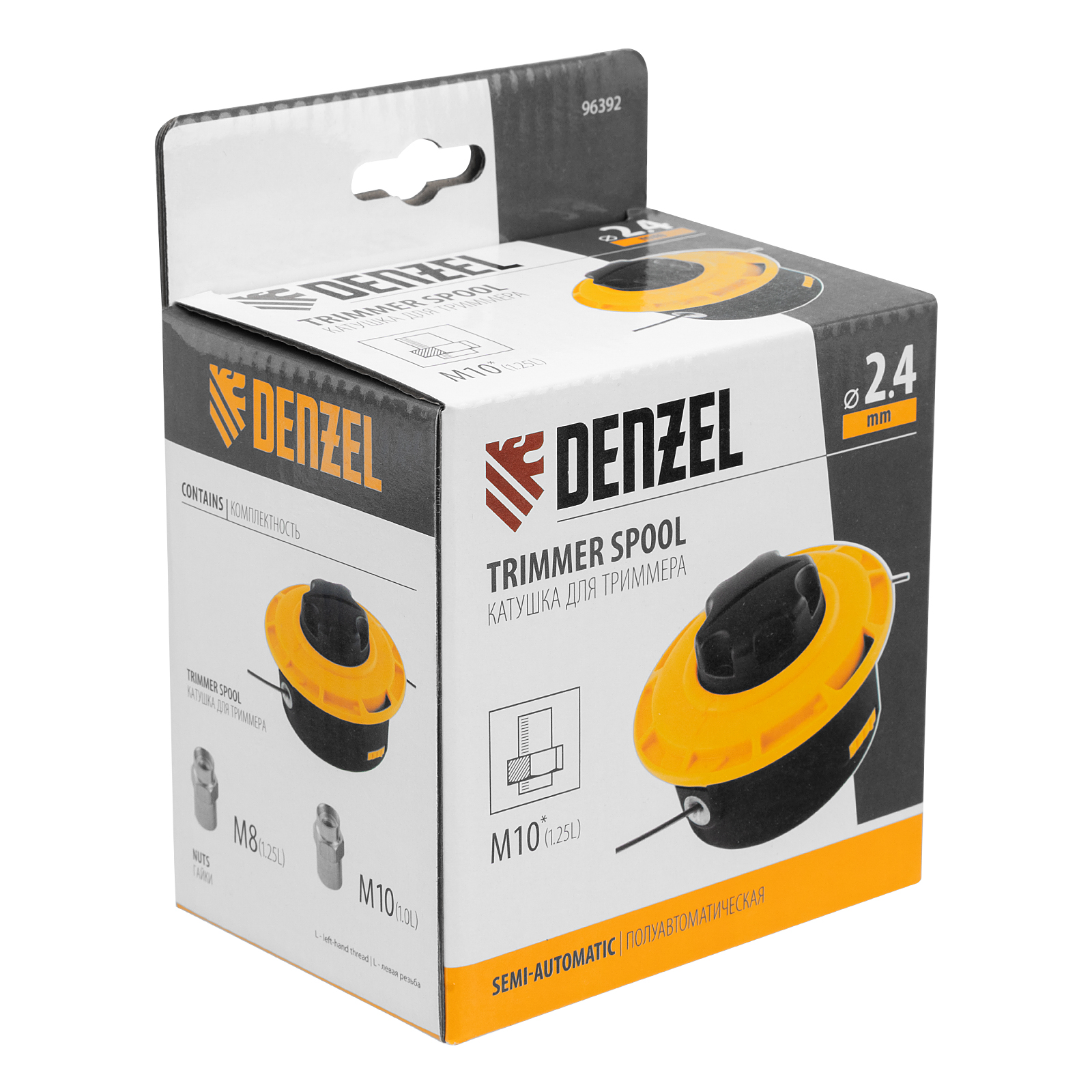 Полуавтоматическая триммерная катушка Denzel 96392 с легкой заправкой лески крепится на вал триммера при помощи гайки М10 с левой резьбой и шагом 1,25 мм, дополнительно комплектуется гайками М10 х 1 мм (правая резьба) и М8 х 1,25 мм (левая резьба). Заправляется леской диаметром до 2,4 мм, устанавливается на вал бензинового или электрического триммера. Используется для скашивания молодой газонной травы и удаления сорняков.
