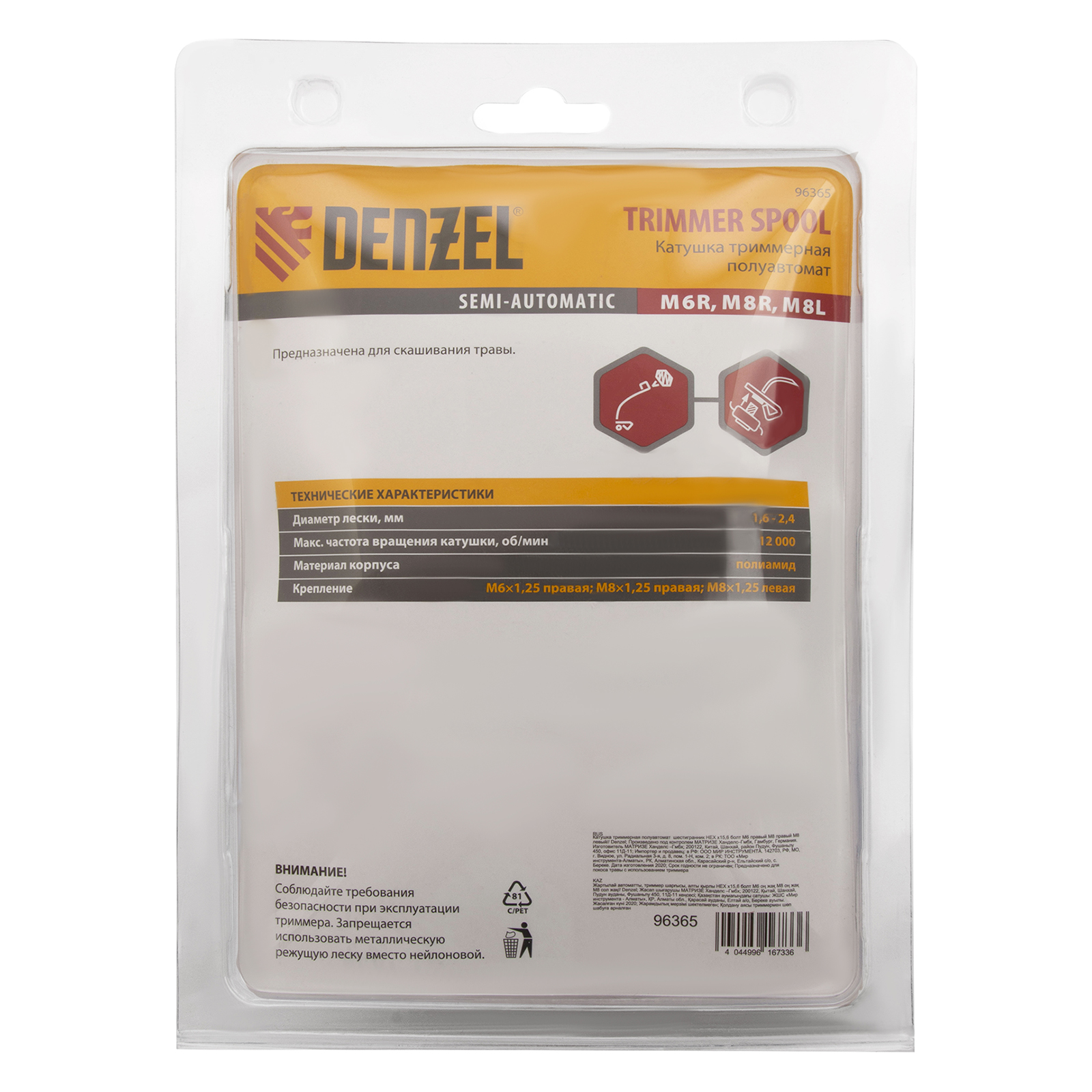Полуавтоматическая катушка для триммера Denzel 96365 устанавливается на любые марки электрических и бензиновых кос с креплением на оси НЕХ х 15/6. Режущая леска сечением до 2 мм обеспечивает комфортное скашивание молодой травы на приусадебном участке.
