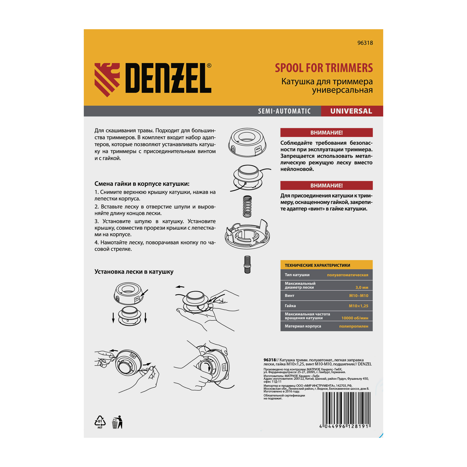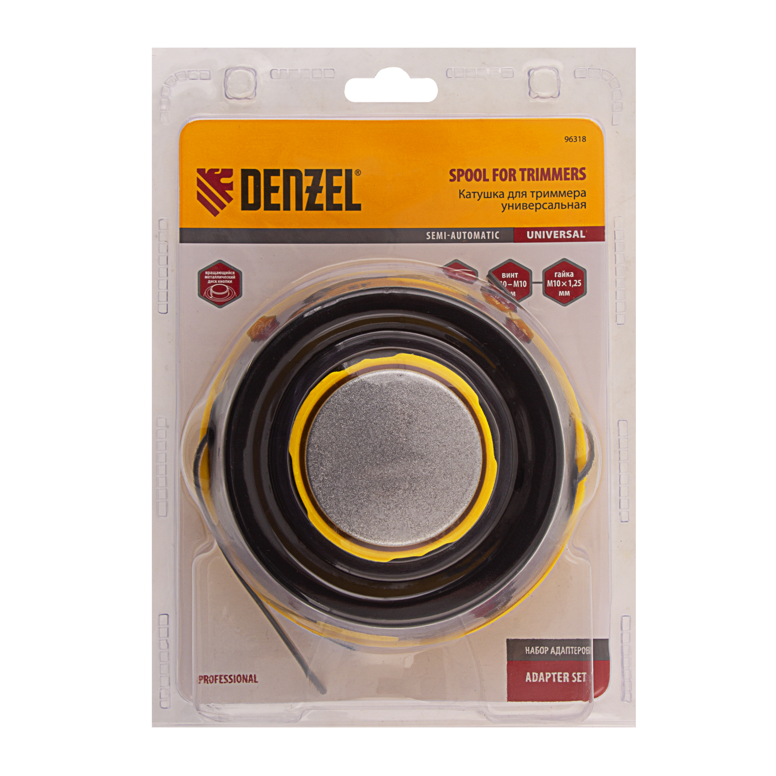 Полуавтоматическая триммерная катушка Denzel 96318 предназначена для использования с электрическими и бензиновыми косами. Адаптер «папа-папа» М8-М10 с левой резьбой делает возможным применение с моделями, оснащенными и присоединительным винтом, и гайкой. Максимально возможный диаметр лески составляет 3 мм, этого достаточно для скашивания высоких зарослей травы.