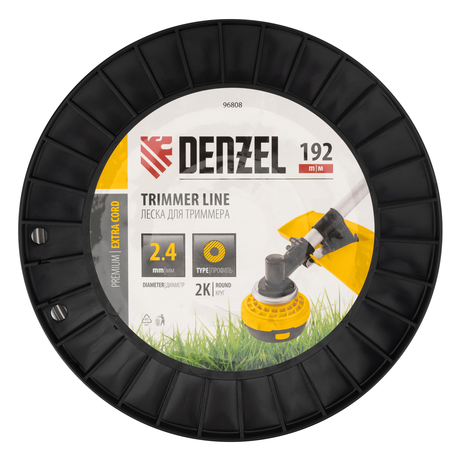 Двухкомпонентная леска для триммера Denzel EXTRA CORD 96808 размером 2,4 мм х 192 м, с круглым сечением, на DIN-катушке, предназначена для работы с бензотриммерами и электрическими триммерами мощностью 1-1,5 кВт. Используется для скашивания густой травы, будет полезна для ухода за дачным участком или придомовой территорией.