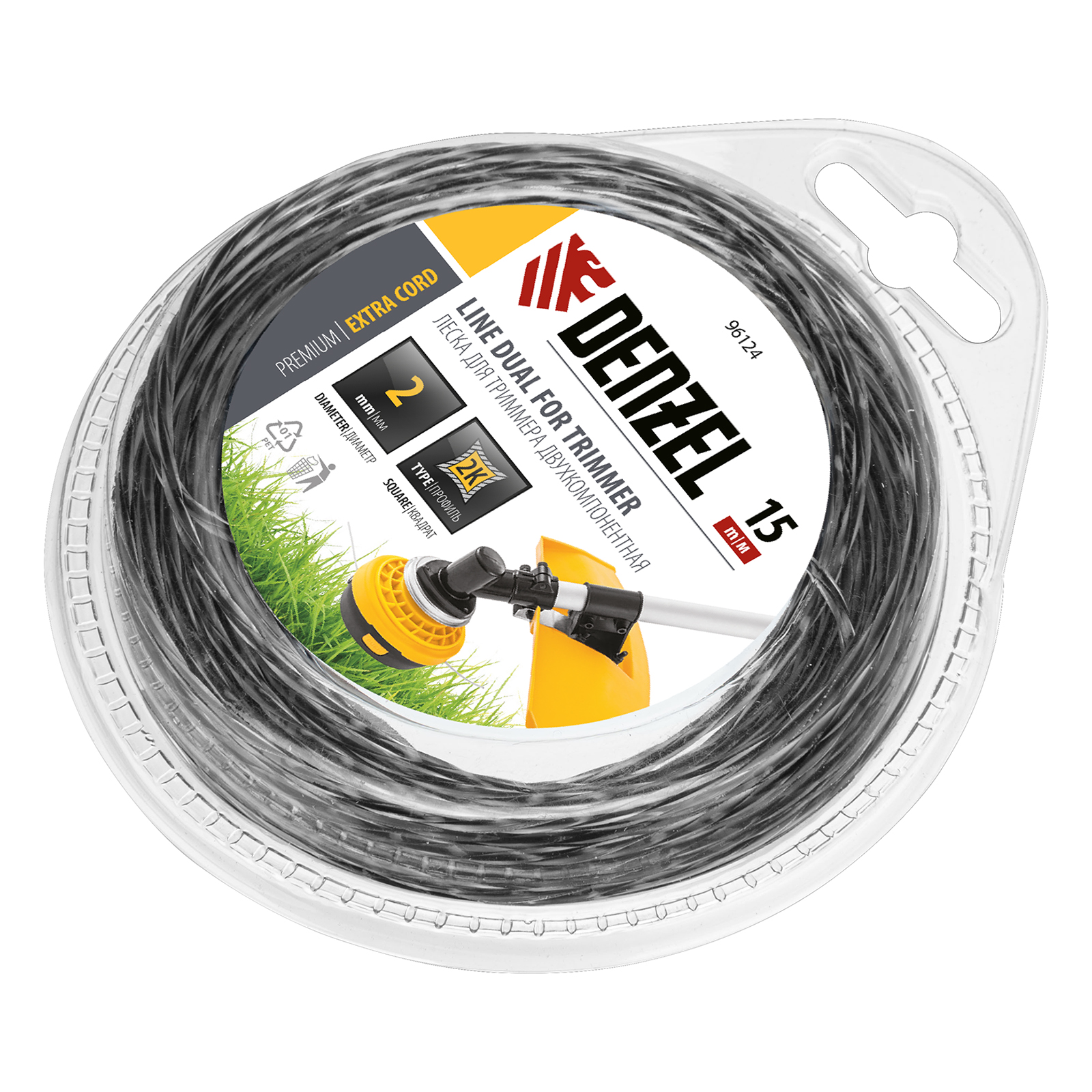Двухкомпонентная леска Denzel Extra cord 96124 размером 2 мм х 15 м, с квадратным сечением, предназначена для использования с бензотриммерами высокой мощности. Благодаря наличию высокопрочного сердечника рабочий ресурс корда увеличен на 40% по сравнению с однокомпонентными лесками. Леска идеально подходит для срезания сухостоя, травы любой жесткости, небольших стеблей и бурьяна на участках любой сложности.