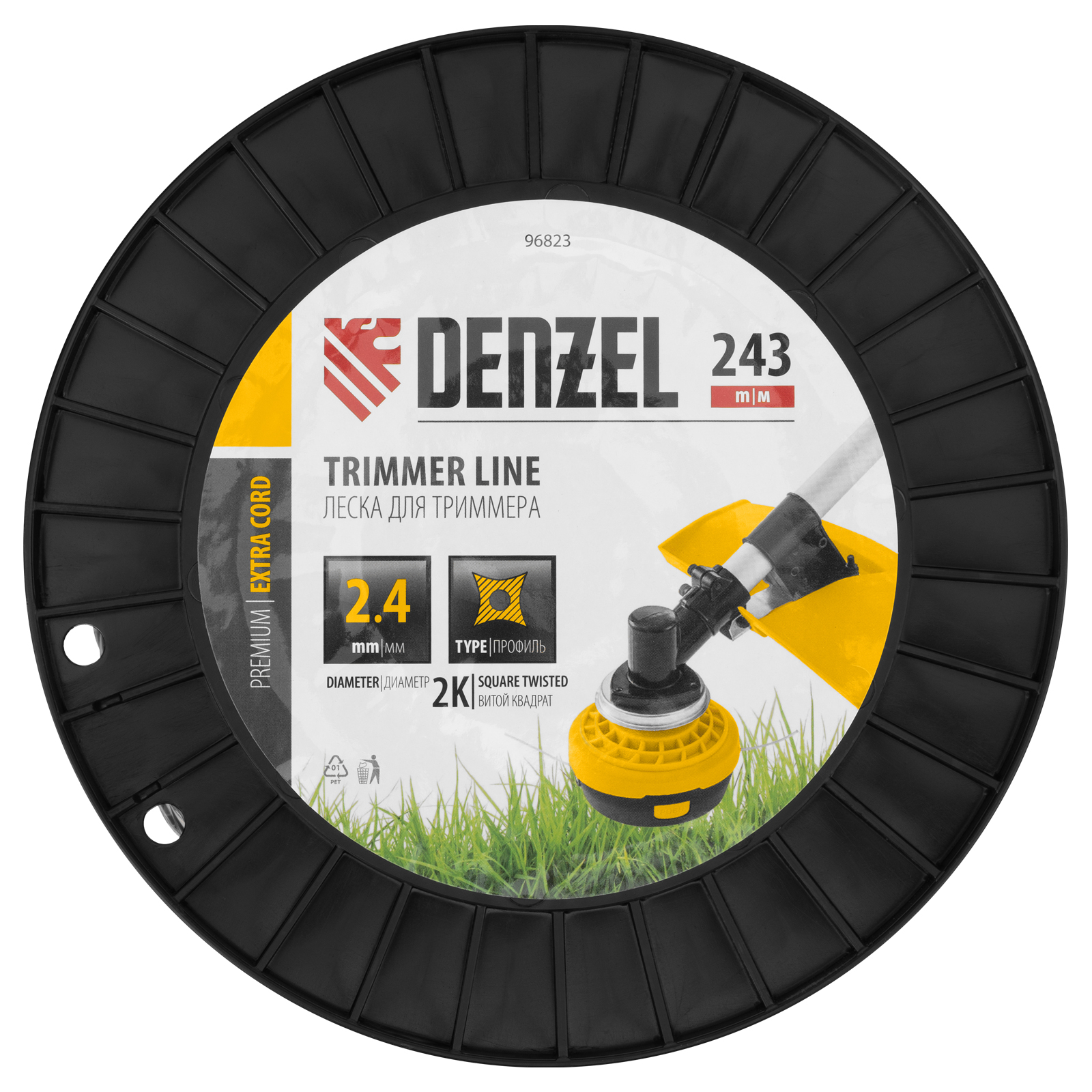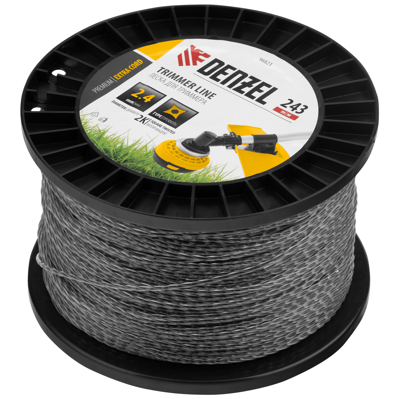 Двухкомпонентная леска для триммера Denzel EXTRA CORD 96823 размером 2,4 мм х 243 м, с сечением «витой квадрат», на DIN-катушке, используется для скашивания густых зарослей травы и сорных растений на дачном участке и придомовой территории. Предназначена для электротриммеров и бензокос с объемом двигателя 25-52 см3. Устойчива к излому, что облегчает ее заправку в катушку. Благодаря острым граням леска успешно справляется с толстыми, жесткими стеблями, позволяя быстро обработать участок большой площади.