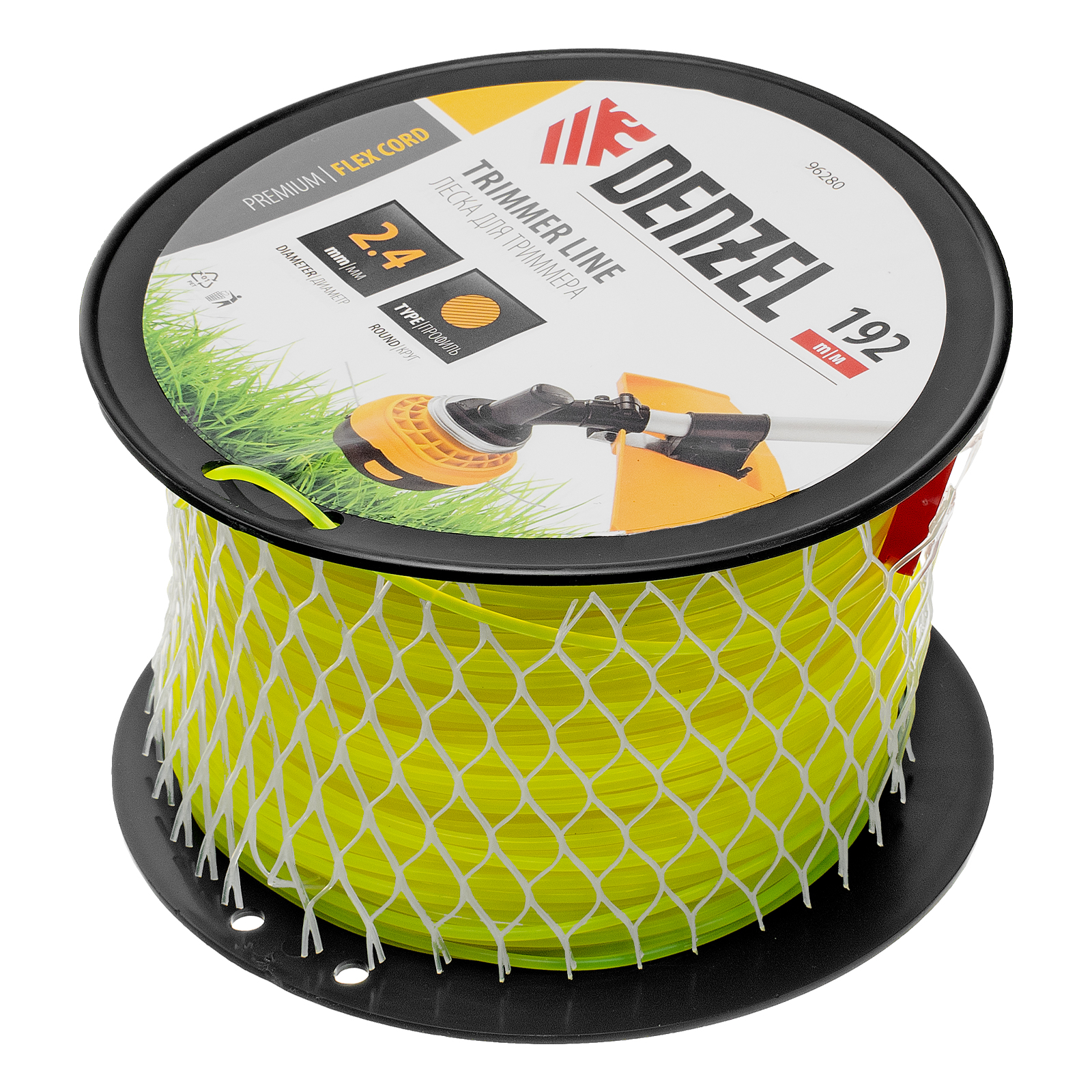 Леска для триммера Denzel FLEX CORD 96280 круглого сечения, диаметром 2,4 мм и длиной 192 м, на DIN-катушке, предназначена для скашивания как мягкой, молодой травы, так и более густой растительности. Подходит для бензиновых триммеров с объемом двигателя 25-52 см3 и электрических триммеров мощностью от 1 до 1,5 кВт.