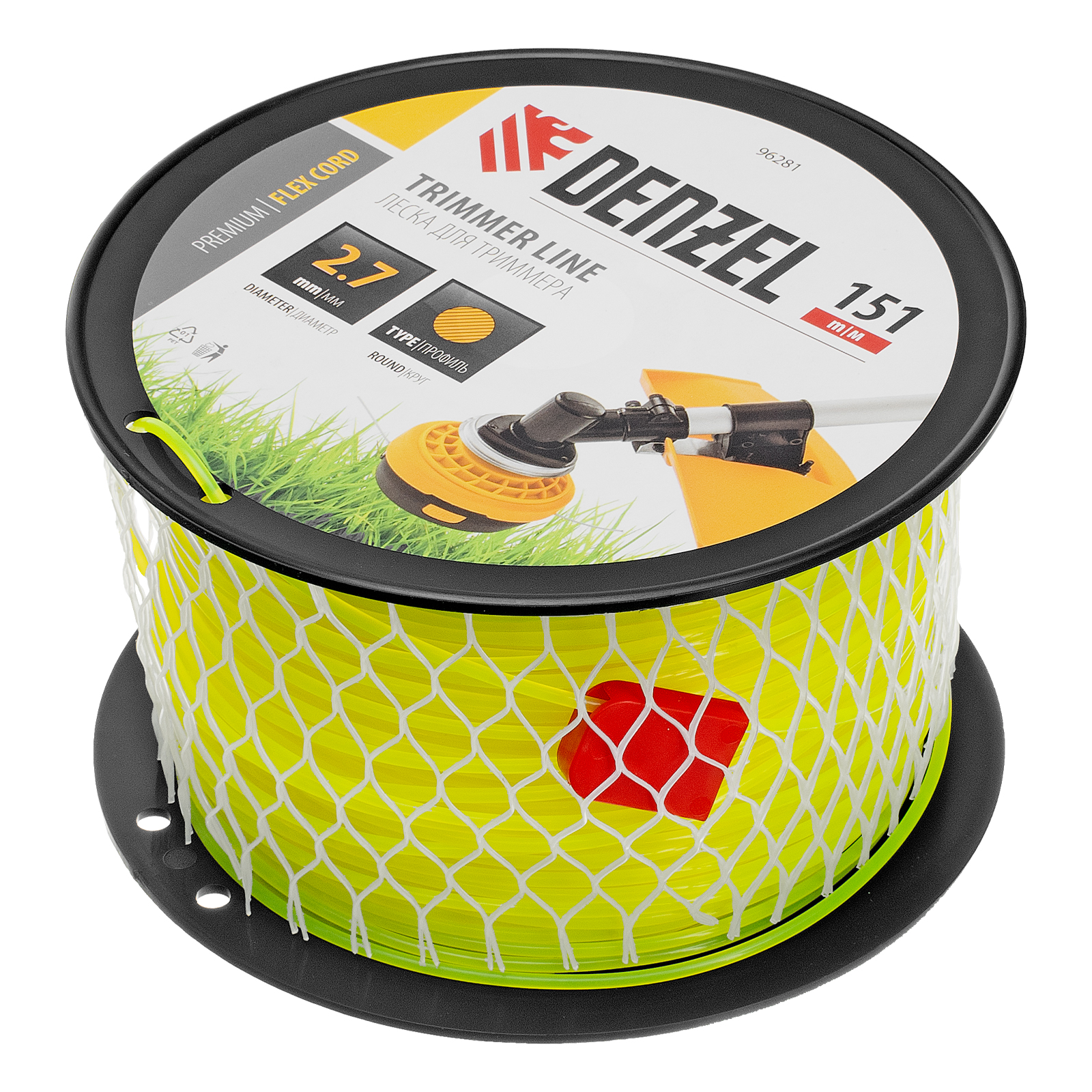 Леска для триммера Denzel FLEX CORD 96281 круглого сечения, диаметром 2,7 мм и длиной 151 м, на DIN-катушке, предназначена для скашивания как мягкой, молодой травы, так и более густой растительности. Подходит для бензиновых триммеров с объемом двигателя 25-52 см3 и электрических триммеров мощностью от 1 до 1,5 кВт.