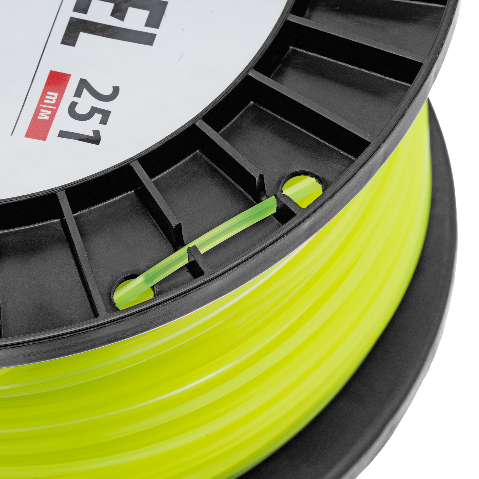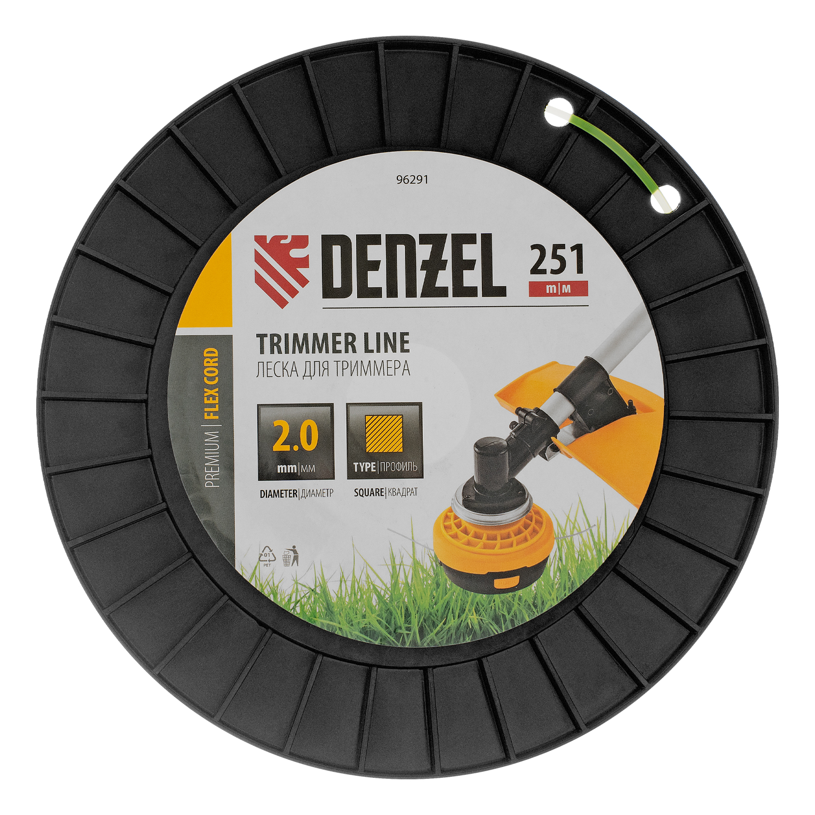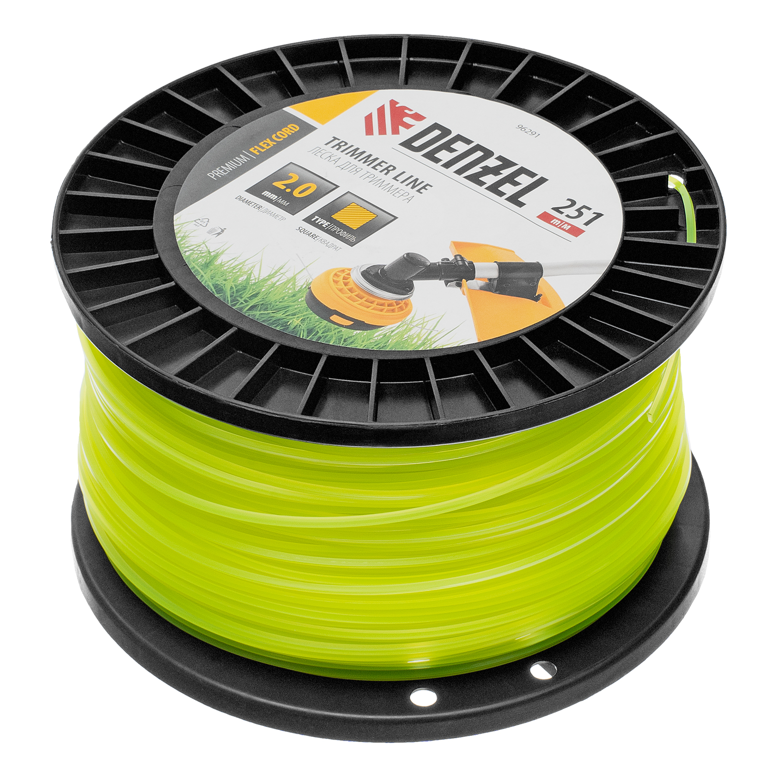 Леска для триммера Denzel FLEX CORD 96291 с сечением «квадрат», толщиной 2,0 мм и длиной 251 м, на DIN-катушке, предназначена для скашивания крупностеблевой растительности. Заправляется в катушку бензотриммеров с объемом двигателя 25-52 см3 и электротриммеров мощностью от 1 до 1,5 кВт.