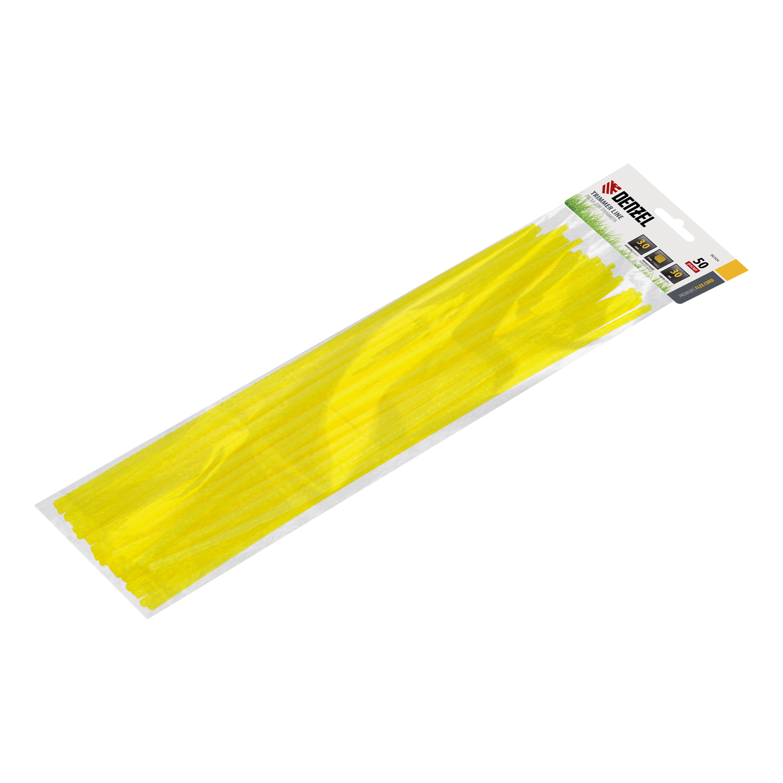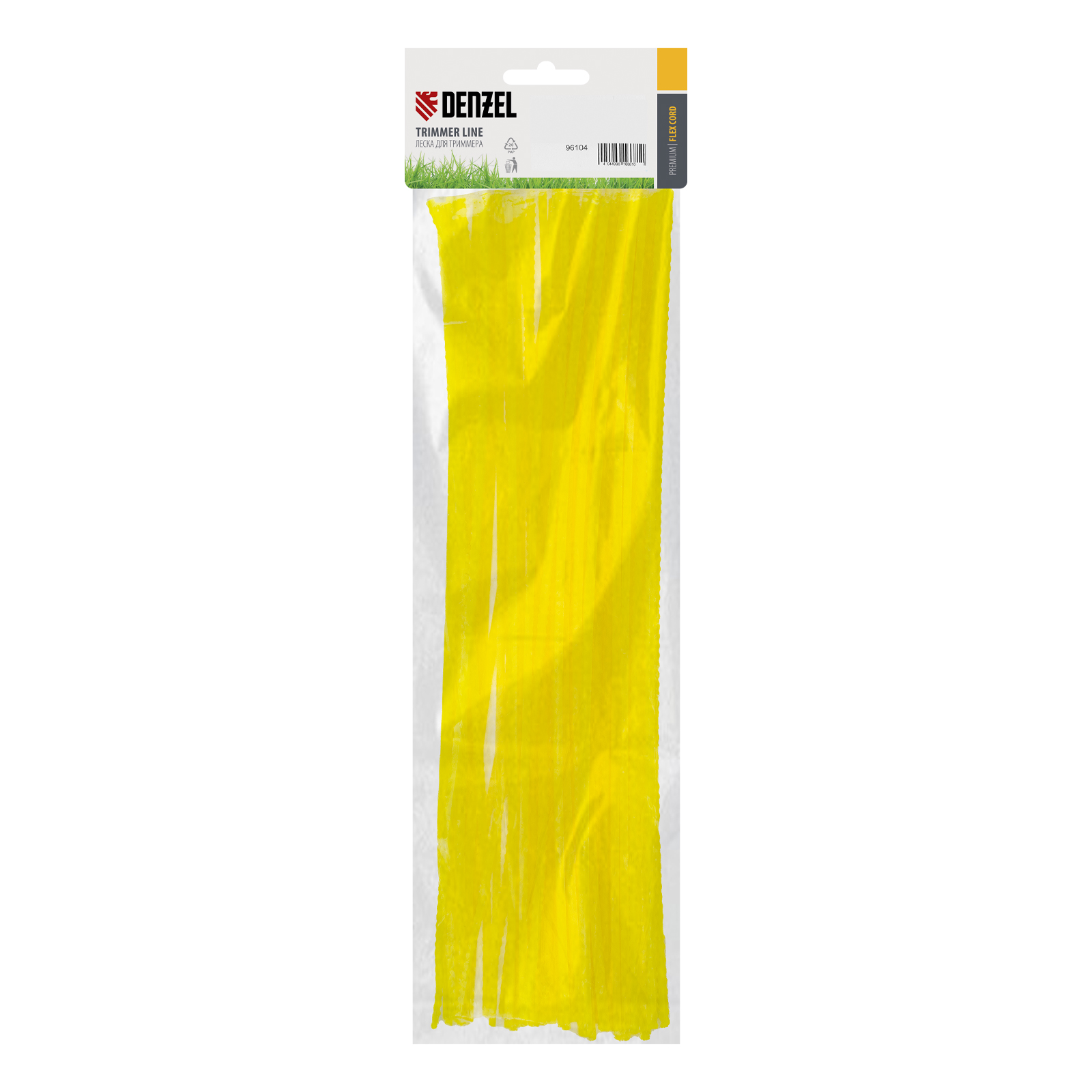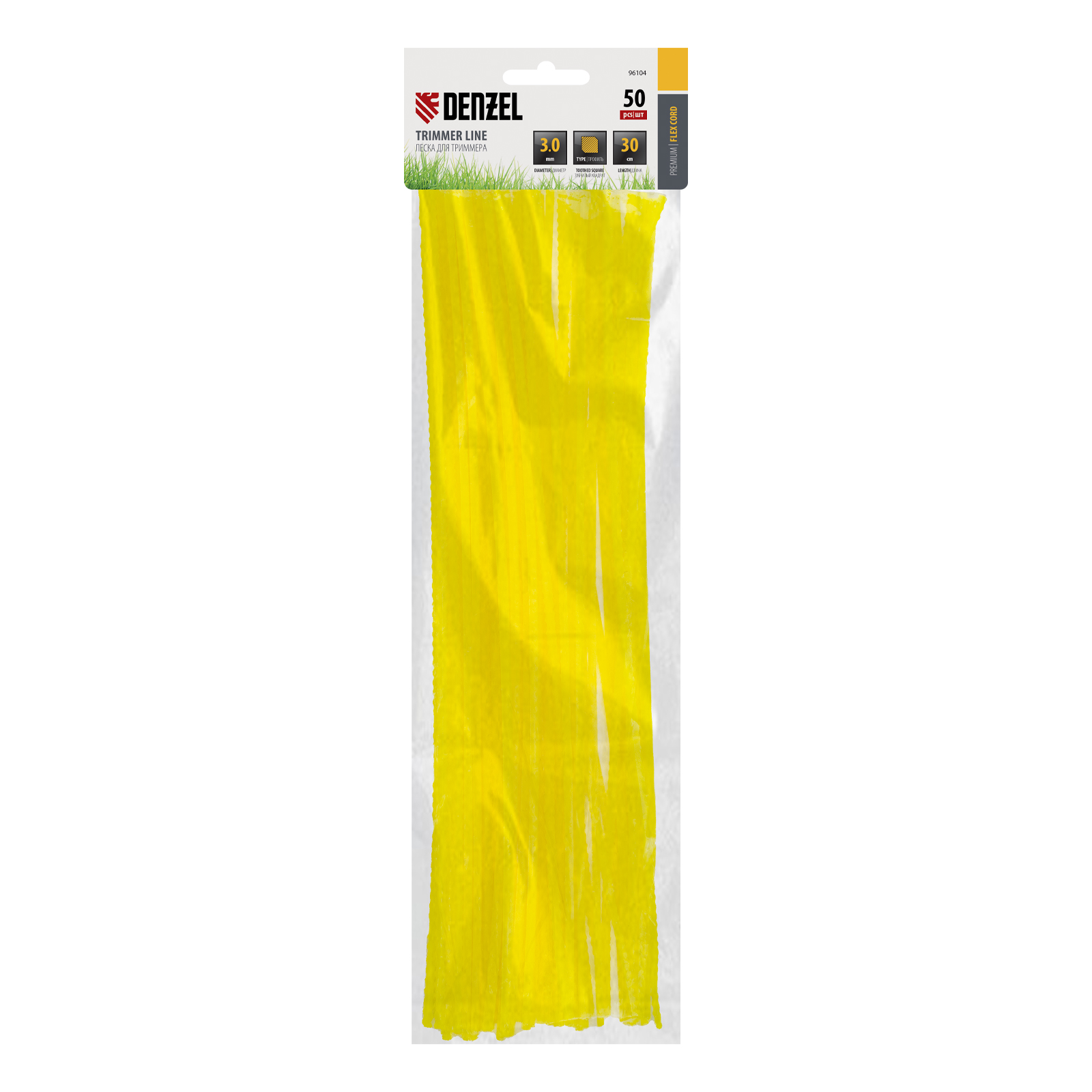 Нарезанная леска для триммера Denzel FLEX CORD 96104 с сечением «зубчатый квадрат», толщиной 3 мм и длиной 30 см, поставляется упаковками по 50 шт. и является сменным режущим элементом для триммерной головки. Применяется для срезания зарослей густой травы и сорняков с толстыми стеблями на участках большой площади. Леска устанавливается на бензотриммеры.