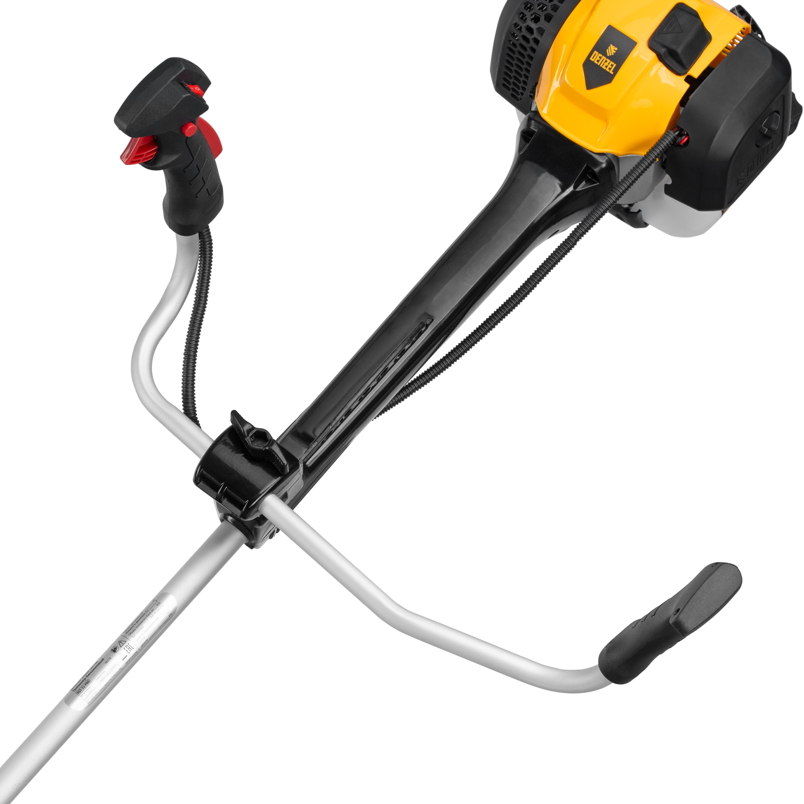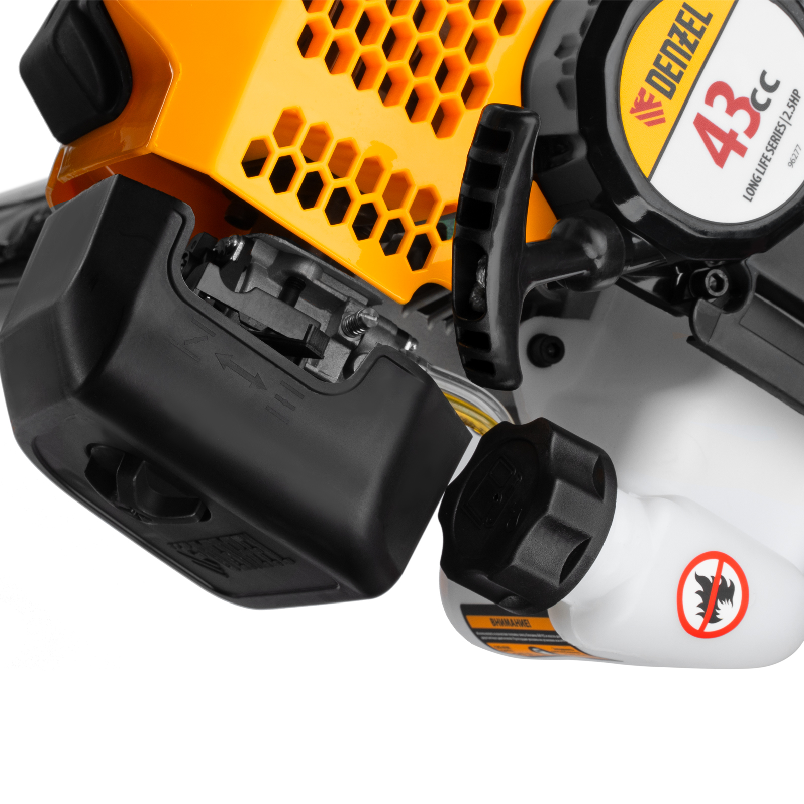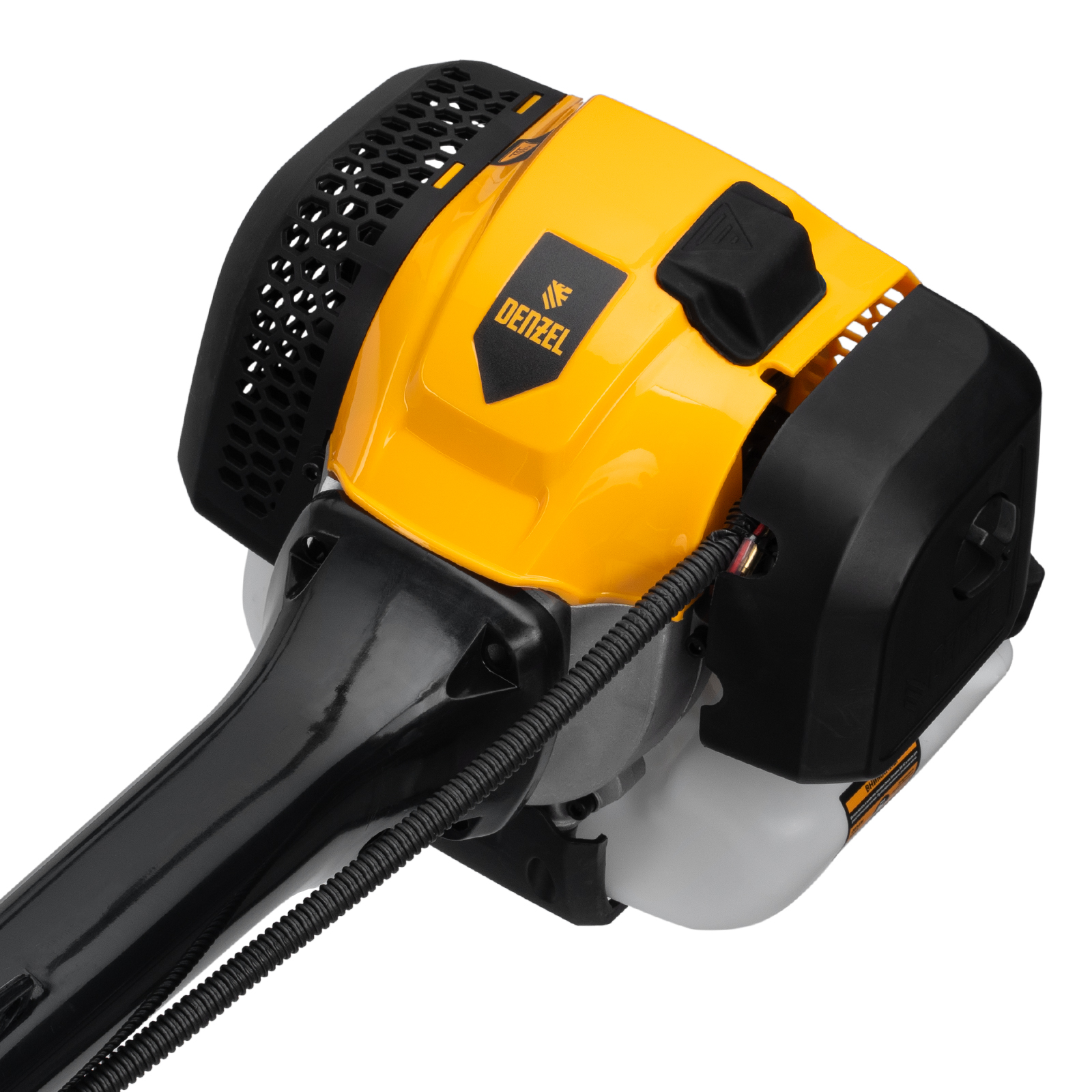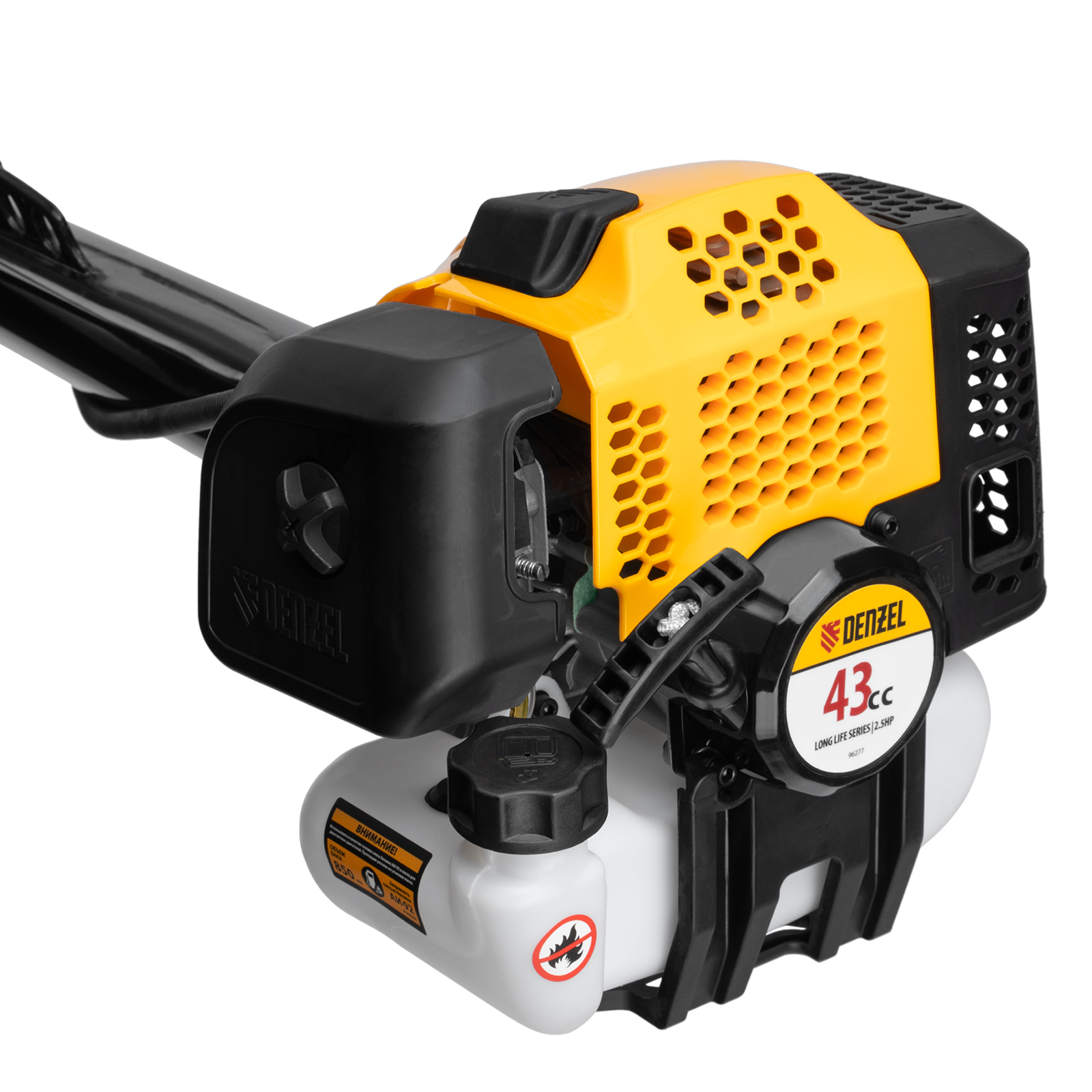 Бензиновый триммер Denzel DGT-43-PRO 96277 с системой анти-вибро и неразъемной штангой состоит из 2 частей и оснащен двигателем объемом 43 куб. см. Способен скашивать не только газонную траву, но и растительность с жесткими древовидными стеблями (полынь, крапиву, лебеду, борщевик), а также срезать кустарник и молодые побеги деревьев со стволами диаметром до 10 мм. Триммер эффективно справляется с поставленными задачами благодаря катушке с леской, трехлопастному ножу и пильному диску. За 1 час можно обработать участок площадью до 20 соток.