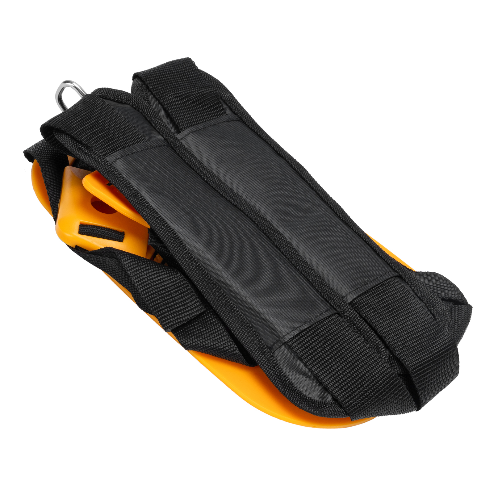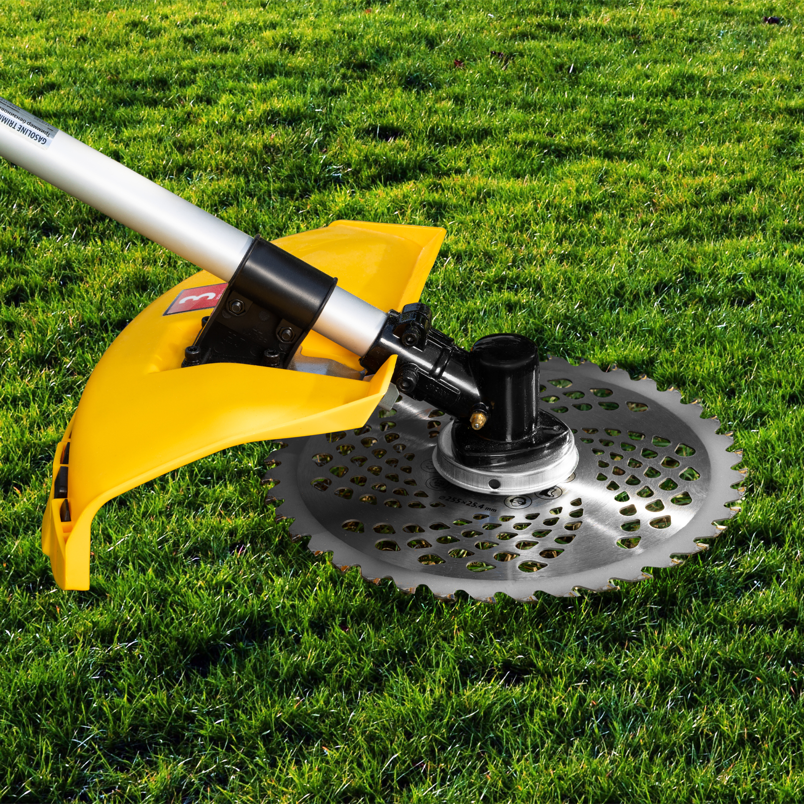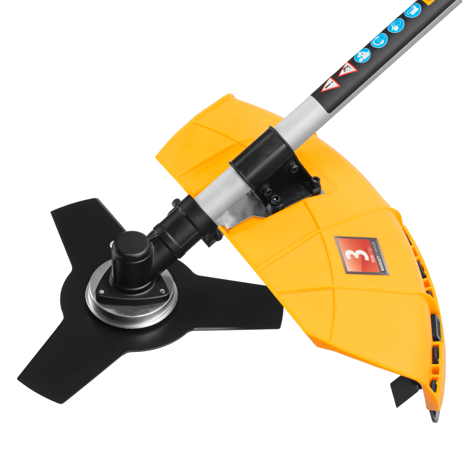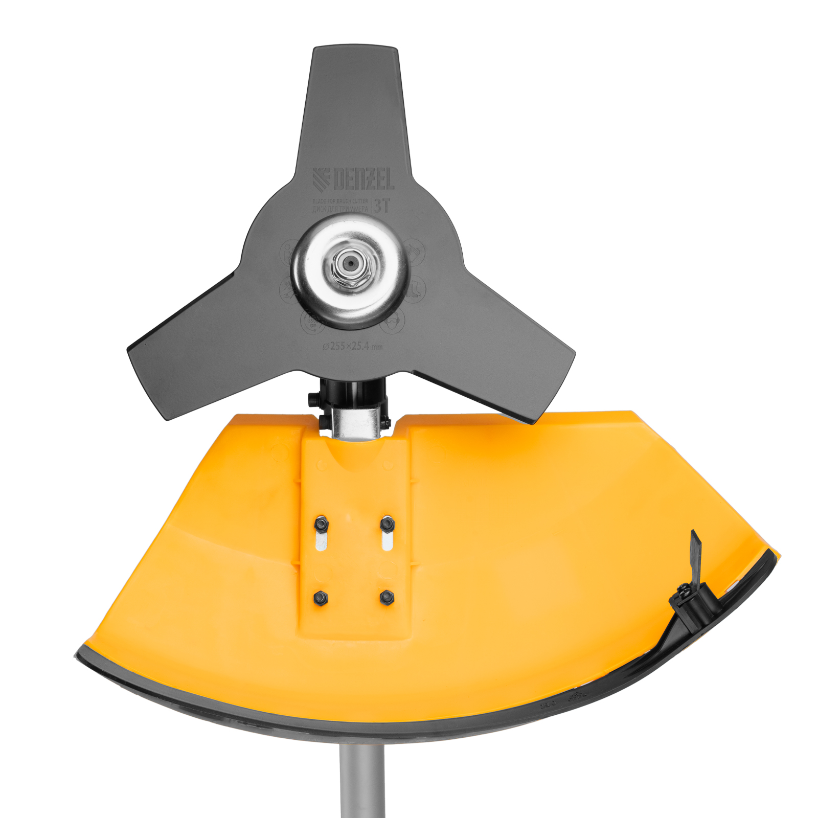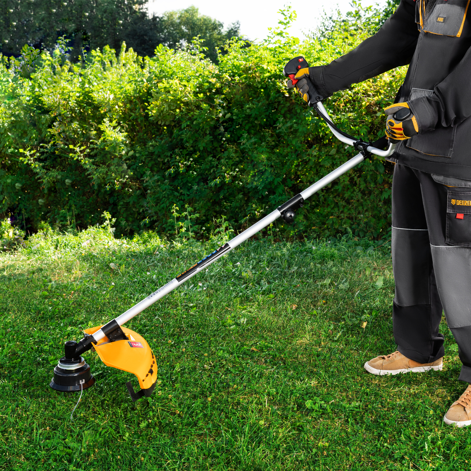 - Безопасность — защитный кожух из прочного пластика закрывает режущую часть, а блокиратор курка газа исключает случайный запуск двигателя.