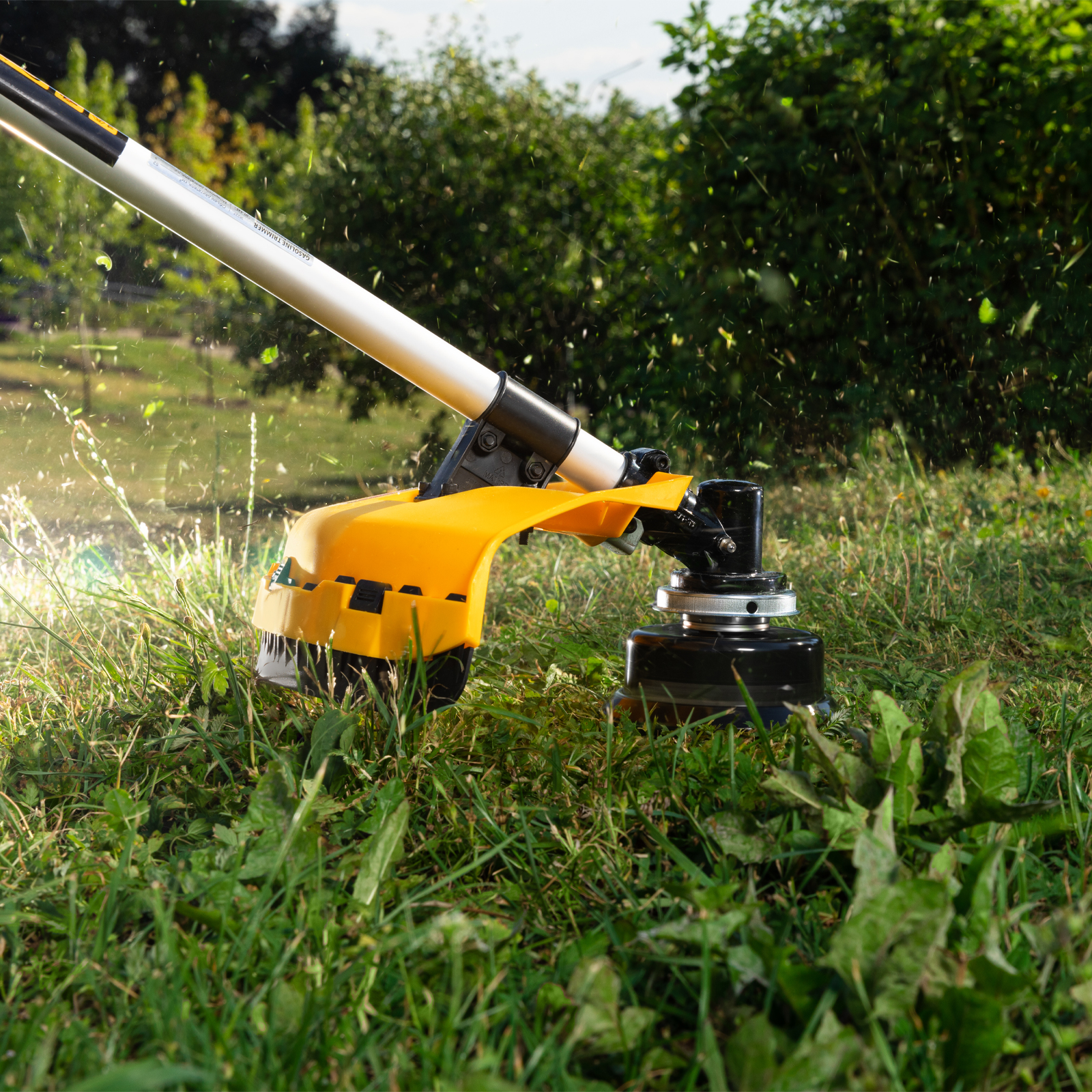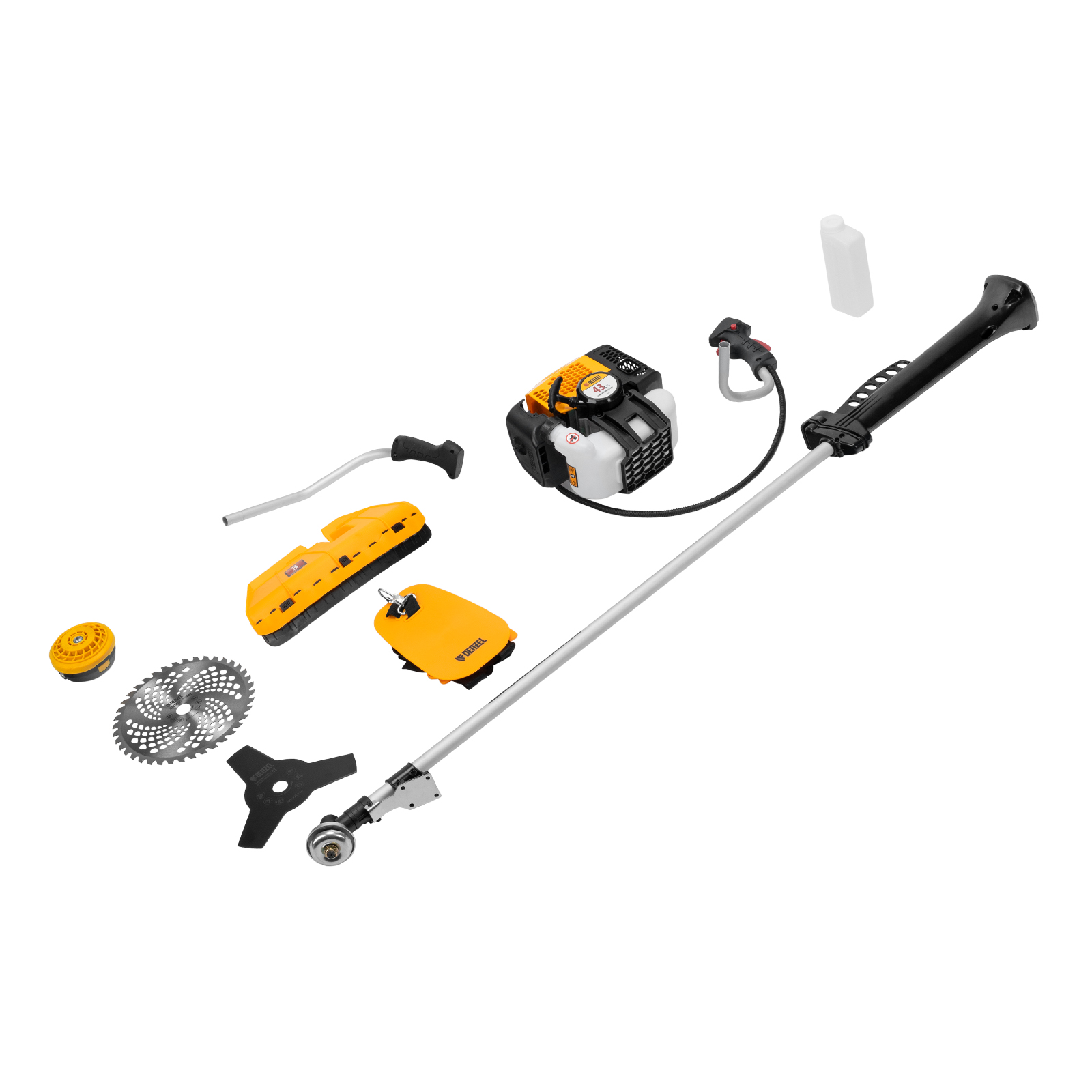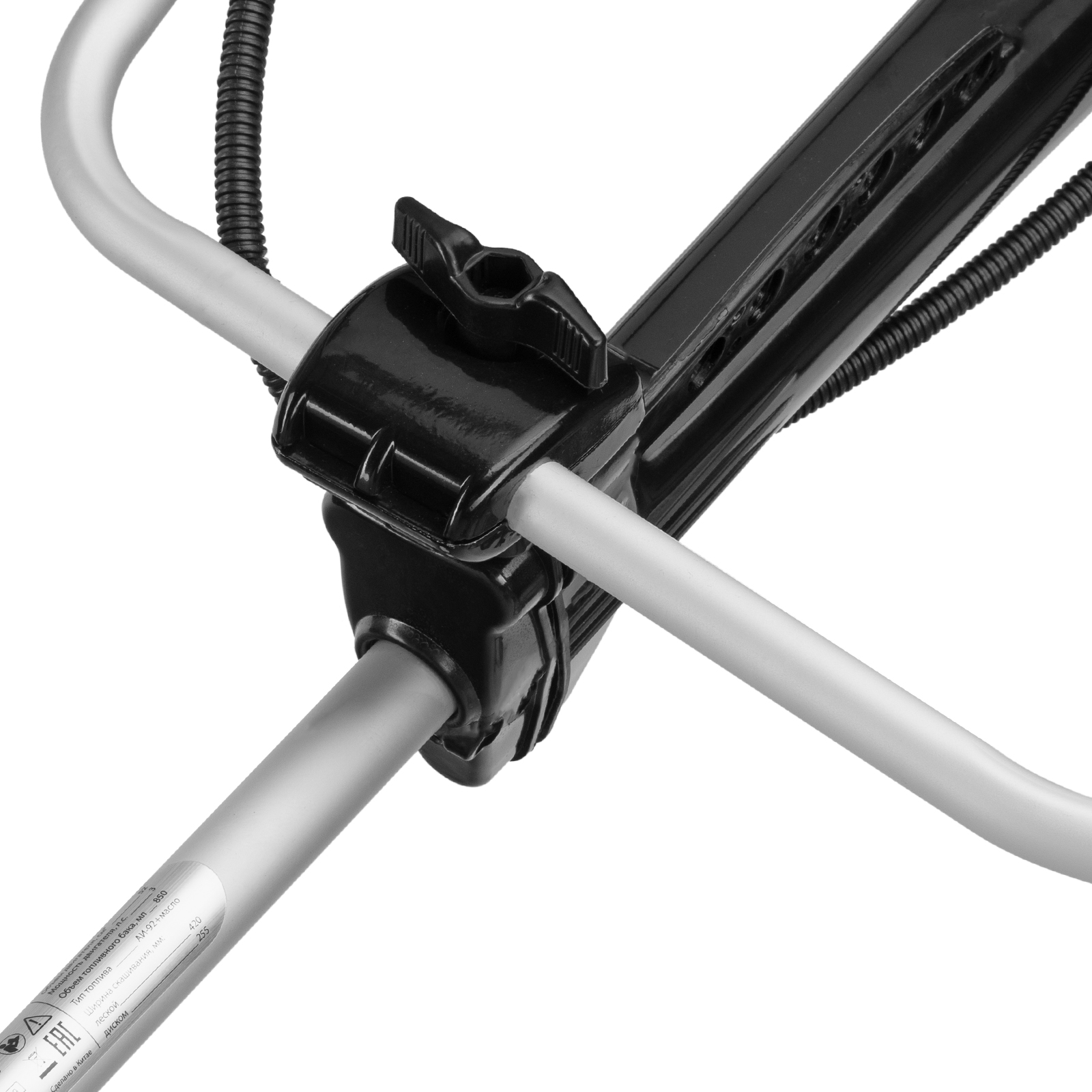 Надежный двухтактный двигатель мощностью 2,5 л.с. обеспечивает скорость вращения оснастки 9500 об/мин, благодаря чему триммер эффективно борется с густой травой. Редуктор и корпус сцепления поставляются уже установленными на штангу, что упрощает процесс финальной сборки инструмента.