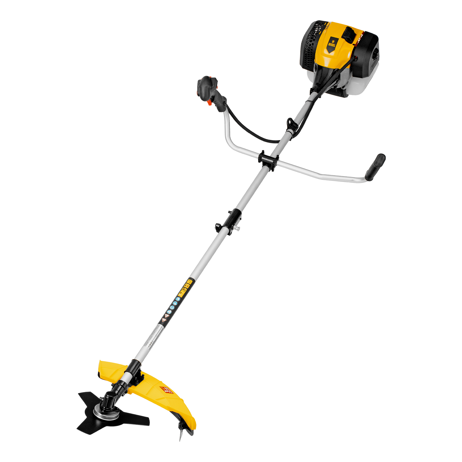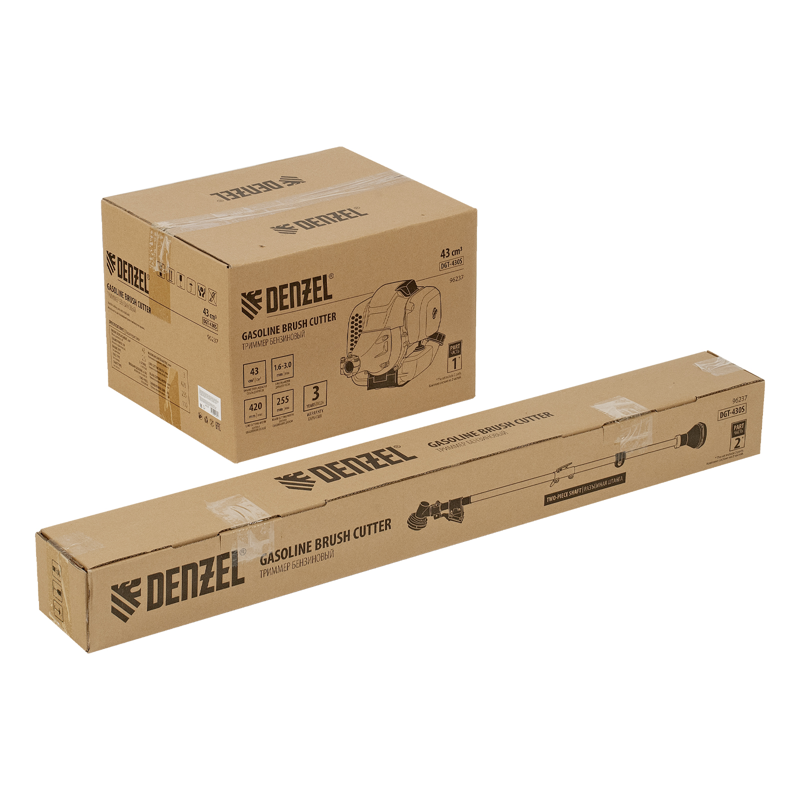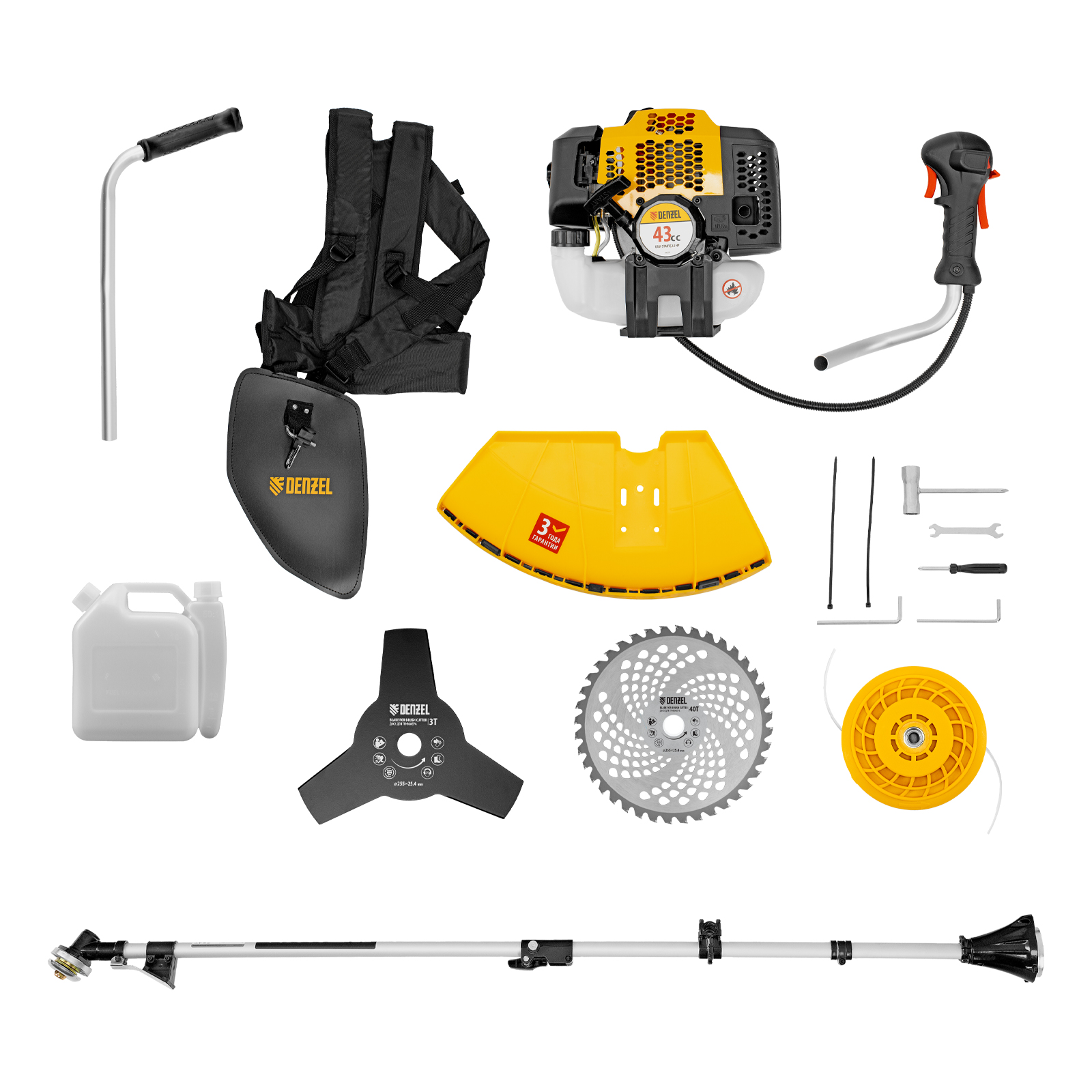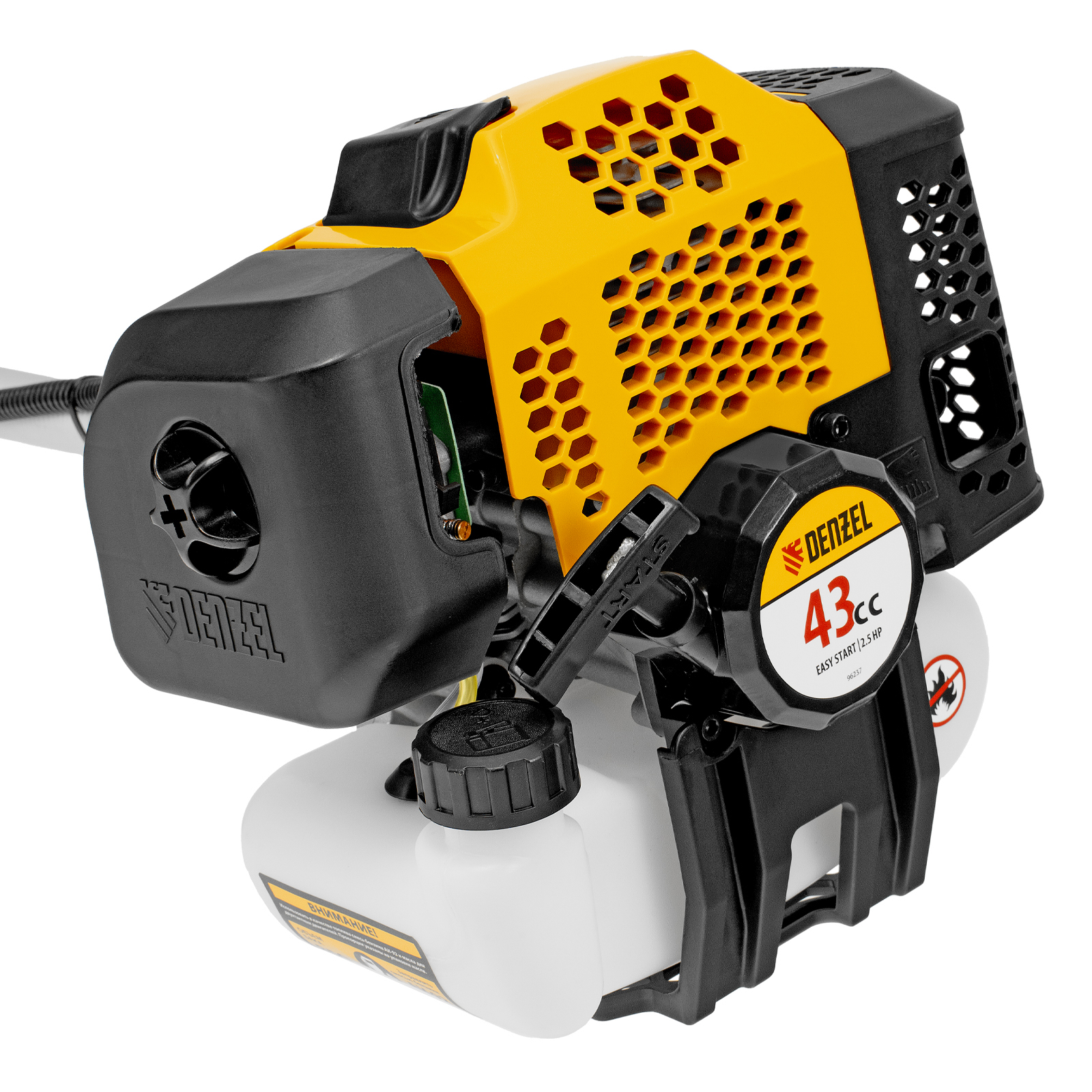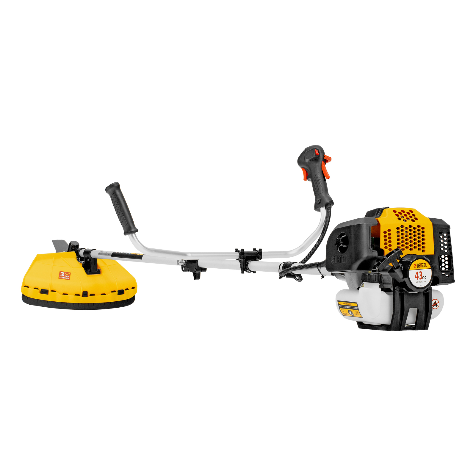 Бензиновый триммер Denzel DGT 430S 96237 с двигателем объемом 43 см3, мощностью 2,5 л. с., с разъемной штангой, состоит из 2 частей. Оптимально подходит для ухода за газоном, скашивания травы всех типов, в том числе с жесткими стеблями (полыни, крапивы, лебеды), борьбы с борщевиком, а также срезания кустарника и молодых побегов деревьев с диаметром стволов до 10 мм. Триммером удобно работать в недоступных для колесной газонокосилки мест: вокруг деревьев, около стен и заборов, у кромок дорожек. Экономичный двигатель мощностью 2,5 л.с. отличается высоким ресурсом и долговечностью. Триммер комплектуется 3 оснастками: усиленной полиамидной катушкой, трехлопастным ножом и пильным диском.