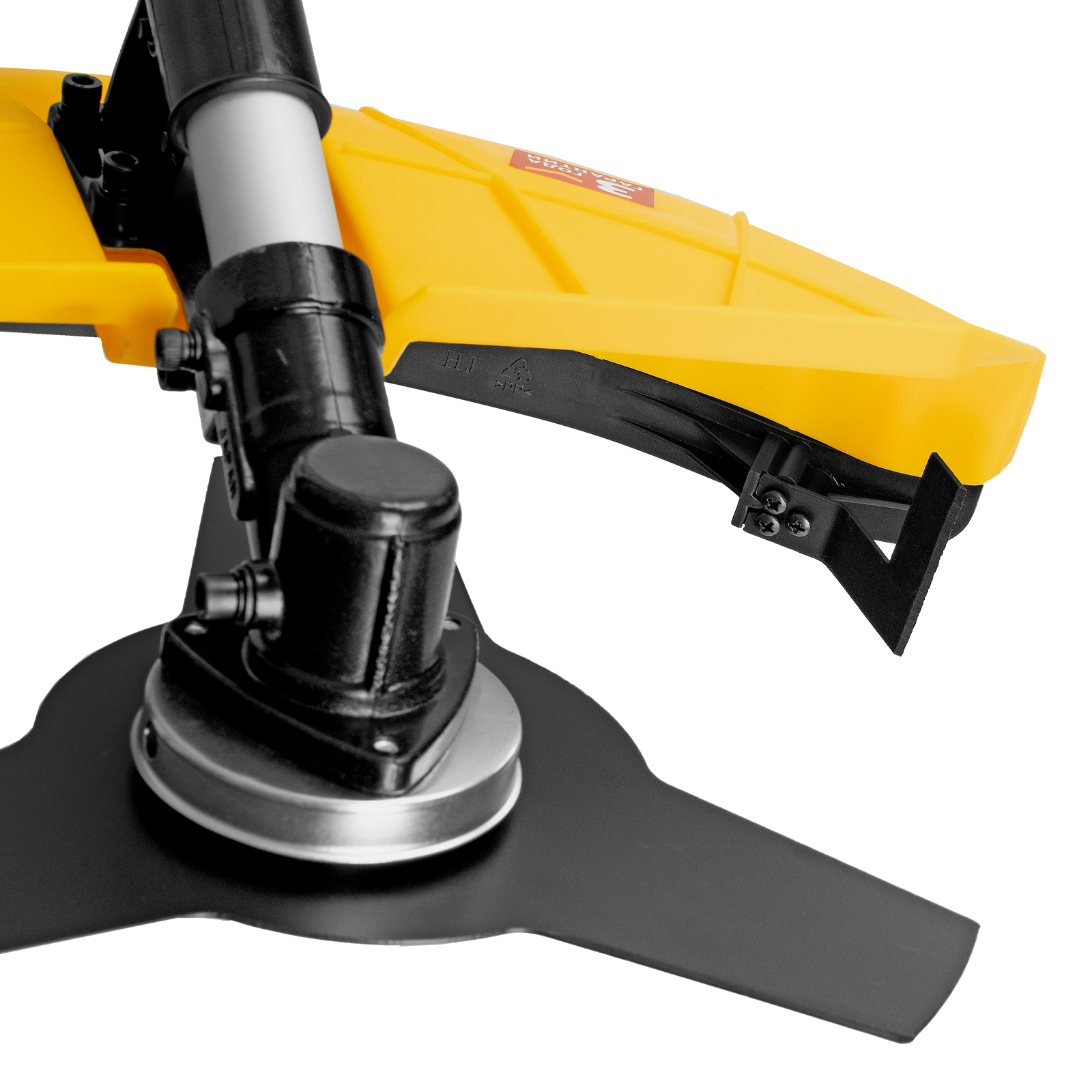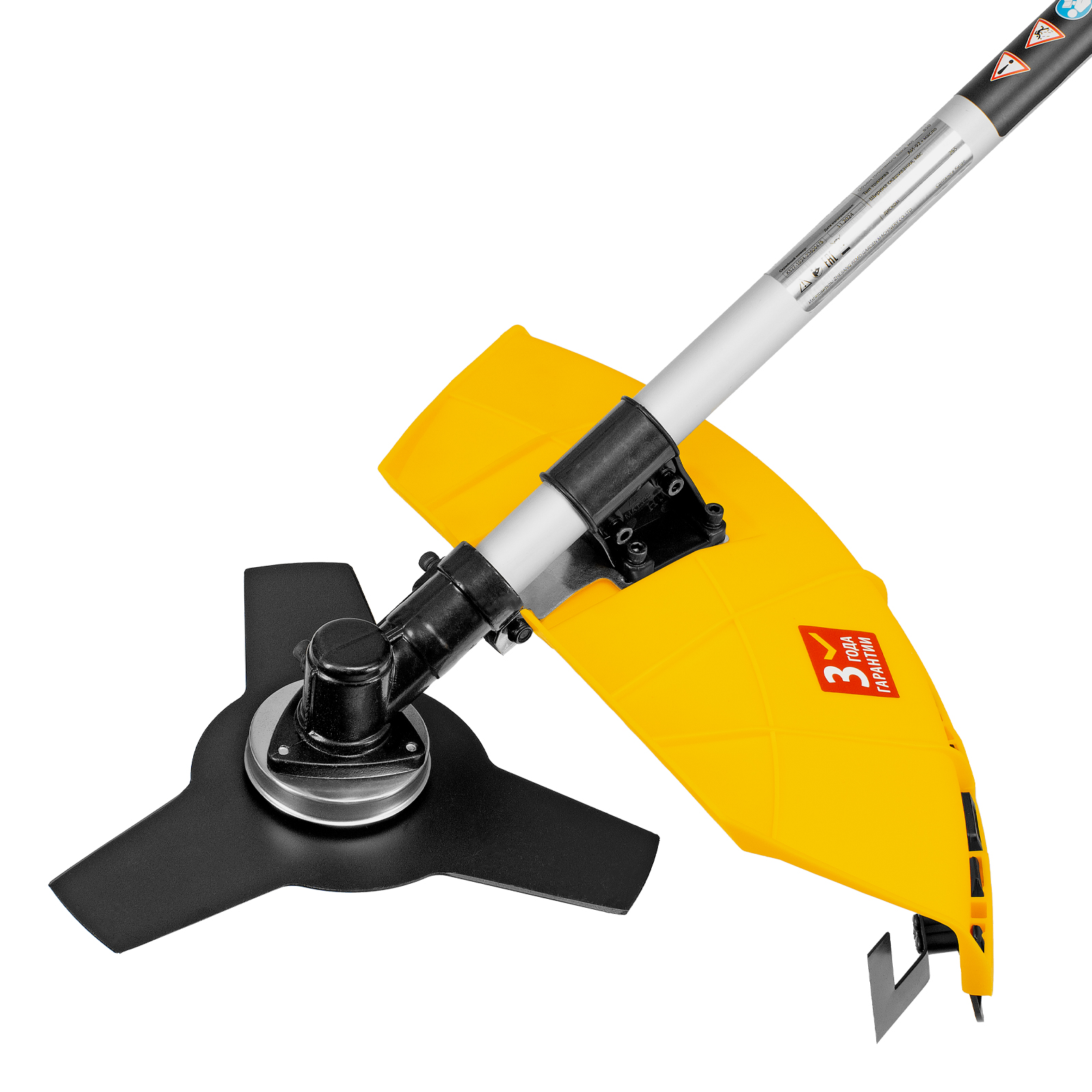 - Безопасная работа — пластиковый кожух защищает пользователя от вылетающей травы и мелких частиц.