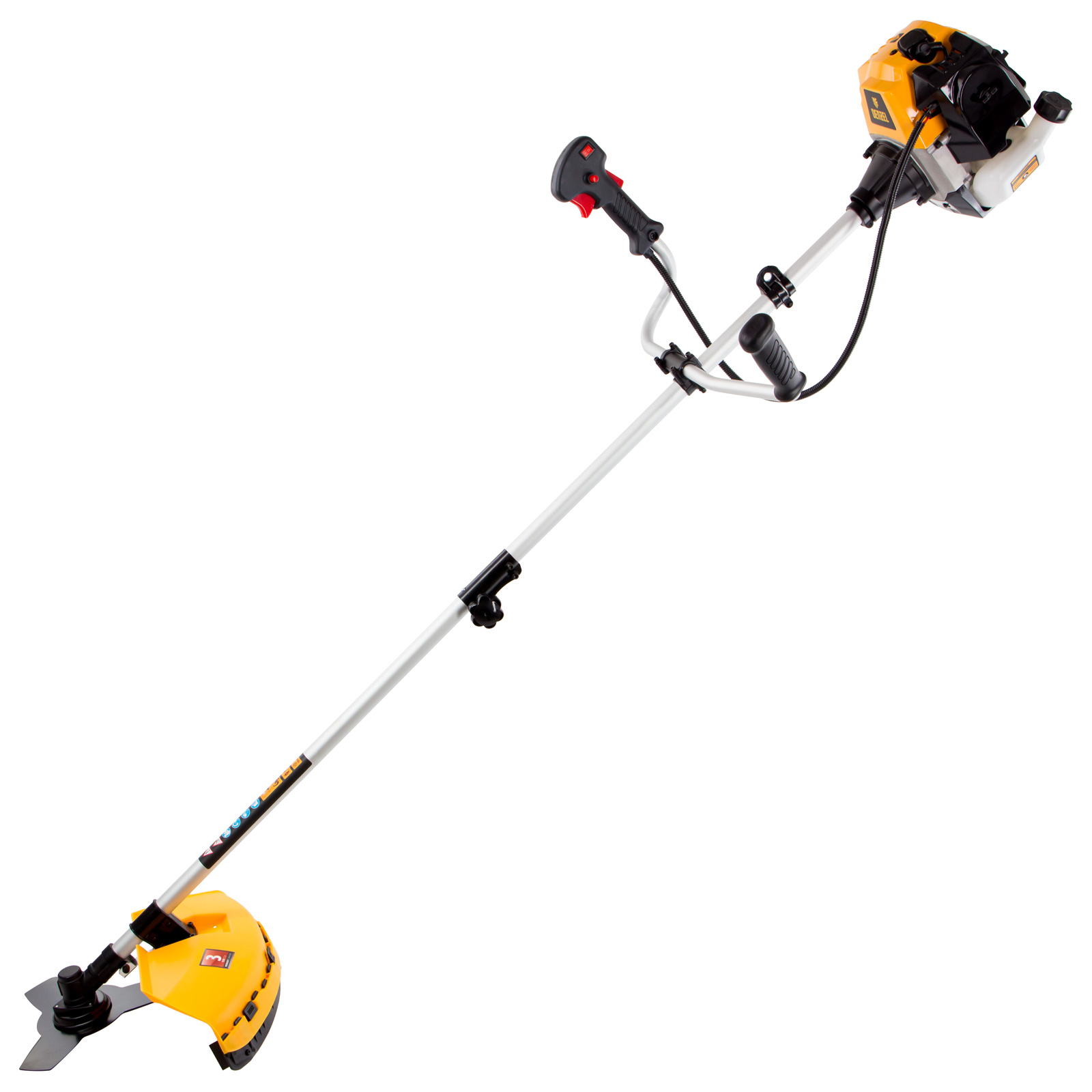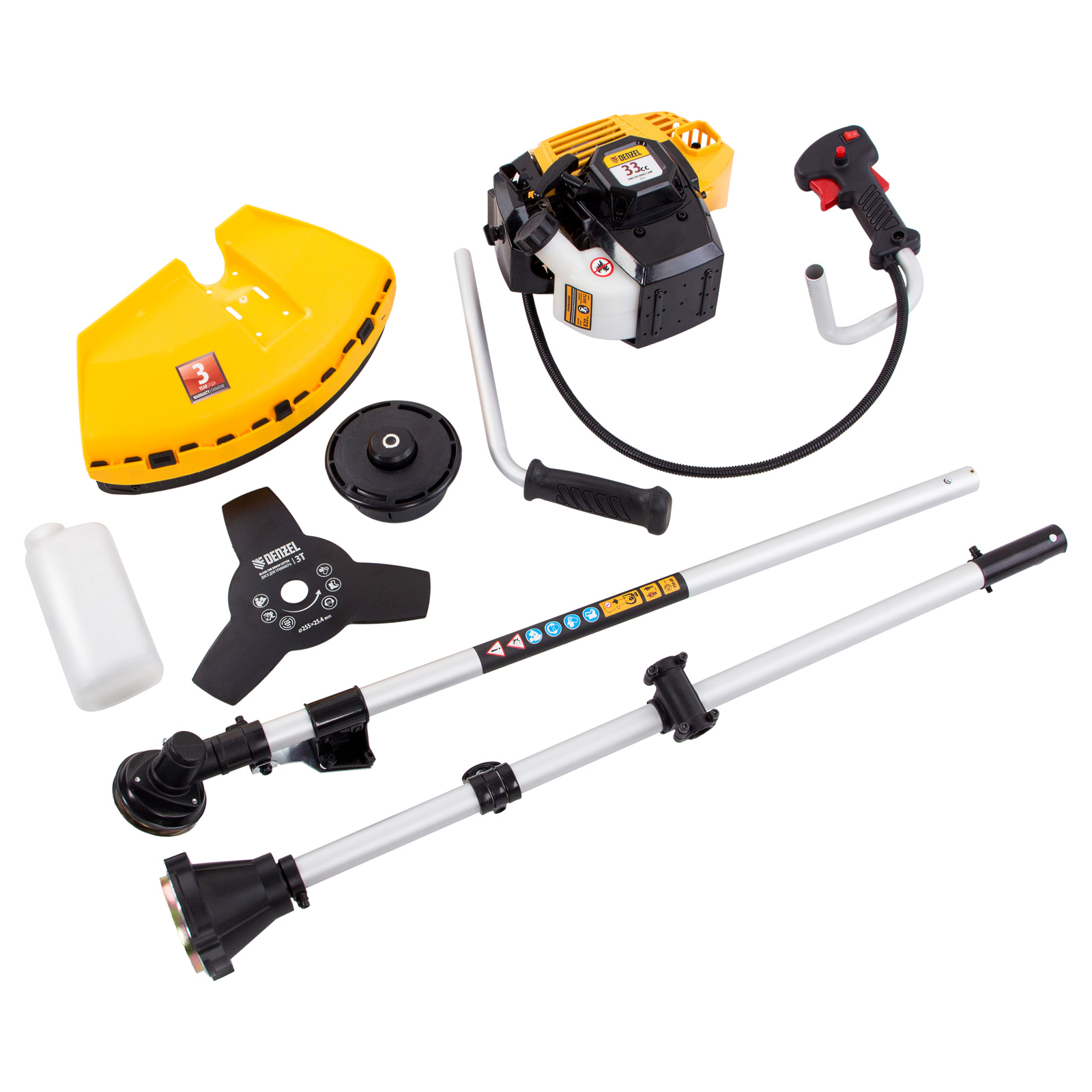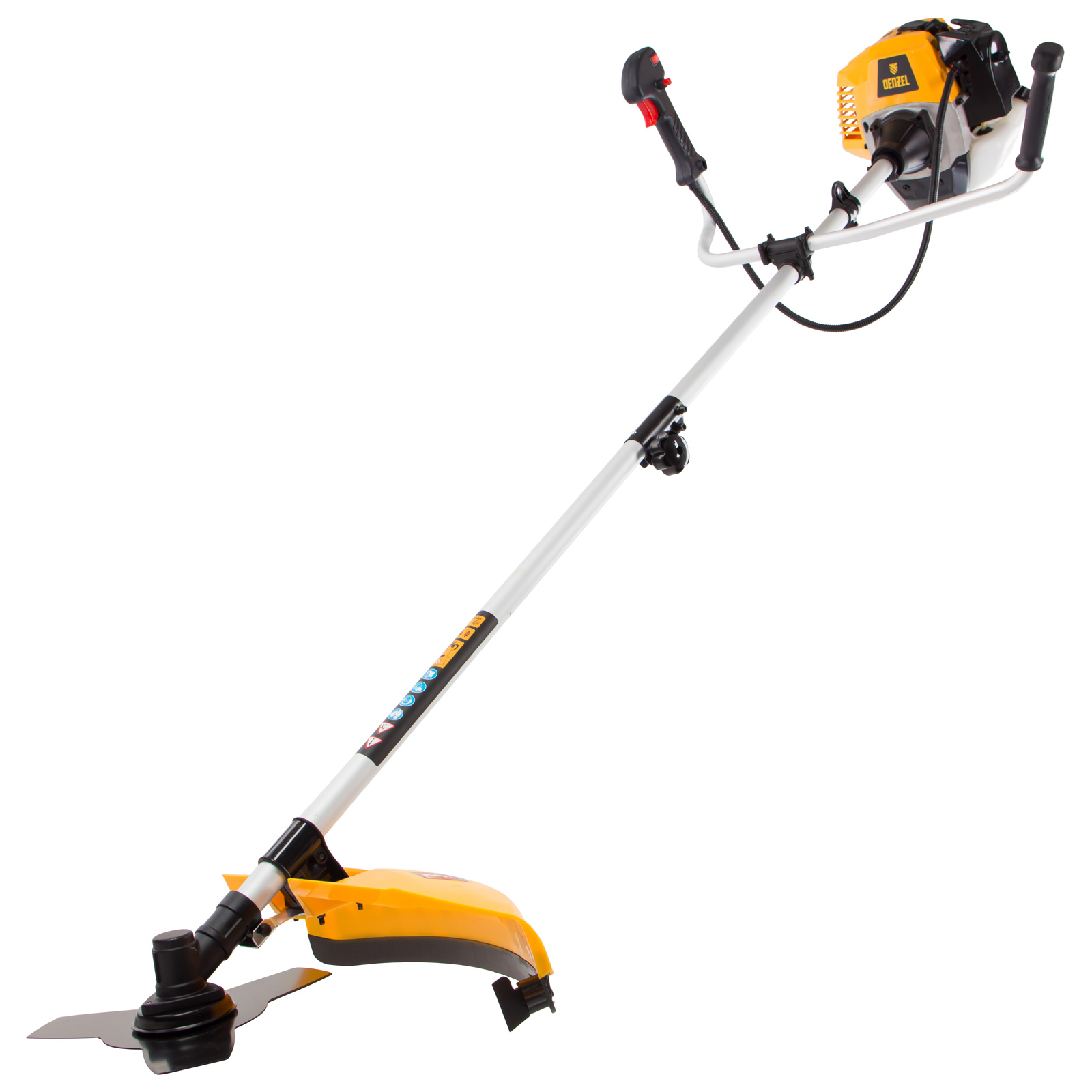 Бензиновый триммер Denzel DR-33S 96272 с двигателем объемом 33 см3 и разъемной штангой, состоит из 2 частей. Используется для ухода за газоном, скашивания травы различных типов, в том числе с жесткими стеблями (полынь, крапива, лебеда). Триммер эффективен на сложных участках: вдоль стен, в ямках и на возвышенностях, вокруг деревьев. Две режущие насадки — трехлопастный нож и катушка с леской — вращаются со скоростью 9500 об/мин, обеспечивая ширину скашивания 25,5 и 42 см. ,Эффективную работу инструмента обеспечивает двухтактный двигатель мощностью 1,8 л.с. При этом триммер экономично расходует топливо, поэтому часто заправлять его не придется.