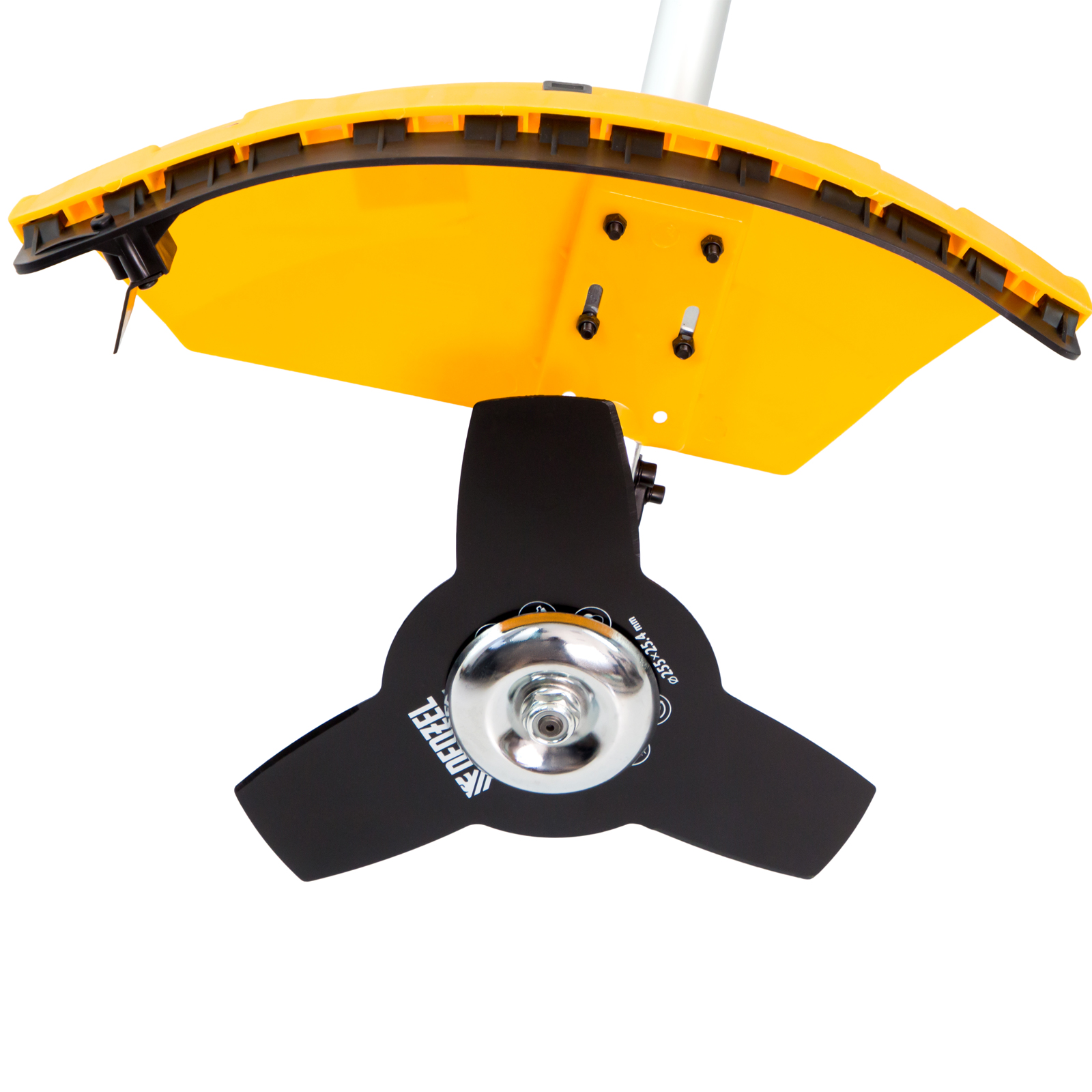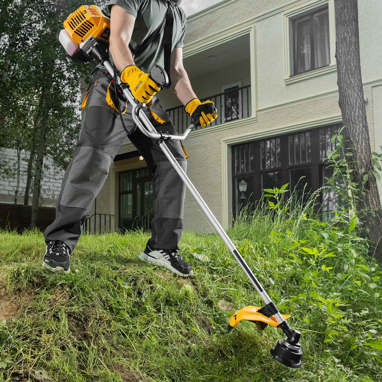 Бензиновый триммер Denzel DR-43 96273 с двигателем объемом 43 см3 и неразъемной штангой состоит из 2 частей и предназначен для ухода за газоном и формирования у него ровных границ, скашивания травы различных типов, в том числе с жесткими стеблями (полынь, крапива, лебеда). Удобен для работы в самых труднодоступных местах — на овражках, вокруг деревьев, вдоль стен и заборов. Эффективное решение этих задач обеспечивают режущие насадки — трехлопастный нож из стали и усиленная катушка из полиамида с леской. Они вращаются со скоростью 9500 об/мин, ширина скашивания составляет 25,5 и 42 см.,Инструмент не нужно включать в розетку, поэтому с ним можно работать в удаленных от дома уголках. Комплект поставки состоит из 2 частей для удобства транспортировки. Редуктор и корпус сцепления уже установлены на штангу, что облегчает его окончательную сборку.