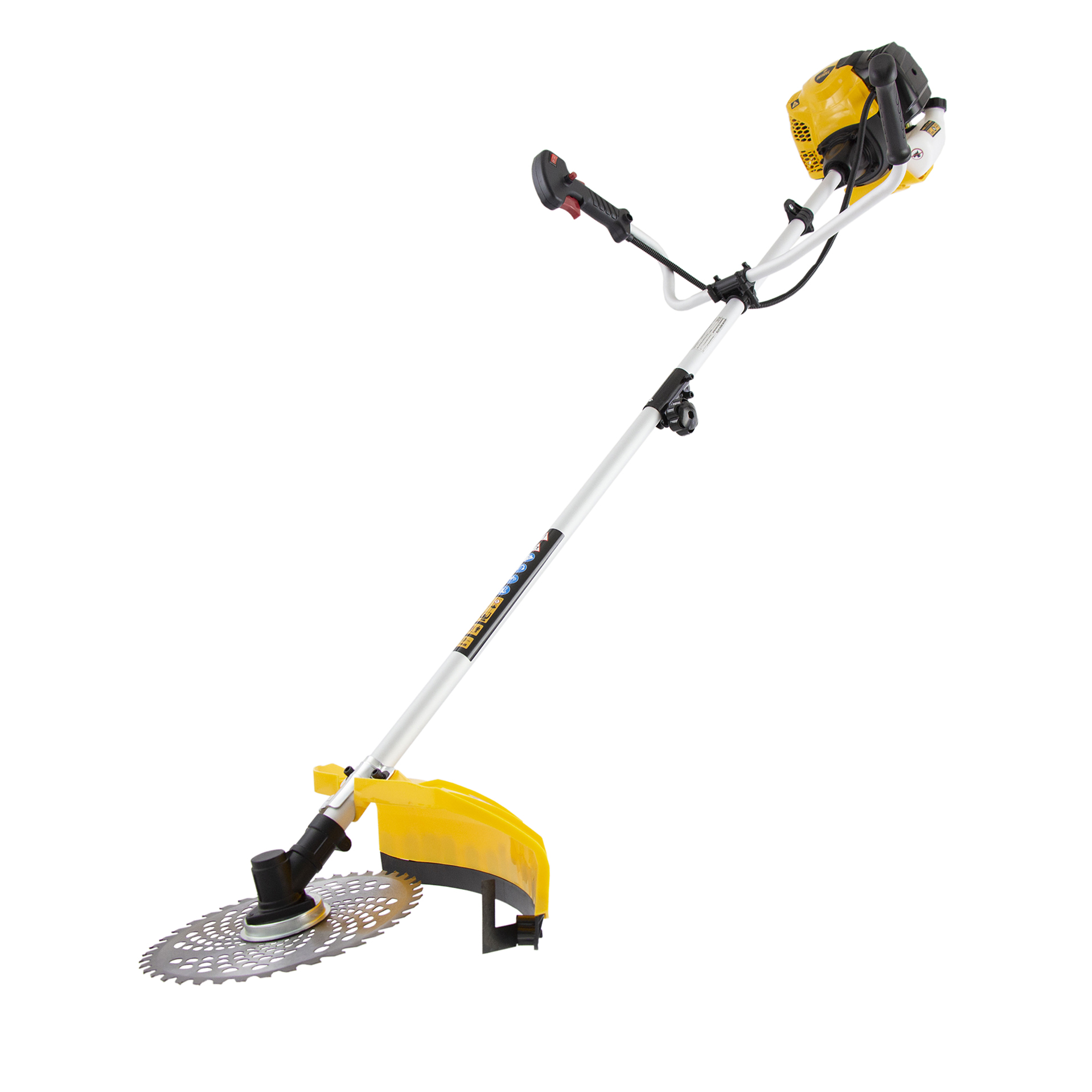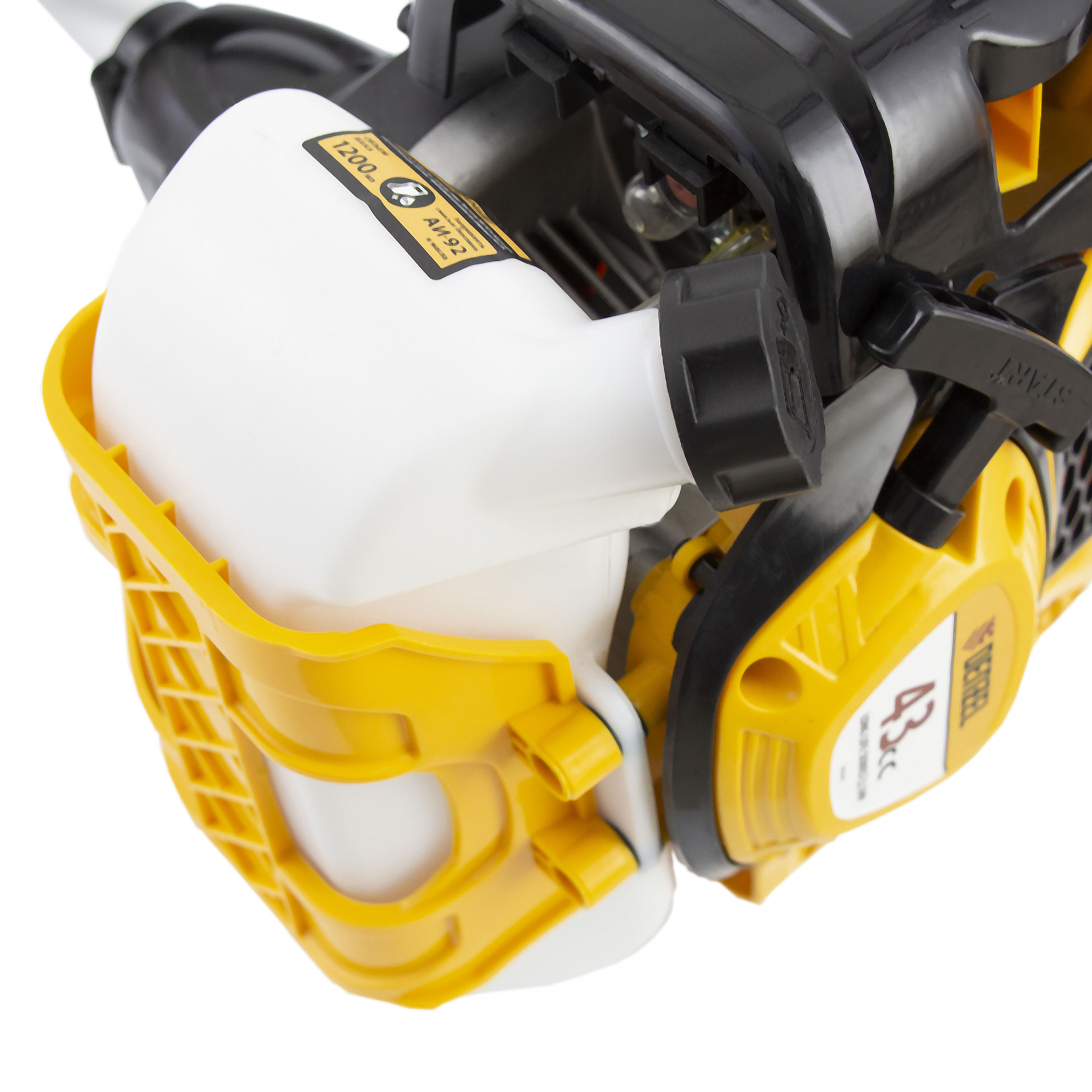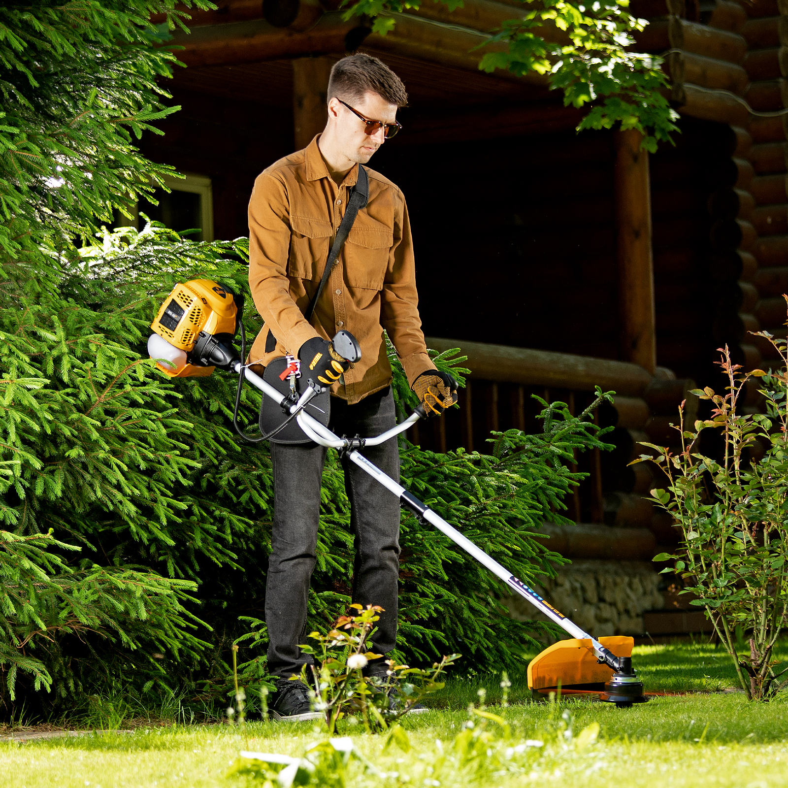 Бензиновый триммер Denzel DTL-43S 96264 с разъемной штангой, состоящей из 2 частей, оснащен 2-тактным двигателем объемом 43 см3 и предназначен для стрижки газона, скашивания травы всех типов, в том числе с жесткими древовидными стеблями (полыни, крапивы, лебеды, борщевика), а также срезания кустарника и молодых побегов деревьев с диаметром стволов до 10 мм. Усиленная катушка с леской и пильный диск, вращающиеся со скоростью 9500 об/мин, обеспечивают ширину скашивания 42 и 25,5 см. Инструмент не требует подключения к электросети, поэтому подходит для работы с влажной травой и может использоваться на отдаленных от дома участках.