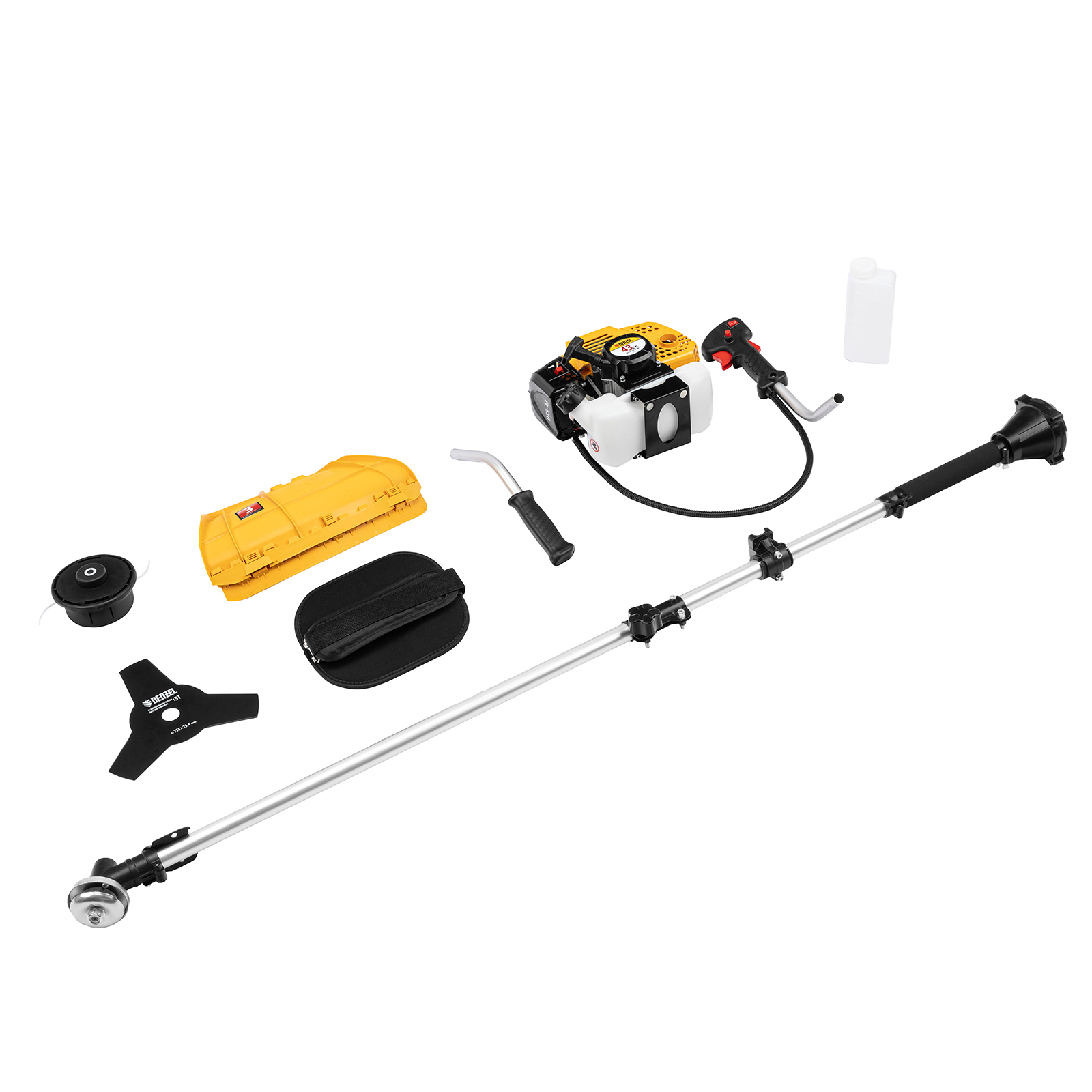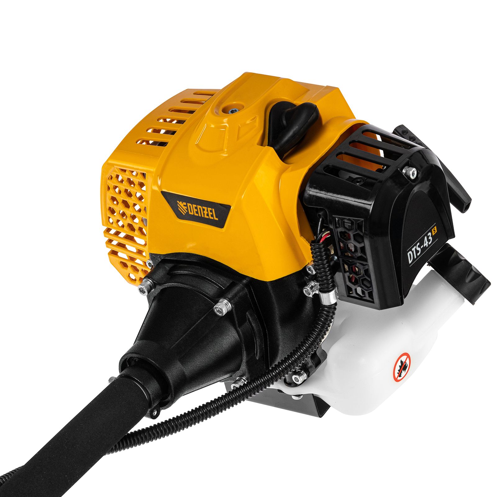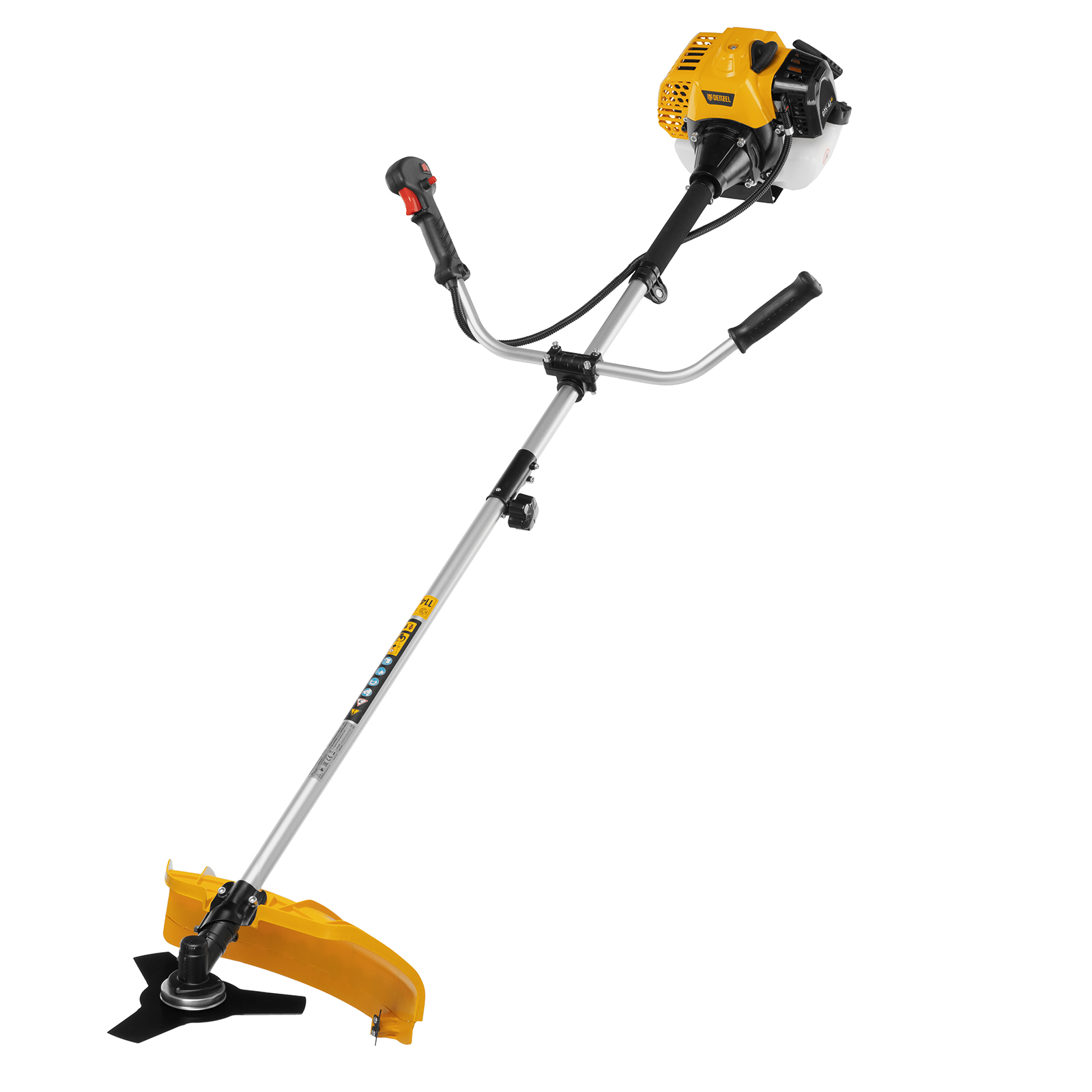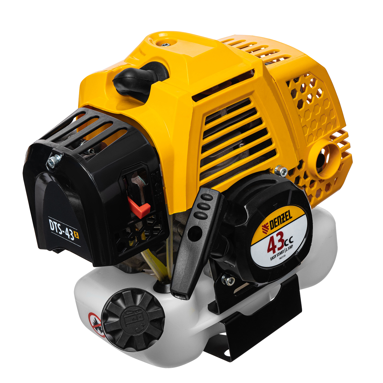 Бензиновый триммер Denzel DTS-43S 962145 с двигателем объемом 43 куб. см и разъемной штангой (состоит из 2 частей), используется для выравнивания кромок газонов, скашивания травы различных типов, в том числе с жесткими стеблями (полыни, крапивы, лебеды). Комплектуется двумя режущими оснастками — усиленной катушкой с леской и трехлопастным стальным ножом. Ширина скашивания леской составляет 42 см, а ножом — 25,5 см.,Двухтактный бензиновый двигатель мощностью 2,5 л.с. обеспечивает эффективное решение поставленных задач и полную автономность. Работать можно даже в самых отдаленных участках сада, не заботясь о наличии сети электропитания.