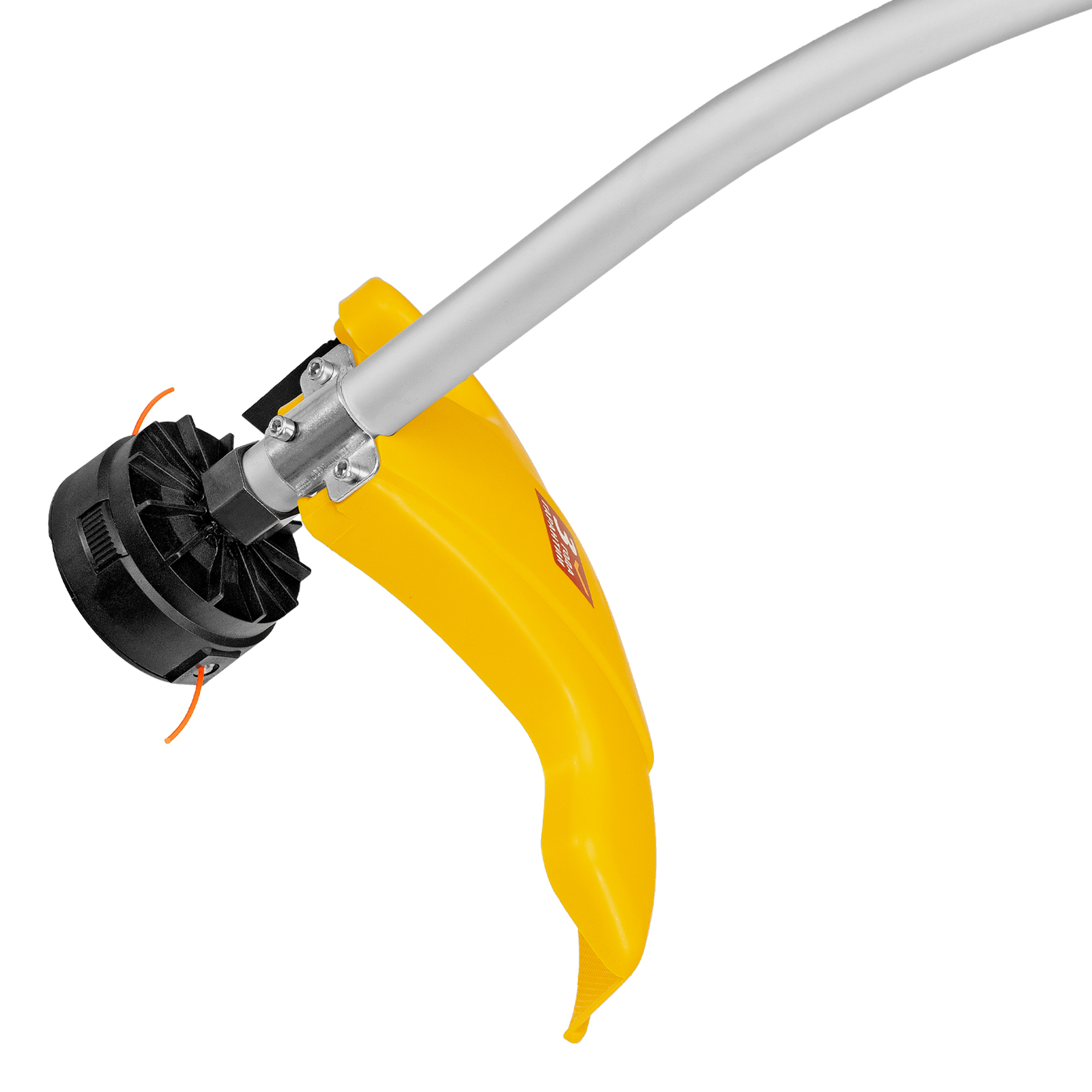 - Безопасность — блокировка выключателя препятствует случайному запуску, а защитный кожух предохраняет от летящей травы.