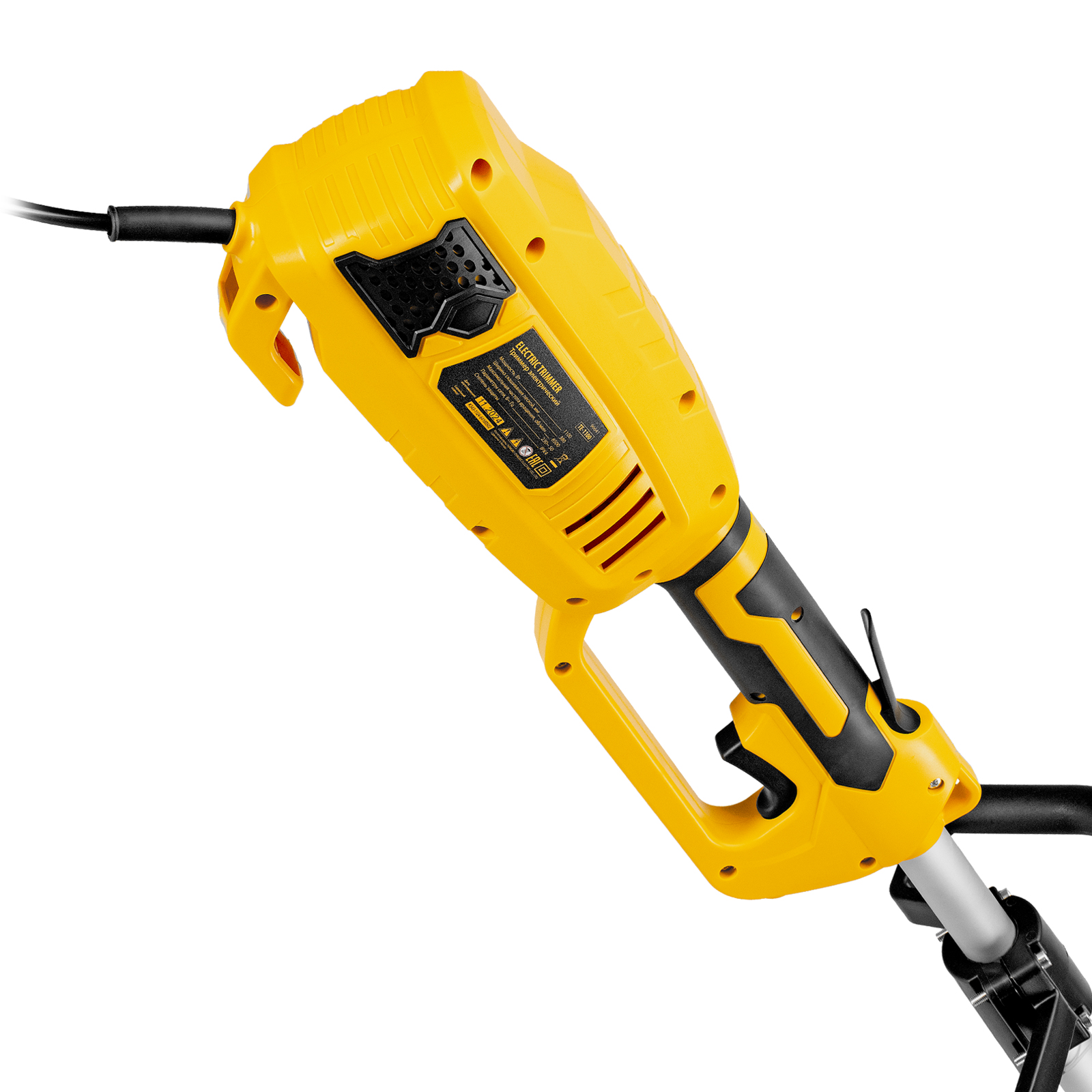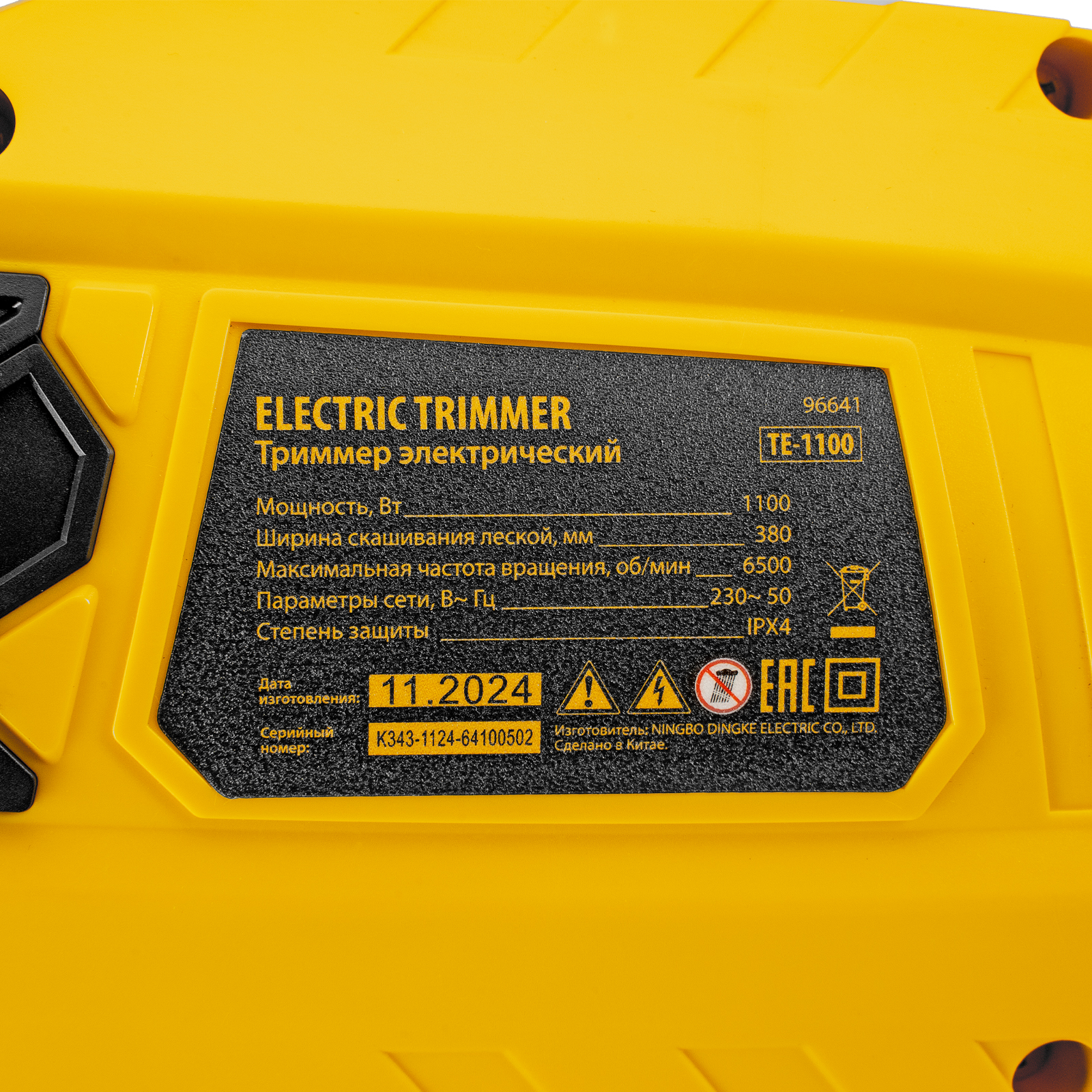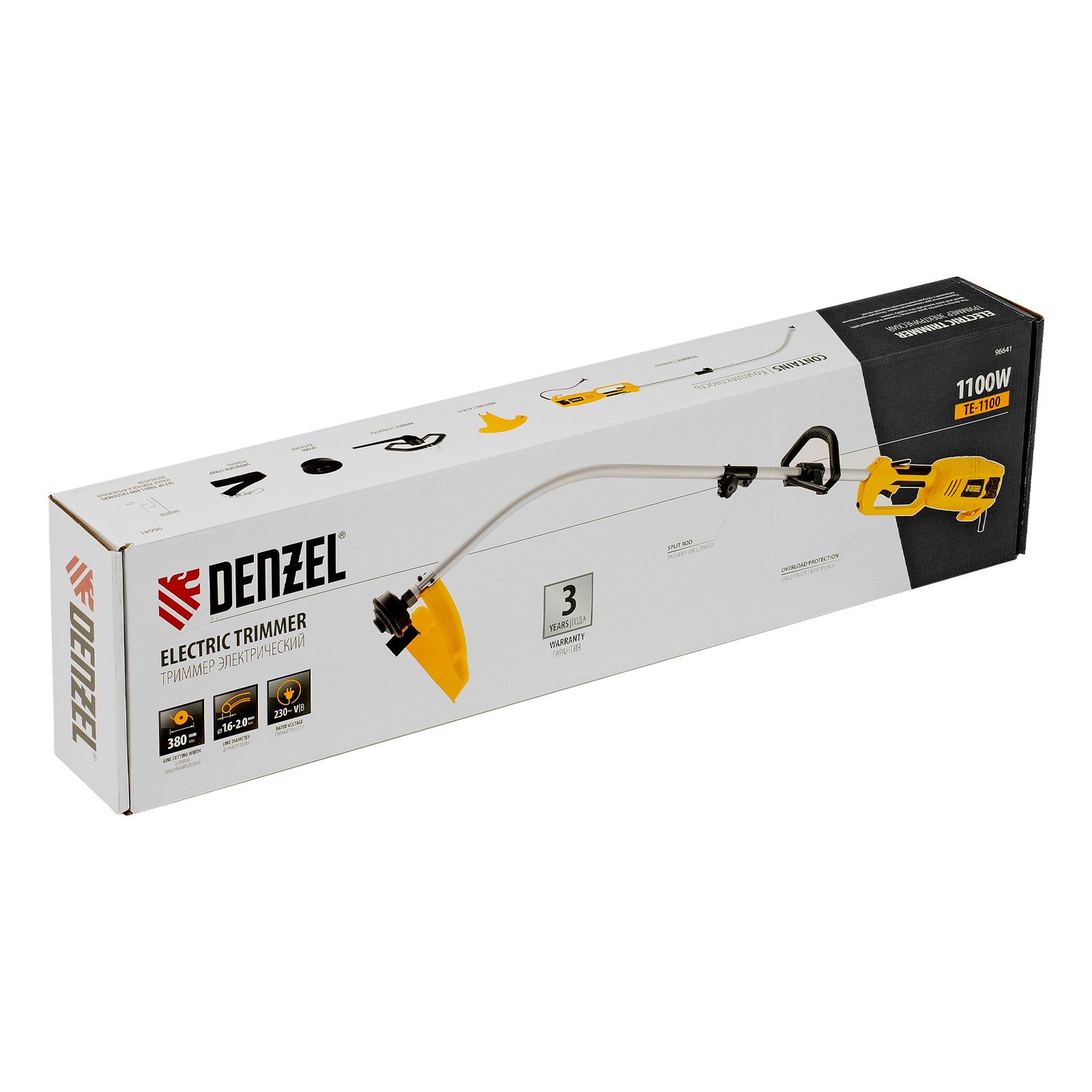 Электрический триммер Denzel TE-1100 96641 мощностью 1100 Вт, с разборной штангой и катушкой, предназначен для скашивания травы на дачном участке. Ширина прохода составляет 380 мм, что удобно для работы на небольших участках. Мощный двигатель обеспечивает вращение катушки со скоростью 6500 об/мин. Электродвигатель не требует приготовления топливной смеси и сложного технического обслуживания. Благодаря отсутствию вредных выбросов и неприятного запаха работа триммера для газона не вредит здоровью и не вызывает дискомфорт.,На триммер можно установить диск Denzel 96323 (приобретается отдельно) для быстрого удаления растительности с жесткими стеблями (полыни, крапивы, лебеды).