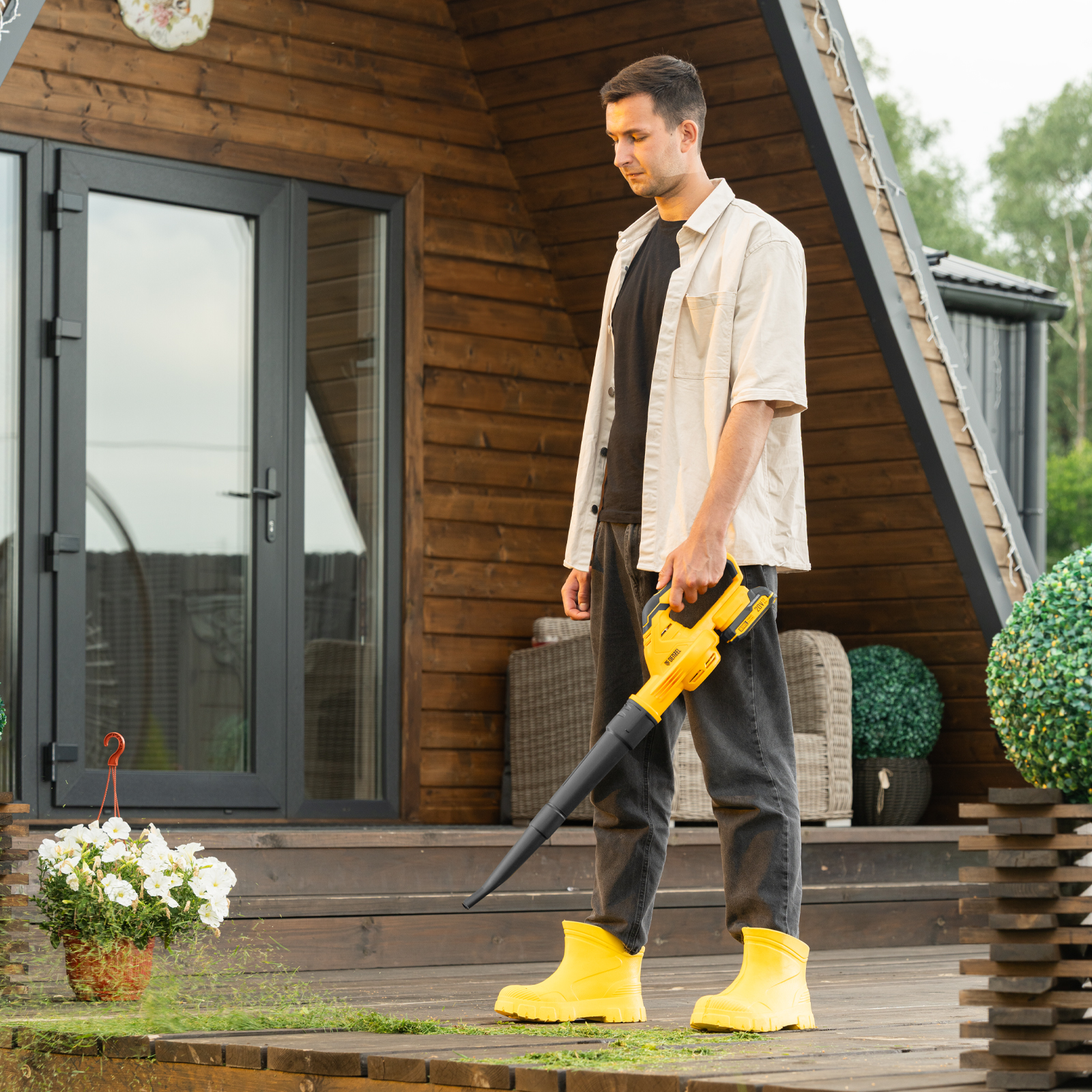 - Небольшой вес — масса воздуходувки с аккумулятором составляет 2,4 кг, поэтому ее удобно удерживать и направлять.