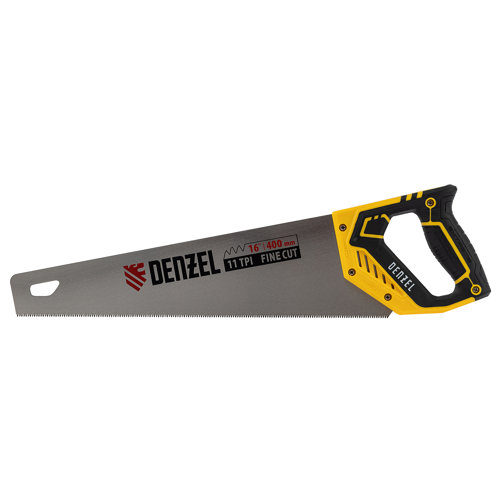 Ножовка по дереву Denzel 24146 длиной 400 мм, с зубьями с шагом 11 TPI и 3D-заточкой, с двухкомпонентной рукояткой, предназначена для продольной и поперечной распиловки заготовок из древесины, ДСП, ДВП, МДФ, ламината, а также из ПВХ (труб, панелей, коробов). Подходит для распиливания плинтусов, вагонки, деревянных профиле й. Мелкие зубья с шагом 11 TPI позволяют выполнять точный и чистый рез. Ножовка используется для проведения столярных работ в мастерской и на дачном участке.