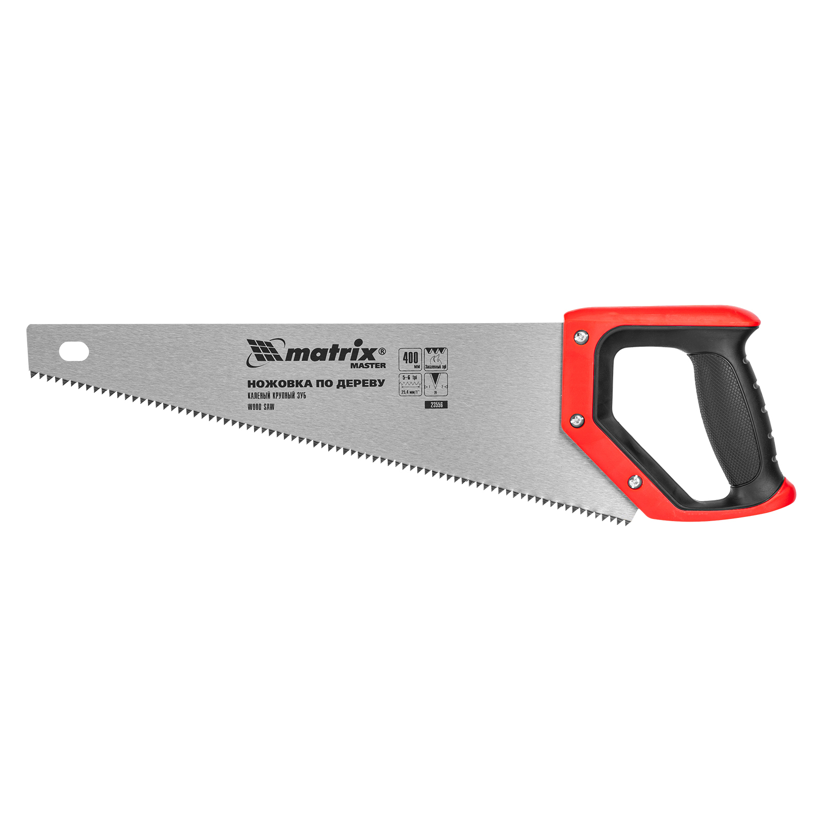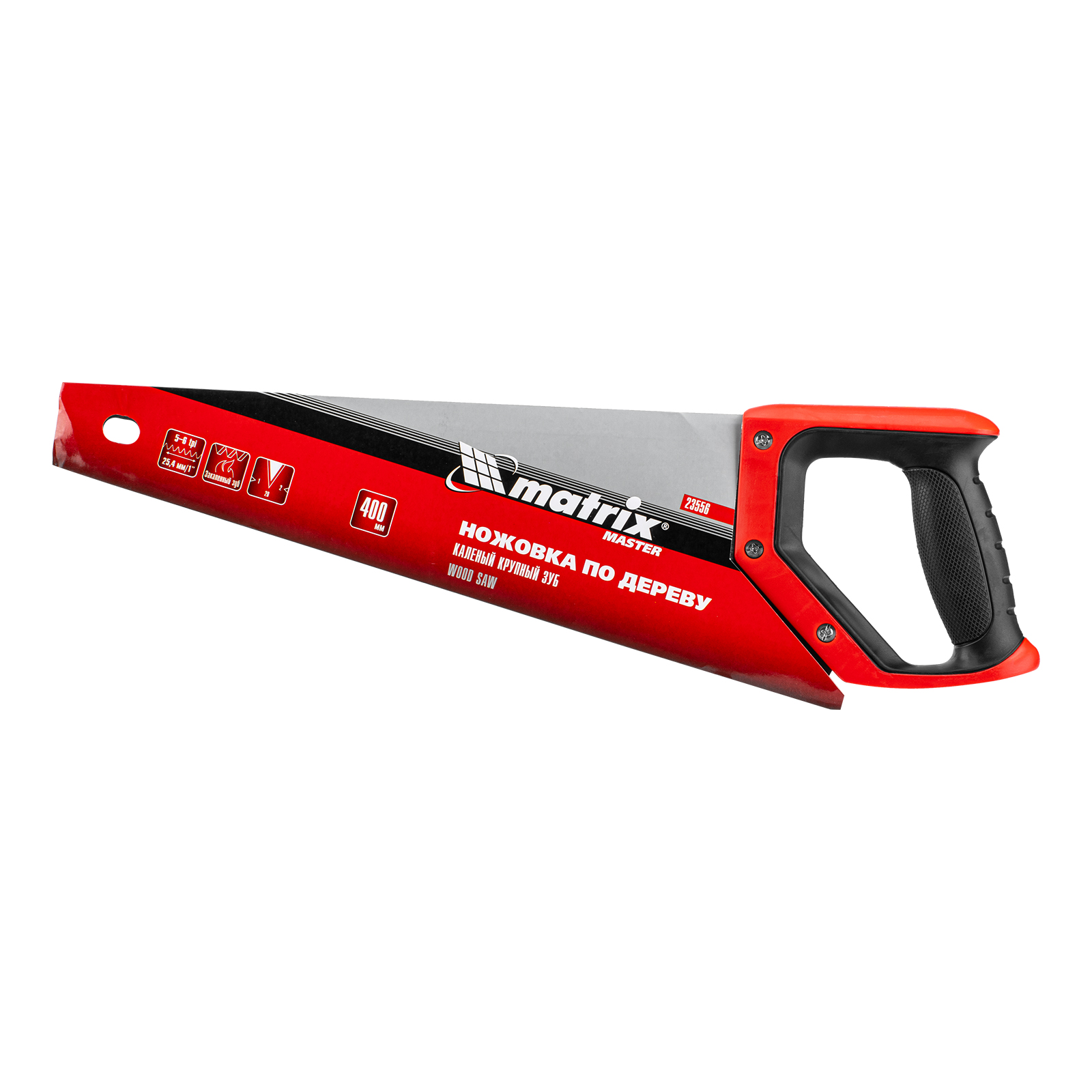 Ножовка по дереву Matrix 23556 с полотном длиной 400 мм, с крупными калеными зубьями с шагом 5-6 TPI и 2D-заточкой, с двухкомпонентной рукояткой, используется для быстрой продольной или поперечной распиловки древесины. Высокая скорость работы достигается благодаря крупным зубьям с волновой заточкой и универсальным шагом 4-5 мм. Двухгранная заточка зубьев дает возможность пилить в направлении как от себя, так и на себя, а также перетачивать режущую кромку при необходимости. Ножовка подходит для выполнения плотницких и хозяйственных работ.