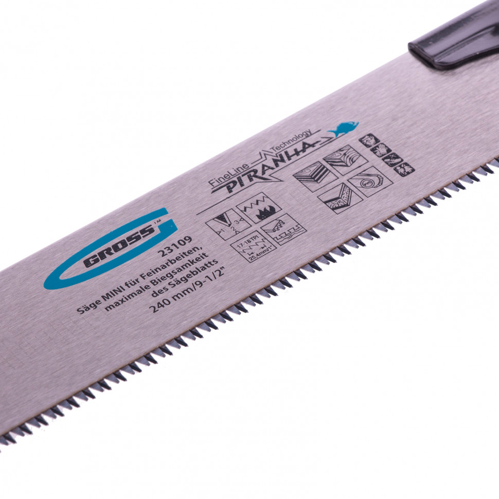 Пила Gross PIRANHA МИНИ 23109 со сменным полотном длиной 240 мм, с калеными зубьями 3D с шагом 17-18 TPI, используется для тонких работ по древесине, фанере, ДВП, ПВХ. Рабочая кромка с мелкими зубьями с шагом 17-18 TPI выполняет ровный и гладкий рез. Зубья вырезаны и одновременно заточены алмазным кругом, что обеспечивает высокую производительность инструмента. Съемное полотно при необходимости можно заменить. Инструмент применяется для проведения точных столярных работ дома или в мастерской.