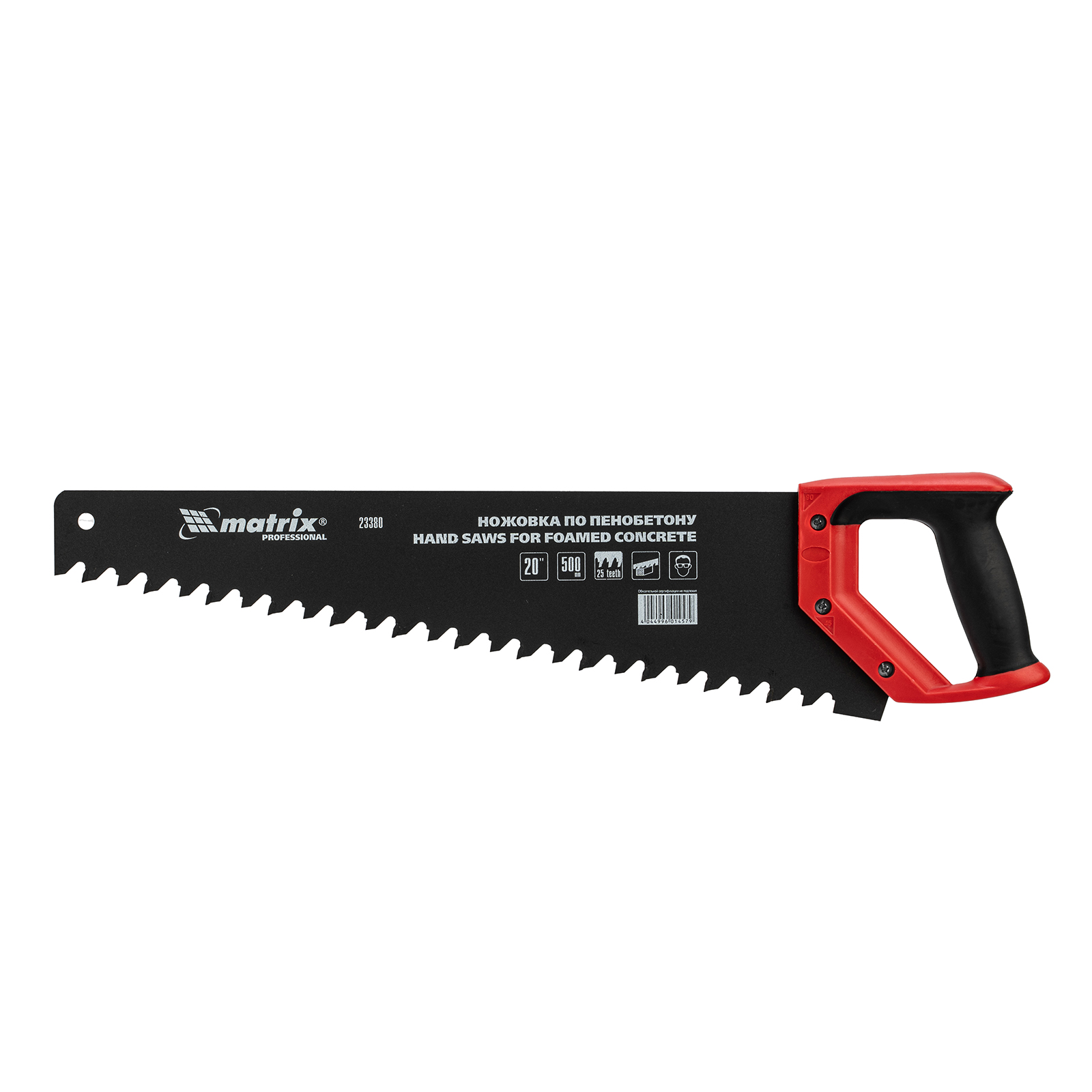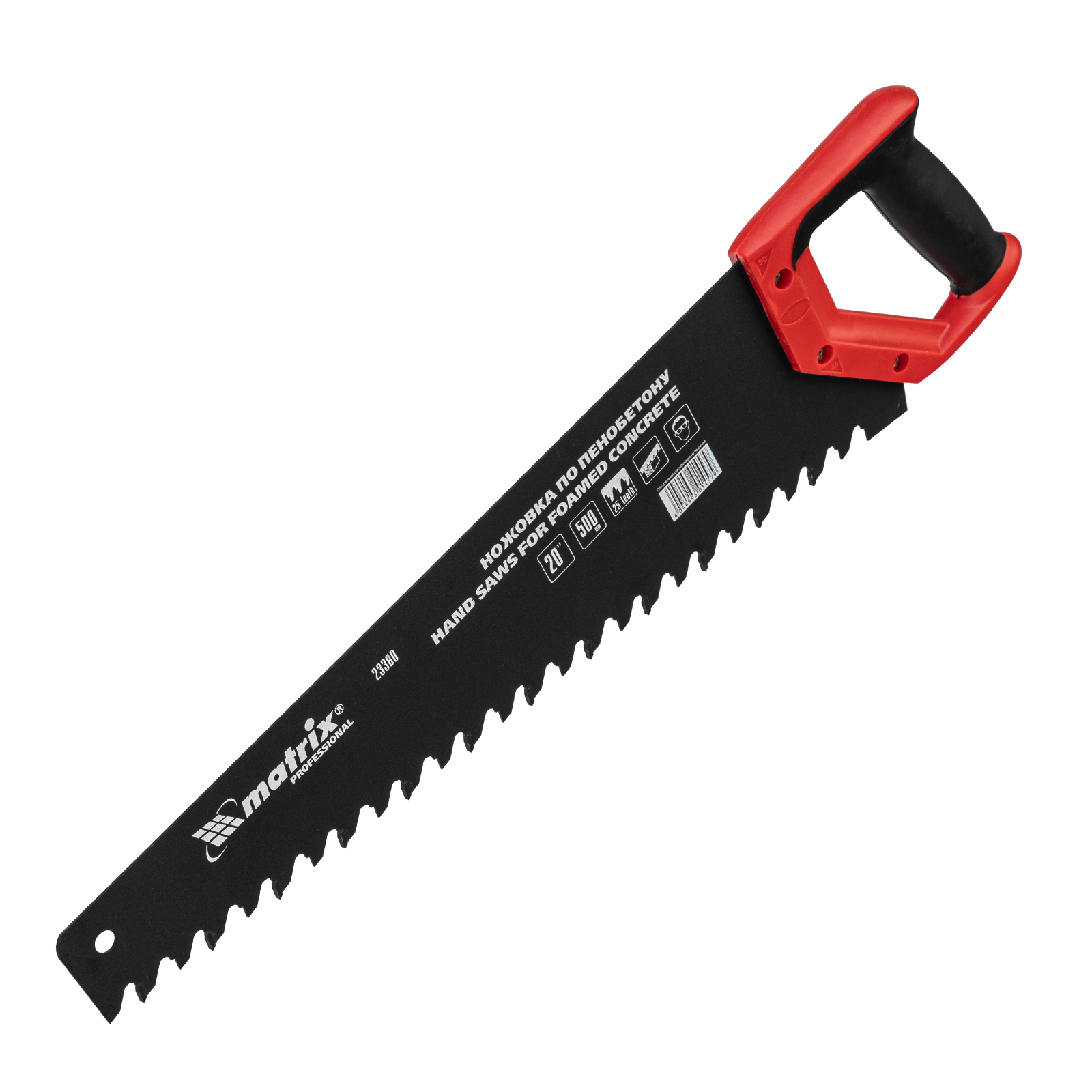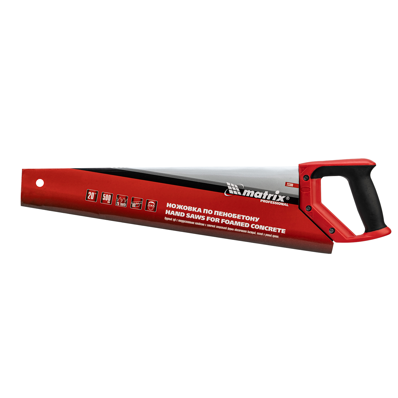 Ножовка по пенобетону Matrix 23380 с полотном длиной 500 мм, с защитным покрытием, с твердосплавными напайками на зубьях и 2-компонентной рукояткой, предназначена для распиливания пеноблоков. Зубья с шагом 38 мм имеют напайки из карбида вольфрама, заточенные под специальным углом, что обеспечивает эффективность работы с твердым материалом. Ножовка используется во время строительства различных сооружений.