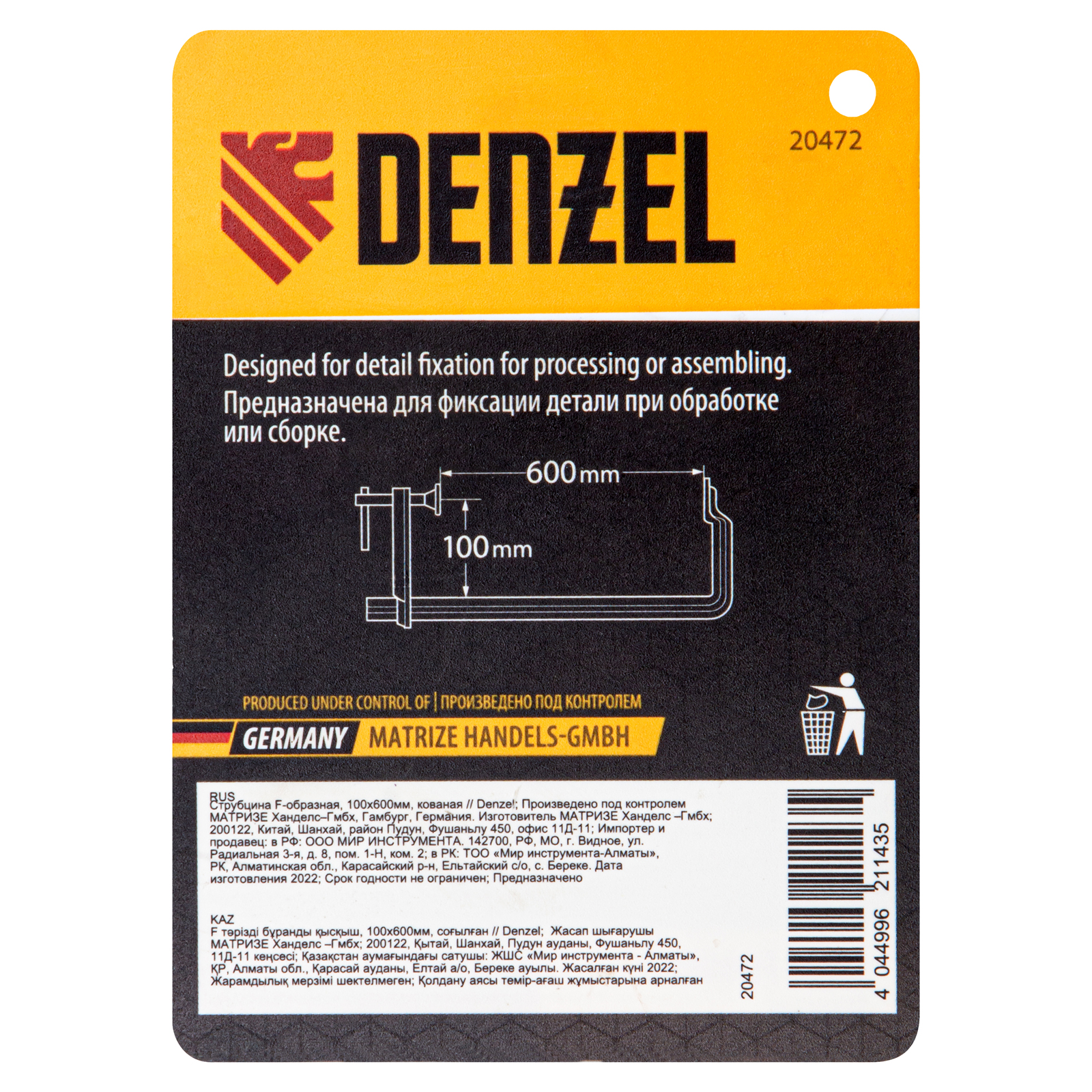 Кованая F-образная струбцина Denzel 20472 с глубиной зажима 100 мм, усиленная, предназначена для фиксации деталей шириной до 600 мм и материалов при проведении слесарных, столярных и сварочных работ. Тавровый профиль обеспечивает устойчивость конструкции к изгибу, что позволяет фиксировать детали со значительным усилием. Струбцина подходит для профессионального применения.