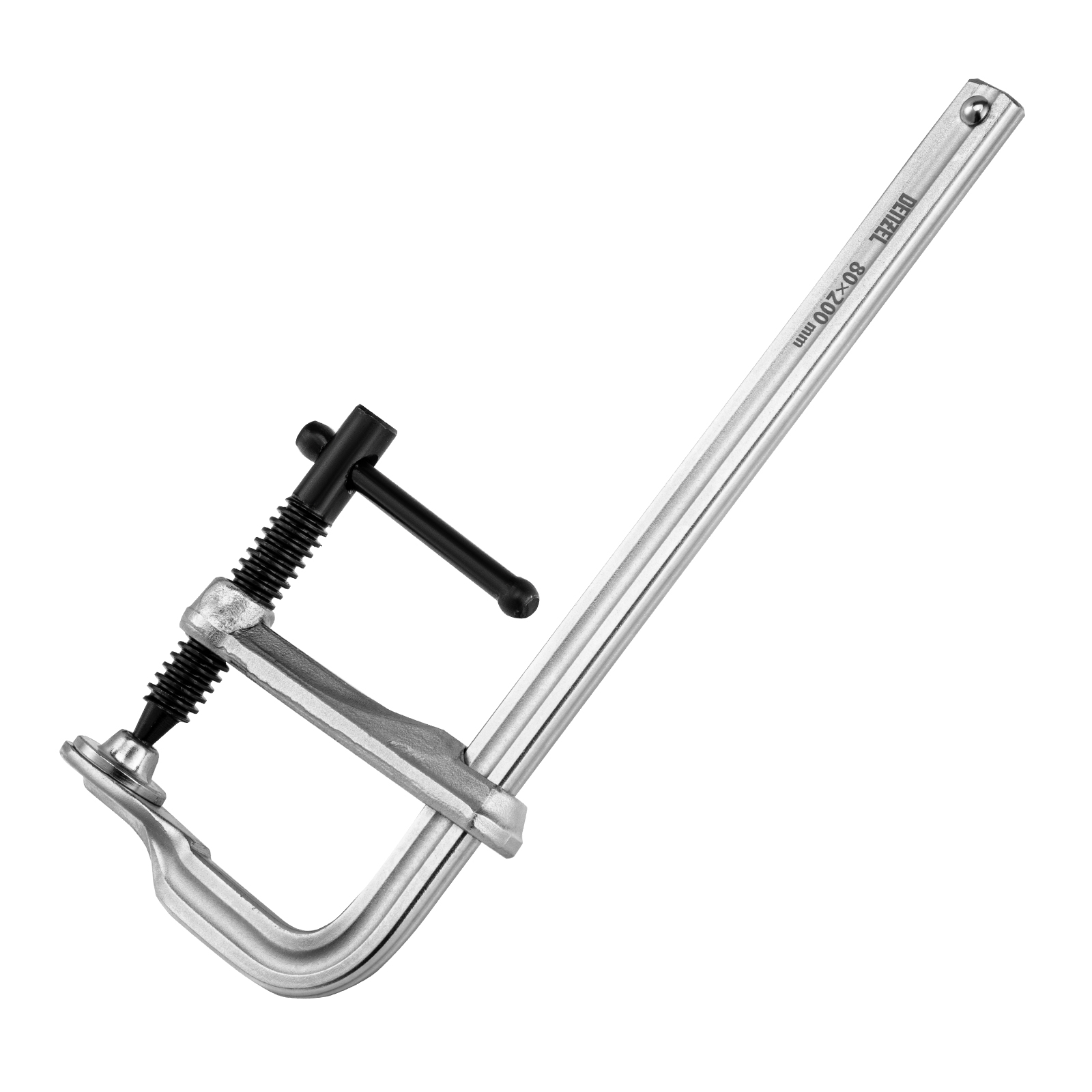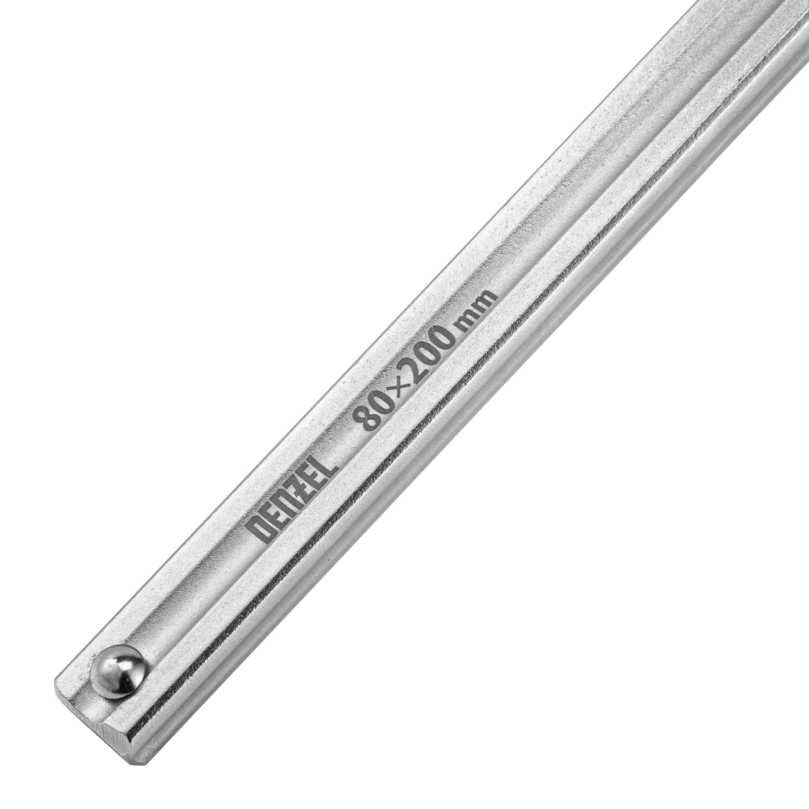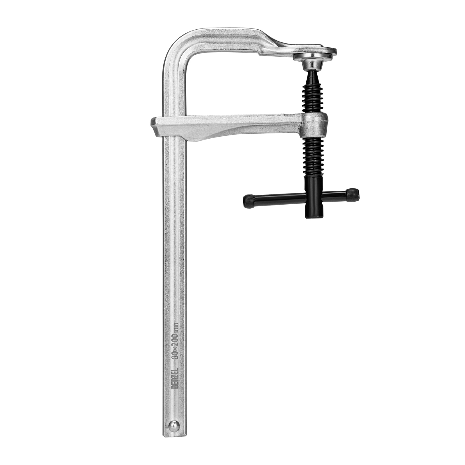 Кованая F-образная струбцина Denzel 20465 с глубиной зажима 80 мм, усиленная, предназначена для фиксации деталей шириной до 200 мм и материалов при проведении слесарных, столярных и сварочных работ. Тавровый профиль обеспечивает устойчивость конструкции к изгибу, что позволяет фиксировать детали со значительным усилием. Струбцина подходит для профессионального применения.