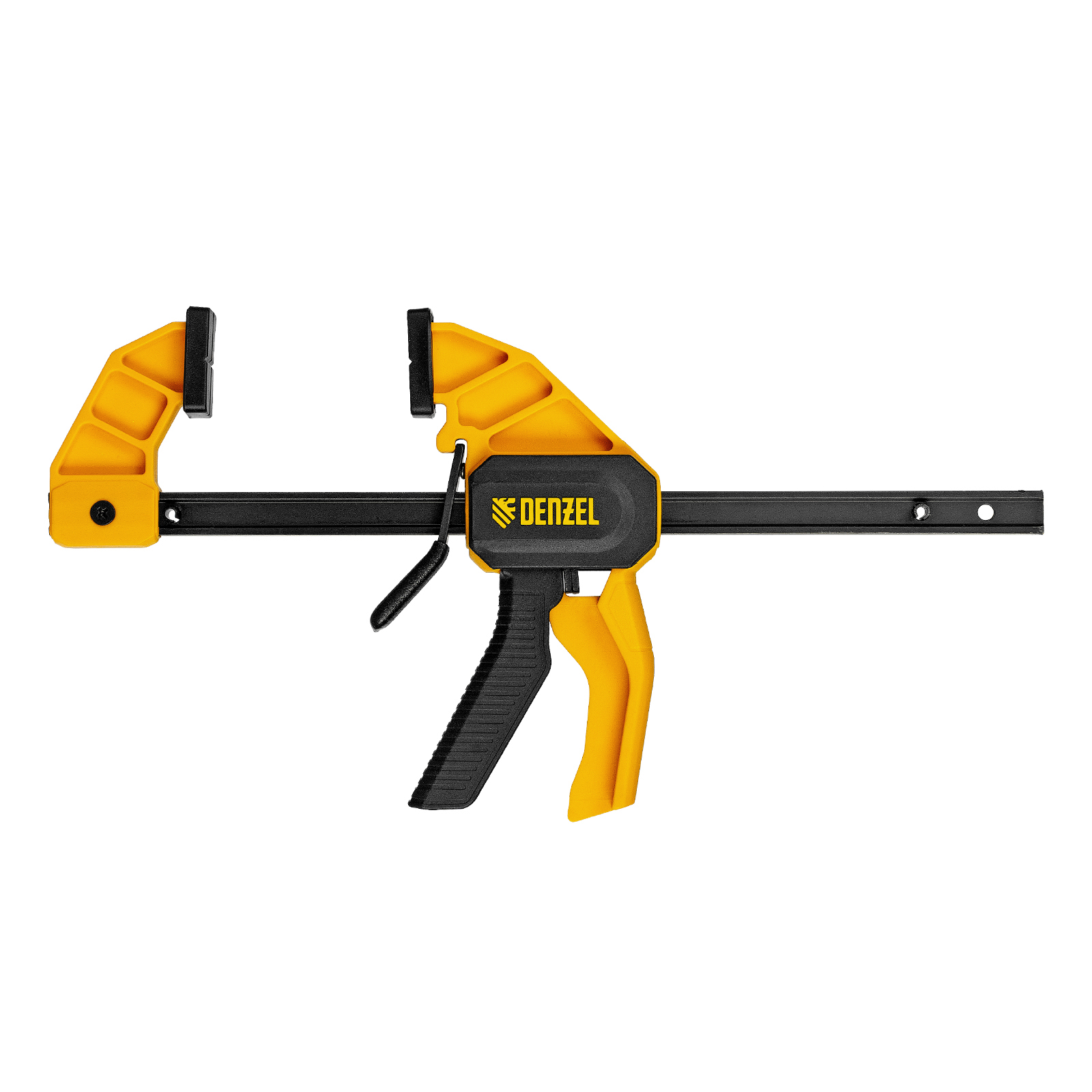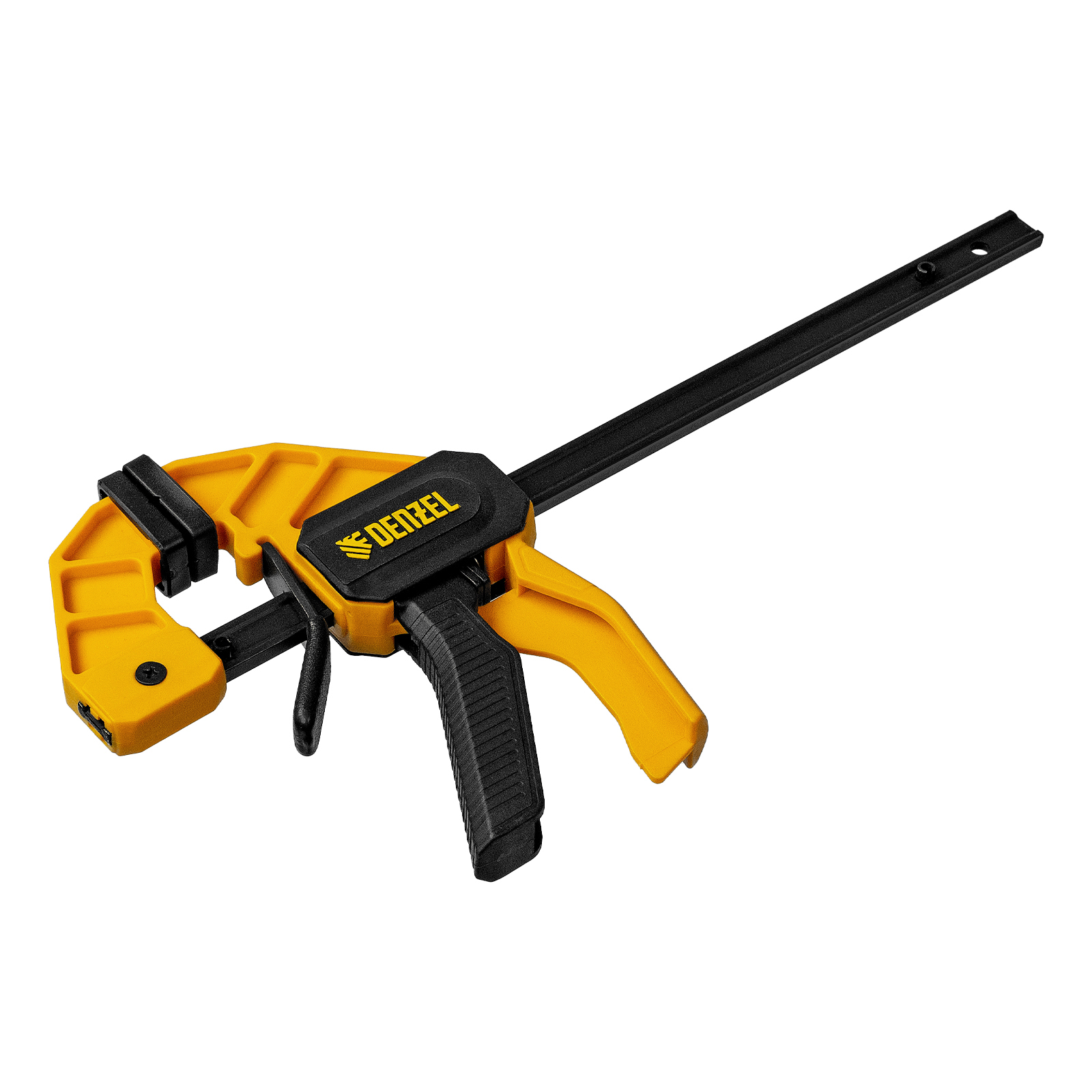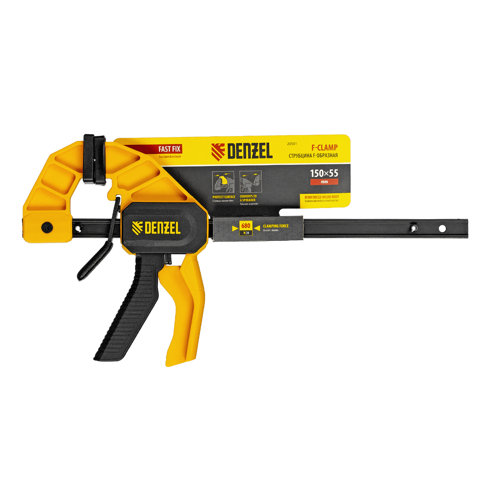 Струбцина F-образная быстрозажимная Denzel 20501 с пошаговым зажимом шириной 150 мм и глубиной 55 мм, с усиленным нейлоновым корпусом, позволяет прочно зафиксировать детали для их обработки, склеивания и выполнения других задач. Сила сжатия составляет 680 Н. Струбцина подходит для бытового и профессионального применения.
