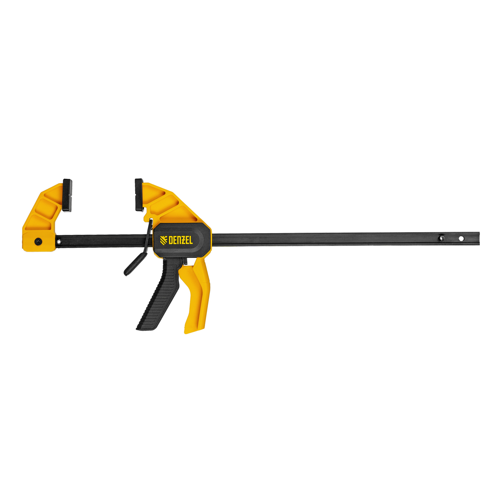- Комфортное использование — струбцина весит всего 360 г, обрезиненная кнопка фиксации обеспечивает удобный захват.