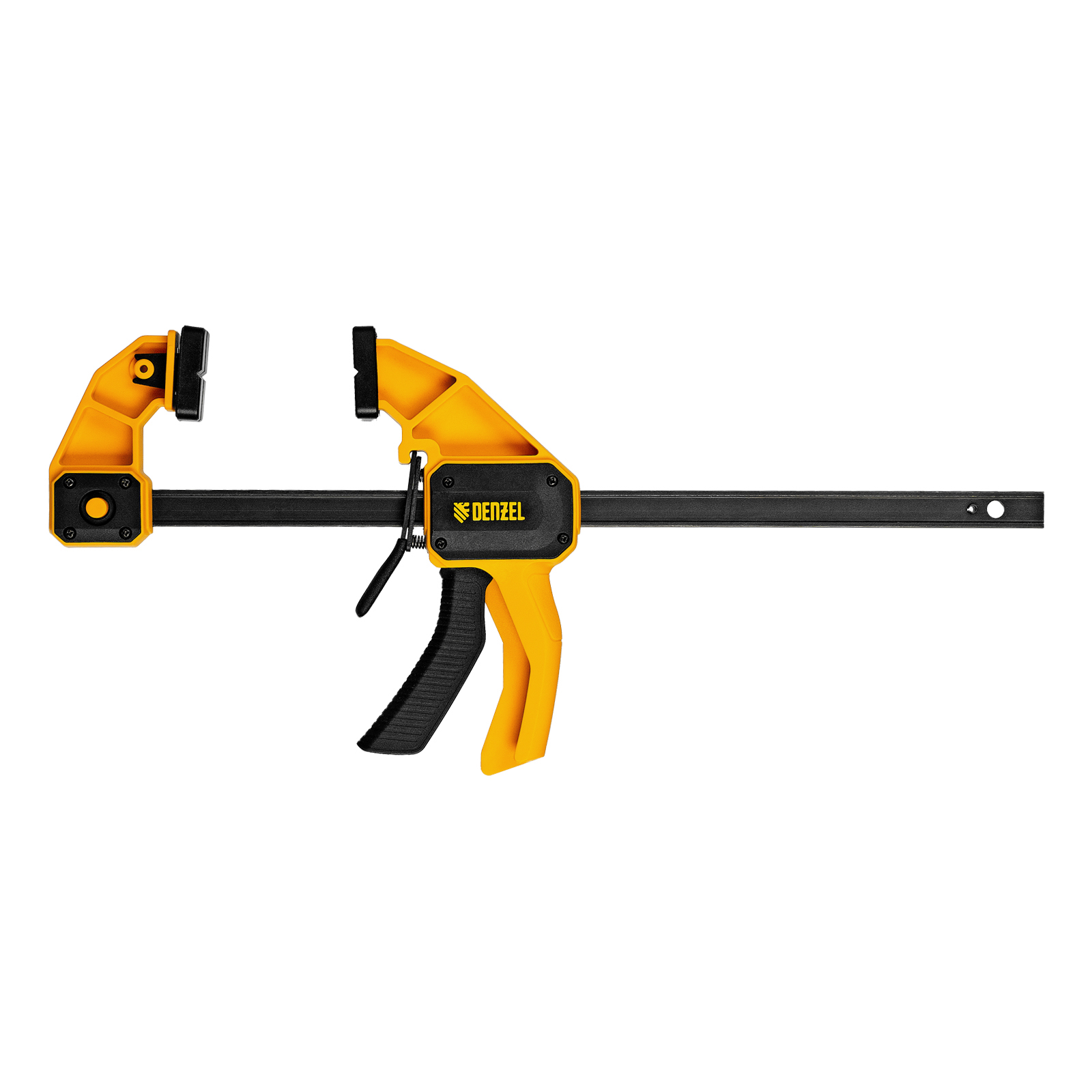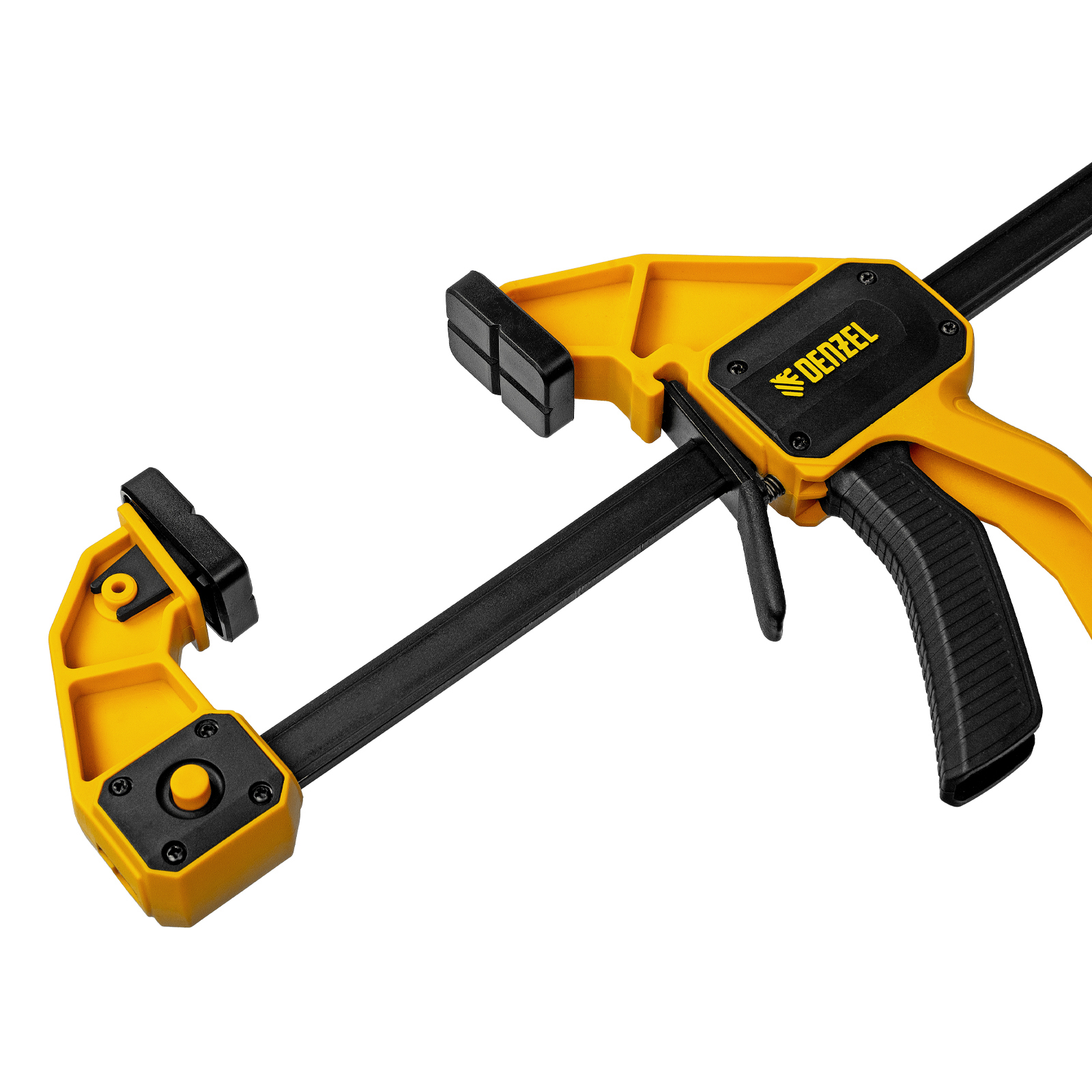 - Комфортное использование — струбцина весит всего 620 г, обрезиненная кнопка фиксации обеспечивает удобный захват.