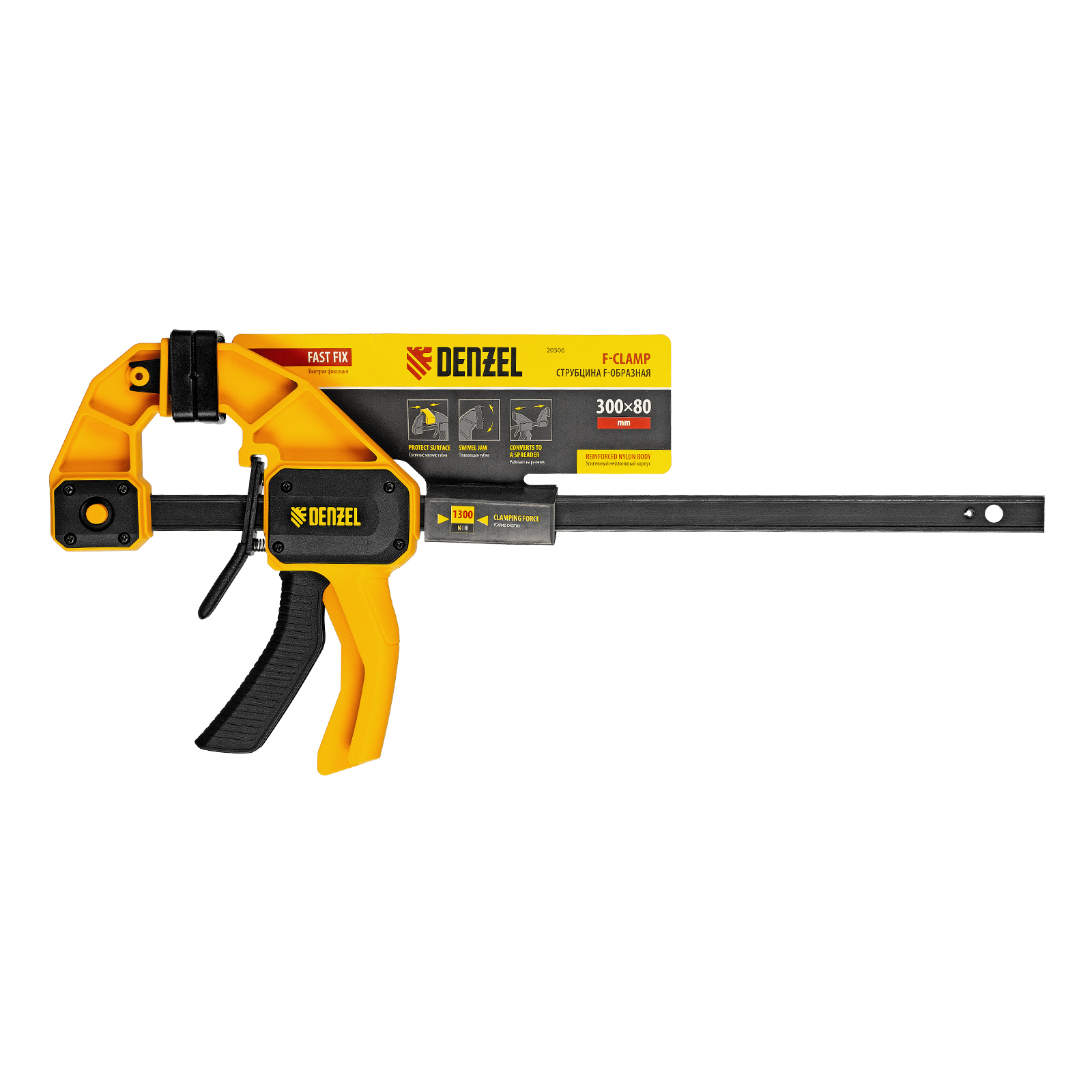 Струбцина F-образная быстрозажимная Denzel 20506 с пошаговым зажимом шириной 300 мм и глубиной 80 мм, с усиленным нейлоновым корпусом, позволяет прочно зафиксировать детали для их обработки, склеивания и выполнения других задач. Сила сжатия составляет 1300 Н. Струбцина подходит для бытового и профессионального применения.