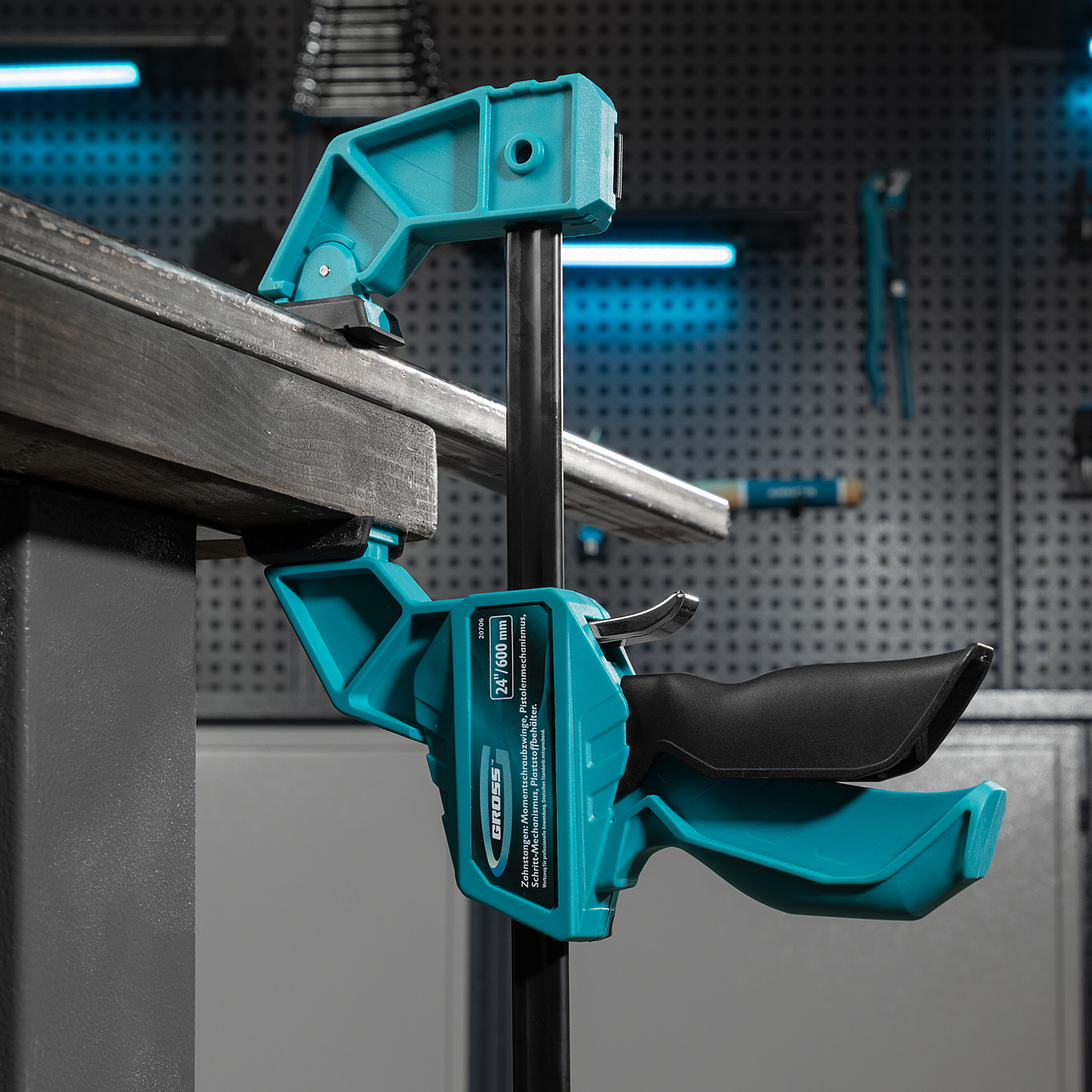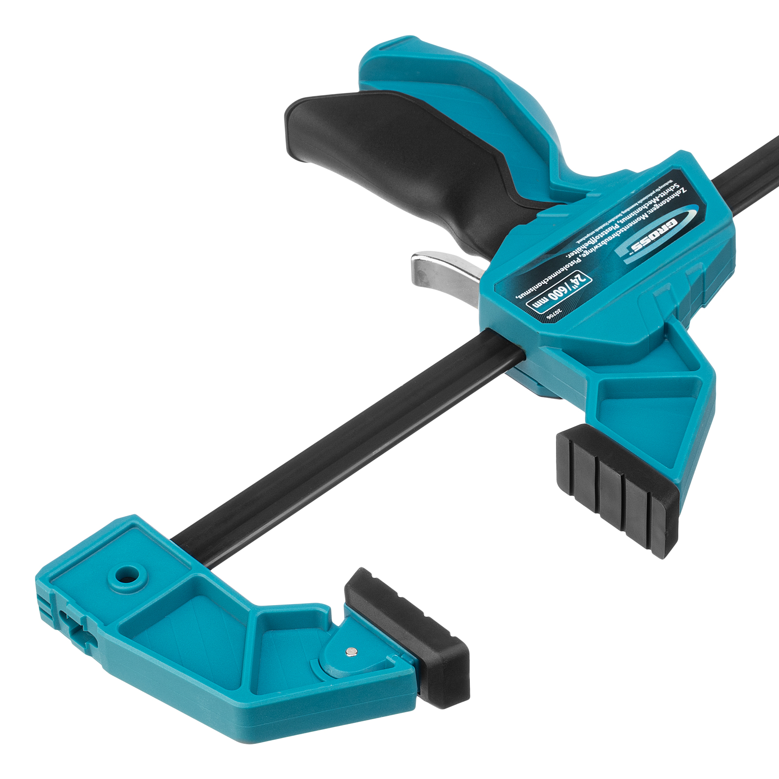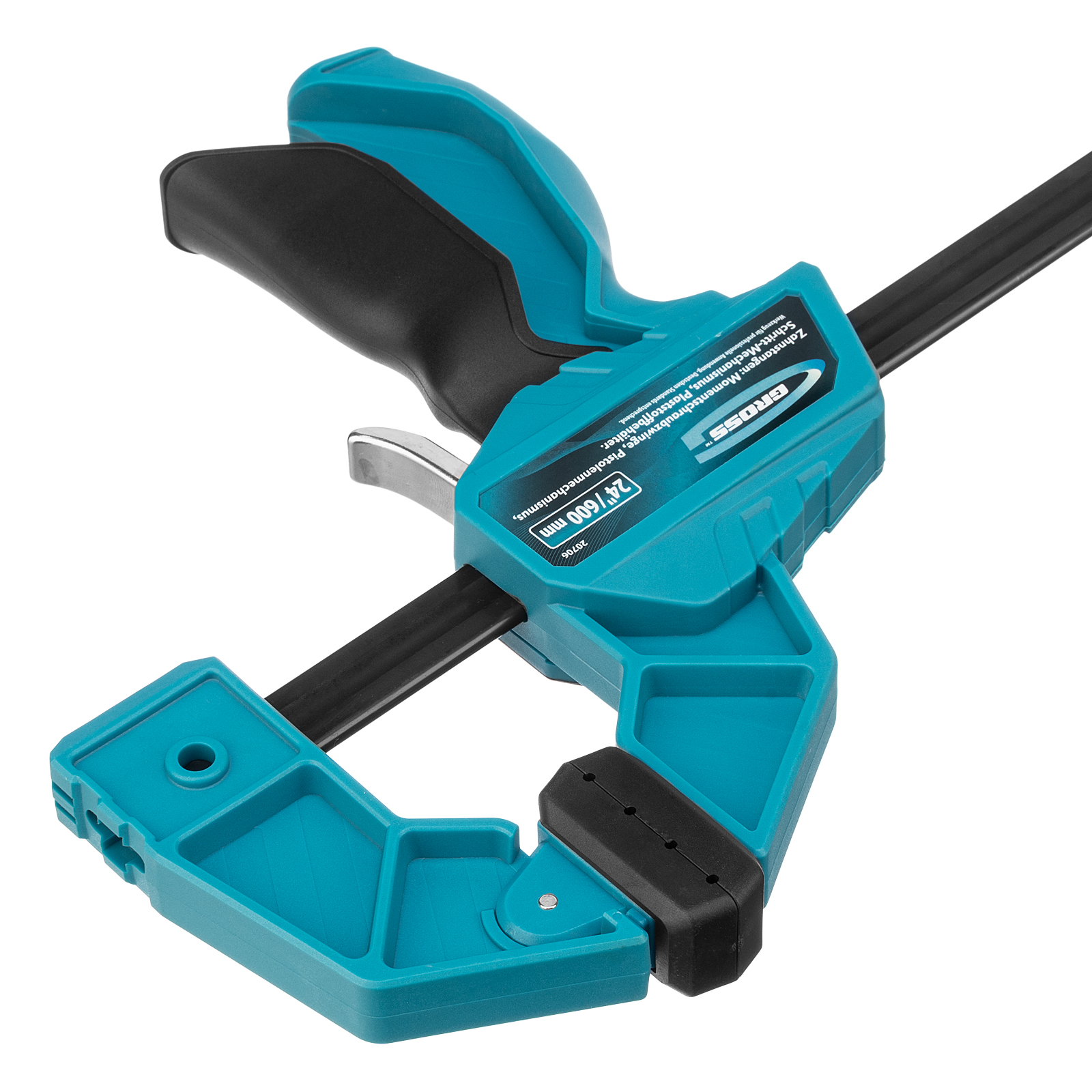 Реечная быстрозажимная струбцина Gross 20706 пистолетного типа, с пластиковым корпусом, с шириной зажима 600 мм, с пошаговым механизмом, используется для зажимания заготовок при выполнении столярных или монтажных работ. Удобна для фиксации деревянных деталей, т. к. пластиковые накладки на губках не повреждают их поверхность при сжатии. Подвижная губка пошагово перемещается по рейке, постепенно зажимая обрабатываемый предмет. Курковый фиксатор удерживает ее в заданном положении. Инструмент рекомендован для профессионального использования.