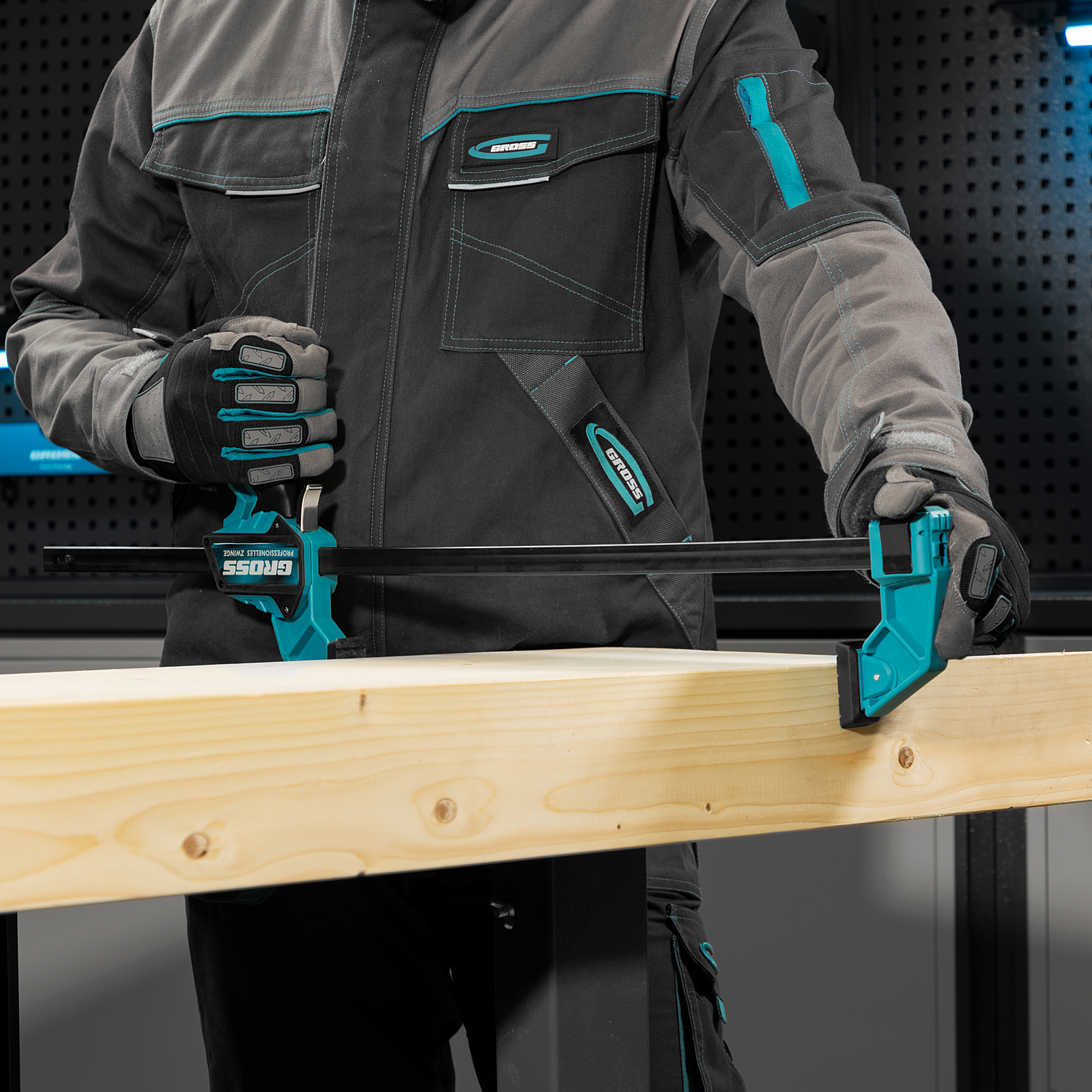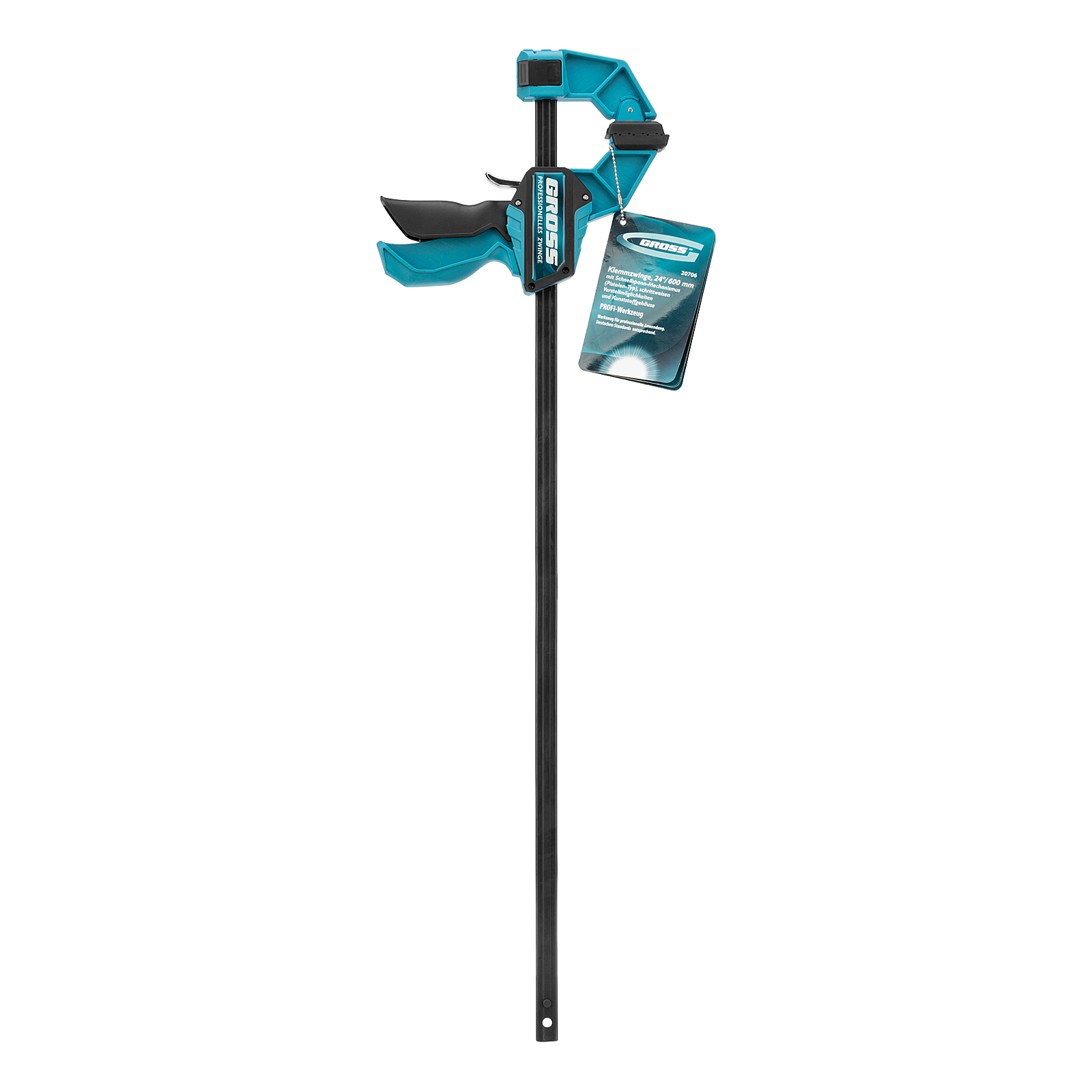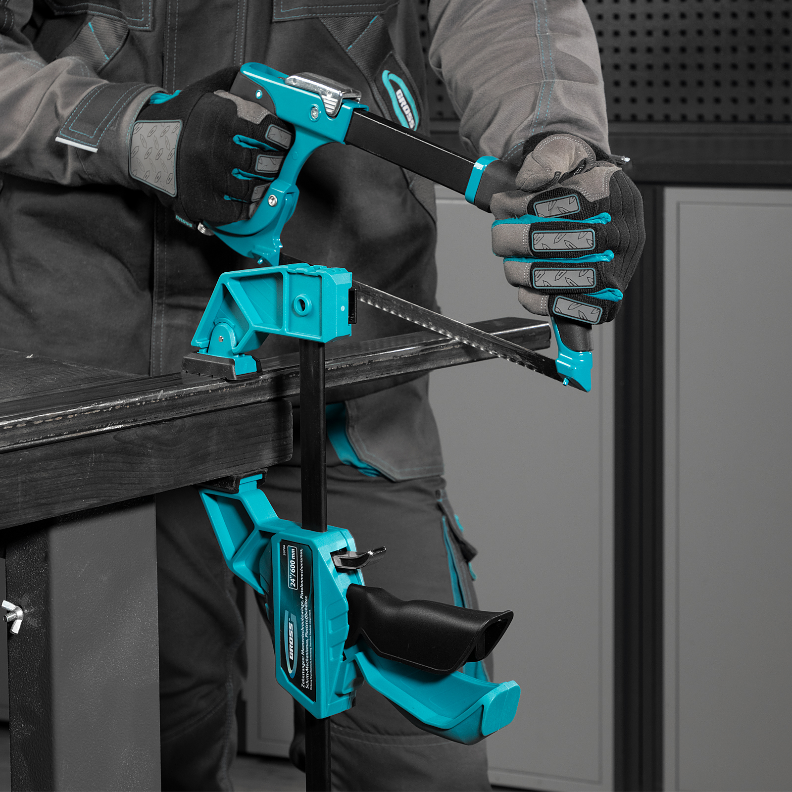 Реечная быстрозажимная струбцина Gross 20706 пистолетного типа, с пластиковым корпусом, с шириной зажима 600 мм, с пошаговым механизмом, используется для зажимания заготовок при выполнении столярных или монтажных работ. Удобна для фиксации деревянных деталей, т. к. пластиковые накладки на губках не повреждают их поверхность при сжатии. Подвижная губка пошагово перемещается по рейке, постепенно зажимая обрабатываемый предмет. Курковый фиксатор удерживает ее в заданном положении. Инструмент рекомендован для профессионального использования.