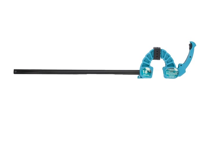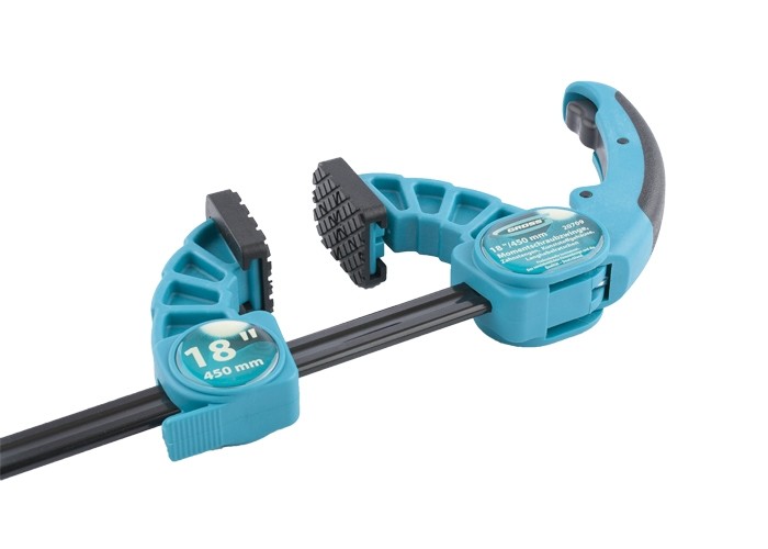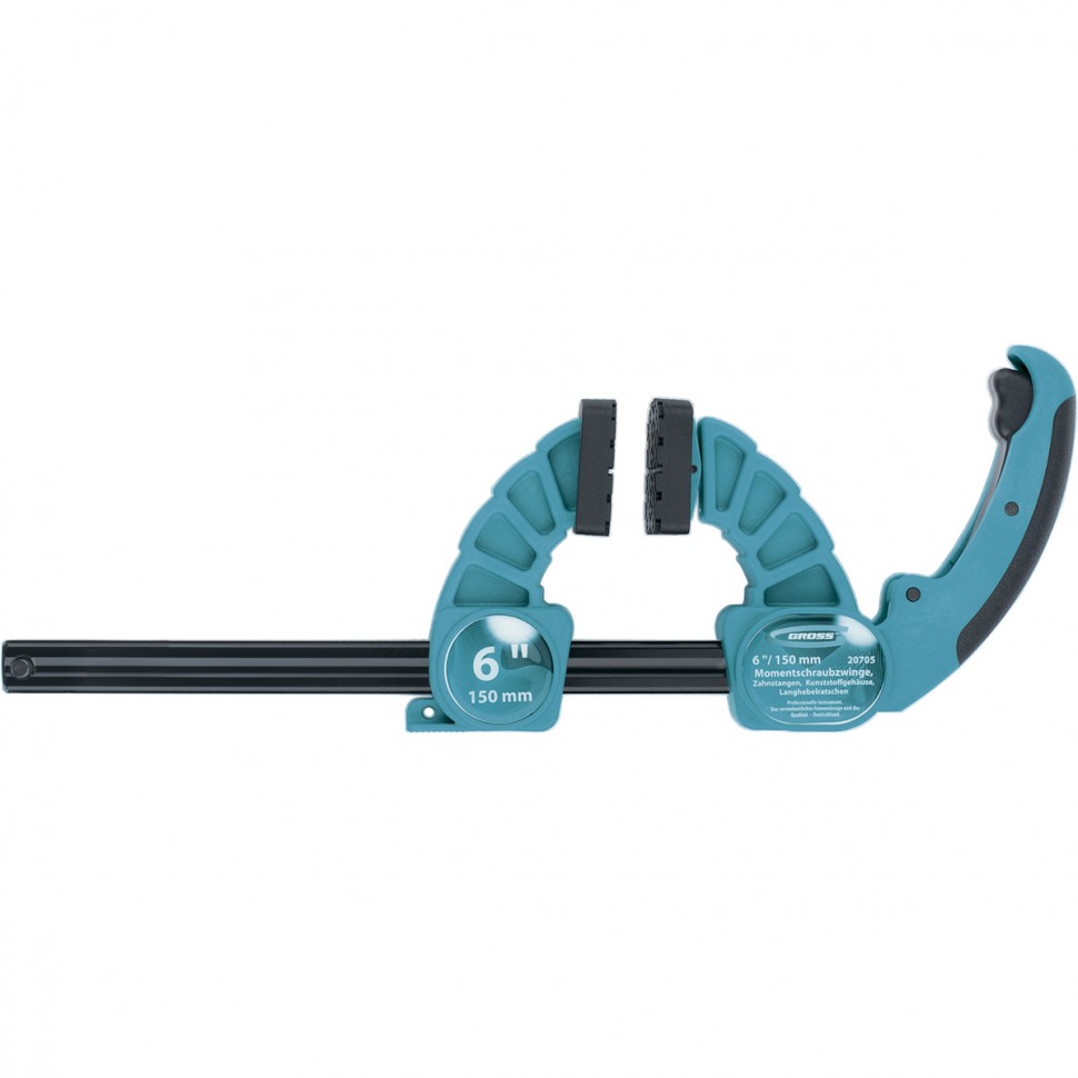 Реечная быстрозажимная струбцина Gross 20709, с пластиковым корпусом, с рычажным храповым механизмом, служит для фиксирования деталей и конструкций толщиной до 18 дюймов / 450 мм. Губки подводят вплотную к детали, а храповый механизм с рычагом позволяет произвести окончательную фиксацию, максимально используя мускульную силу. Струбцина используется для выполнения профессиональных столярных и слесарных работ.