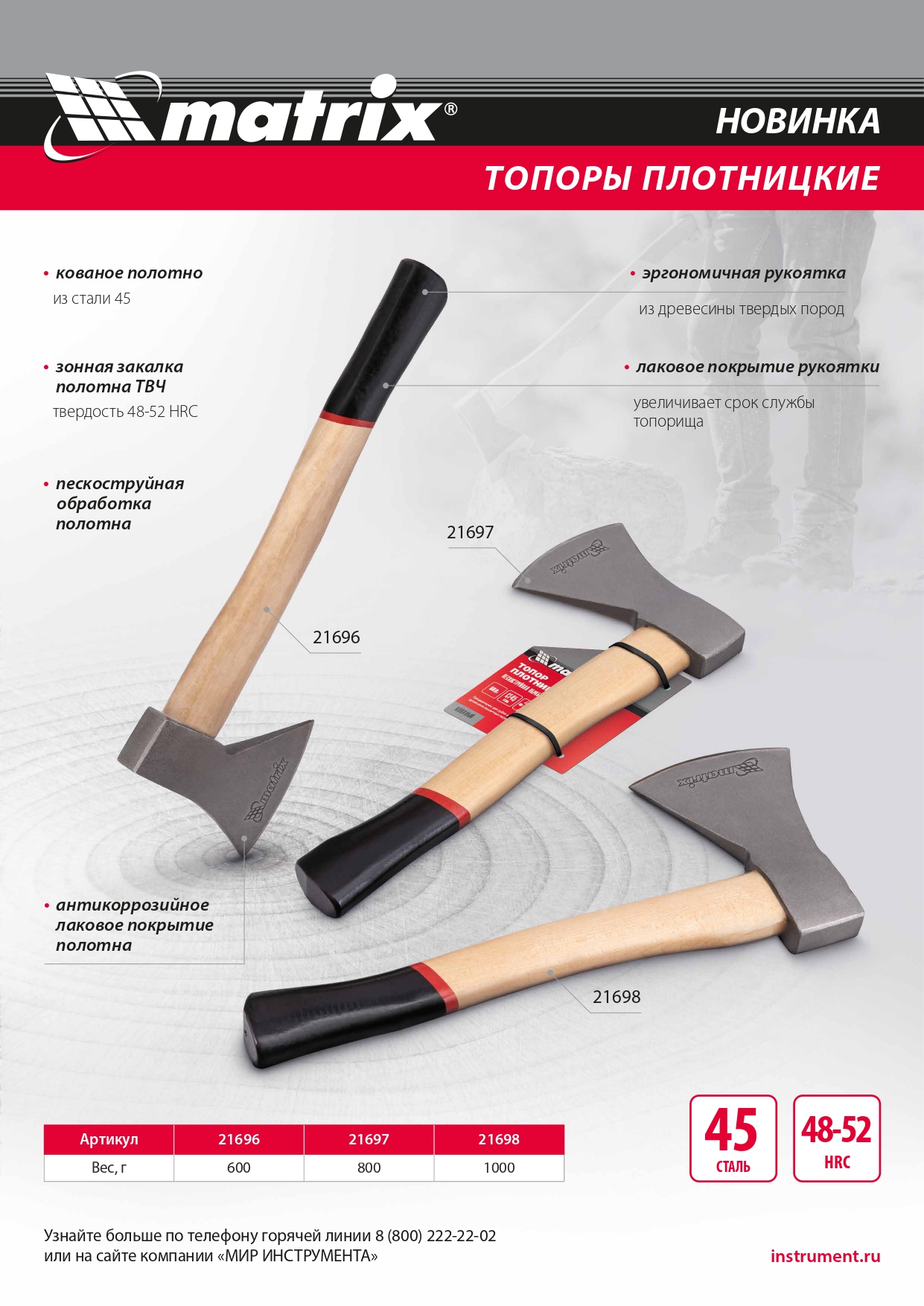 Кованый плотницкий топор Matrix 21697 с весом рабочей части 800 г имеет эргономичную деревянную рукоятку и пескоструйную обработку полотна. Топор используется при рубке и тесании древесины любых видов пород.