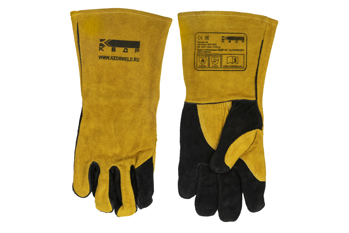 Краги сварочные КЕДP КС-16 КОМФОРТ (M), желто-черные обеспечивают максимальный комфорт и надежную защиту от брызг и ожогов.