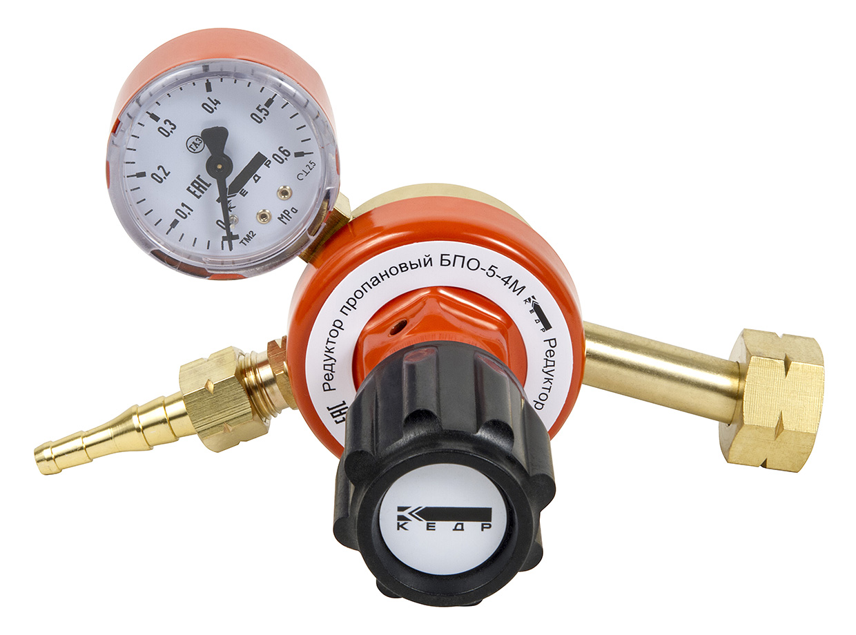 Редуктор пропановый КЕДР БПО-5-4М (8012031) предназначен для понижения давления газа, поступающего из баллона, и автоматического поддержания заданного рабочего давления постоянным при газопламенной обработке.